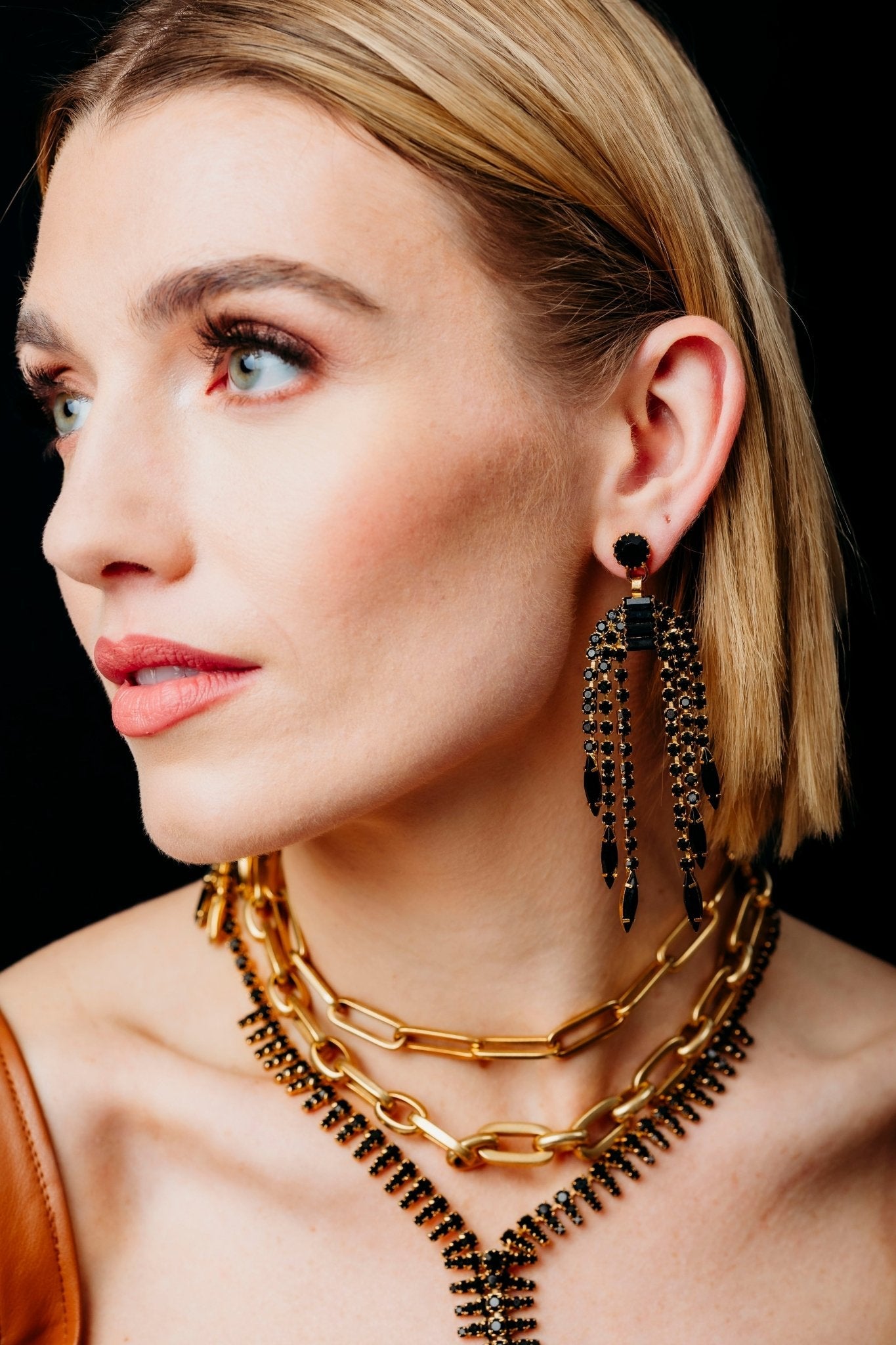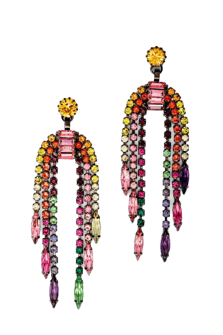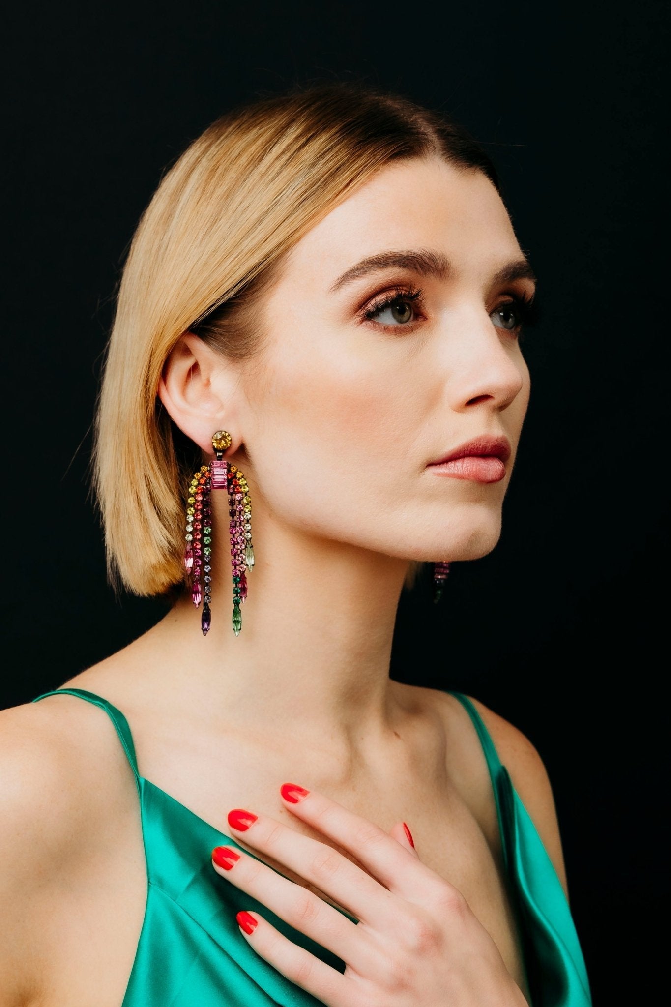 These Meredith Earrings by Elizabeth Cole bring a modern twist to the classic U-shape with an eye-catching cascade of marquis and baguette stones in rainbow or jet hues. A bold and effortlessly stylish accessory.