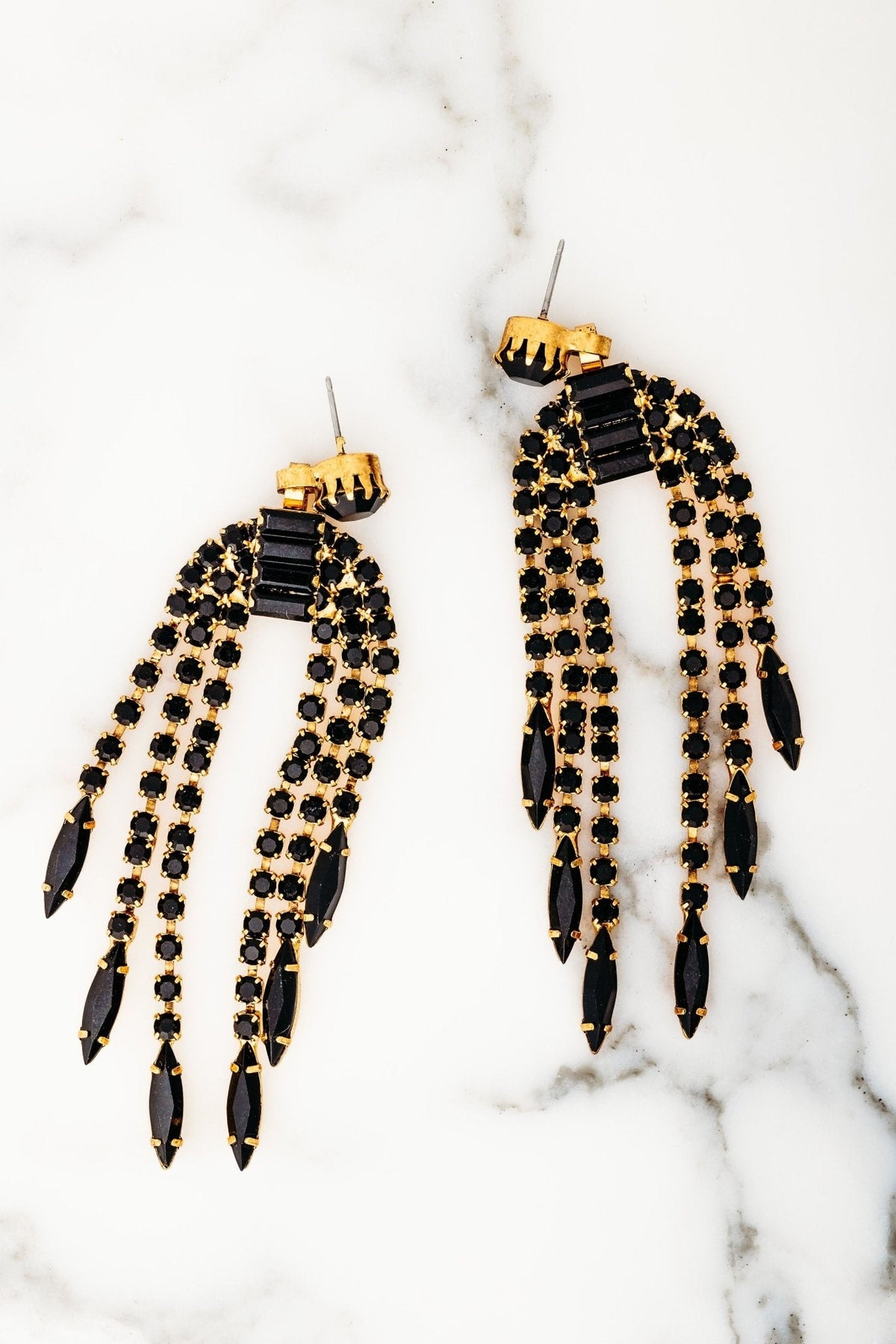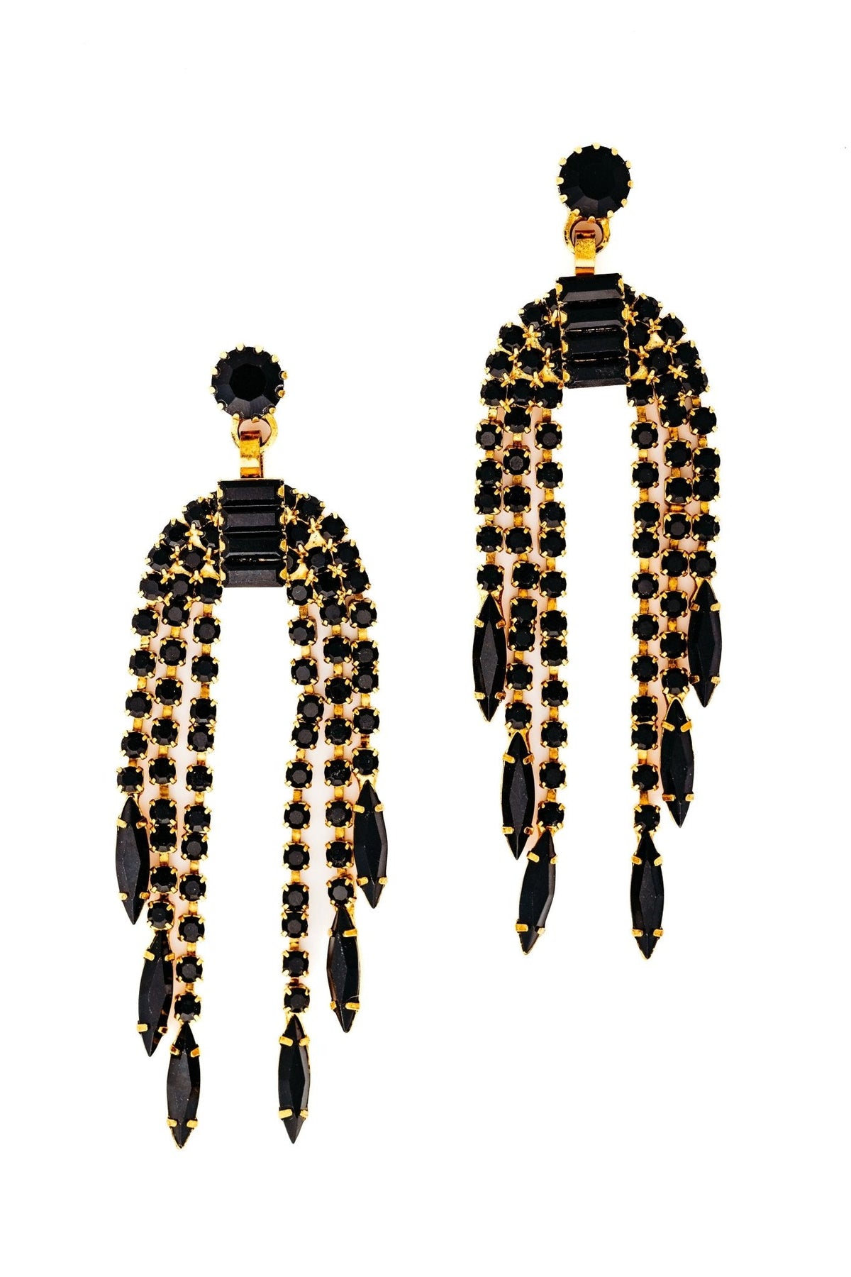 Swarovski crystals, Czech crystals, 24kt gold or hematite plate. Length: 3.25in (8.25cm), Weight: 15.1g. Post closure. Proudly made in the USA.