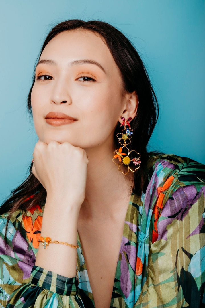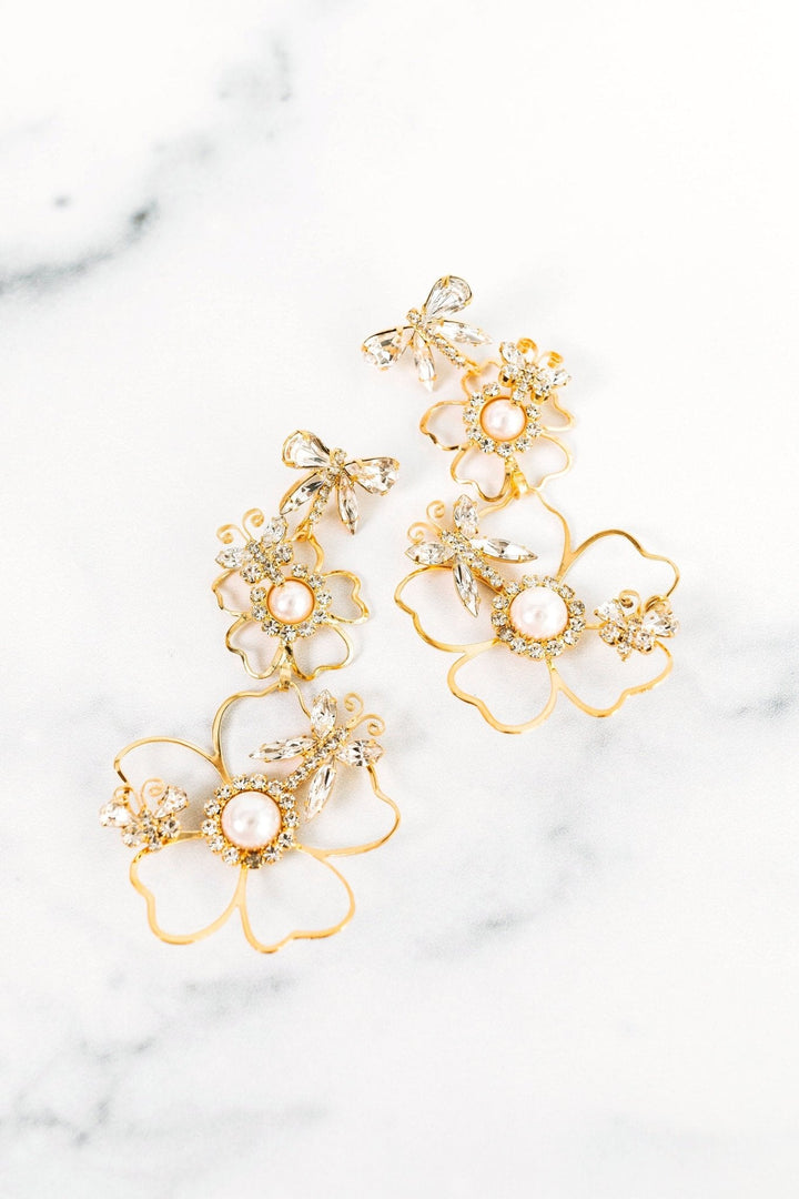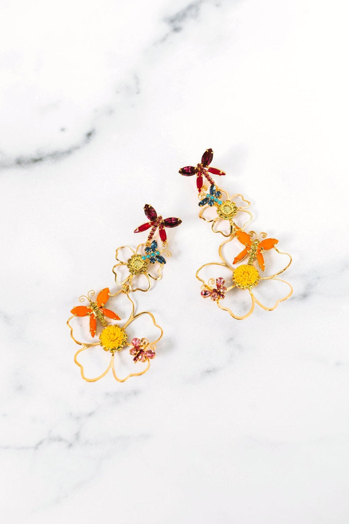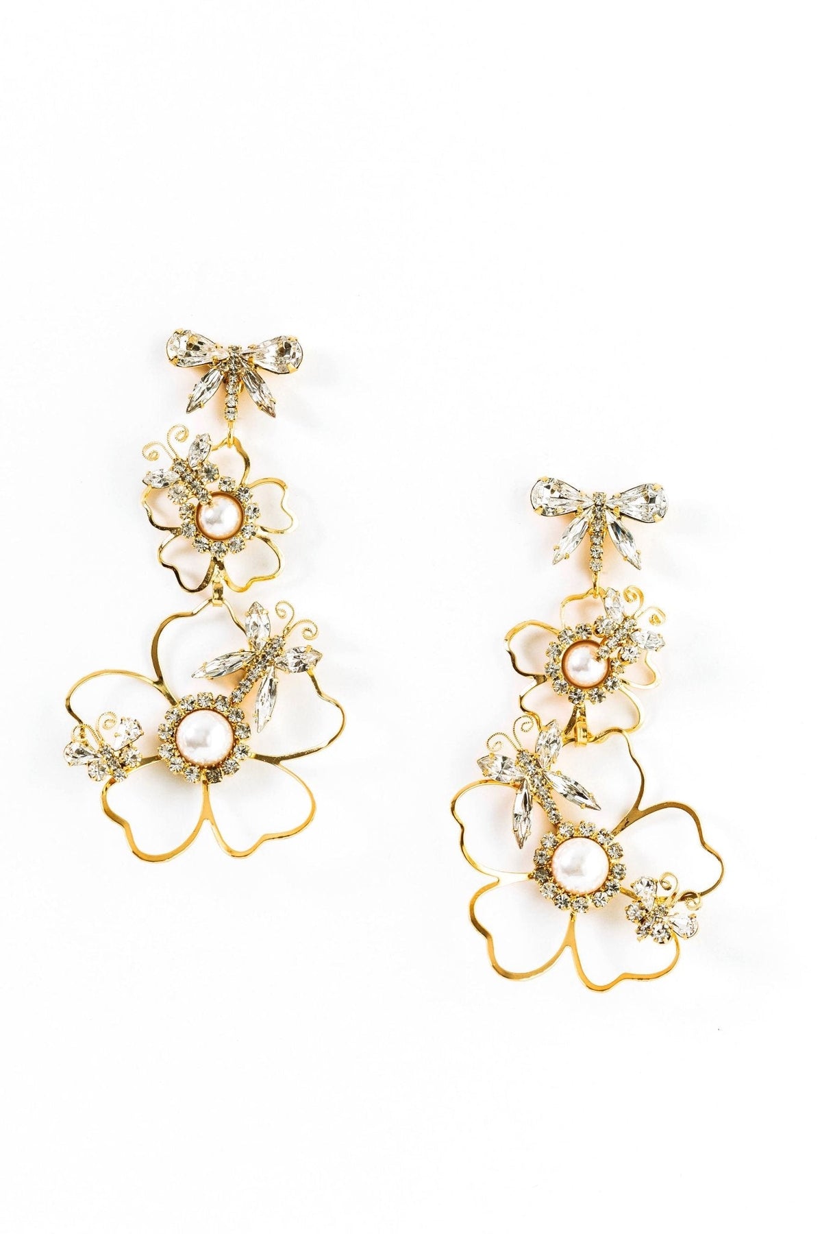 These Myles Earrings by Elizabeth Cole feature delicate golden flowers explored by crystal butterflies, creating an eye-catching design perfect for adding a whimsical touch to your look.