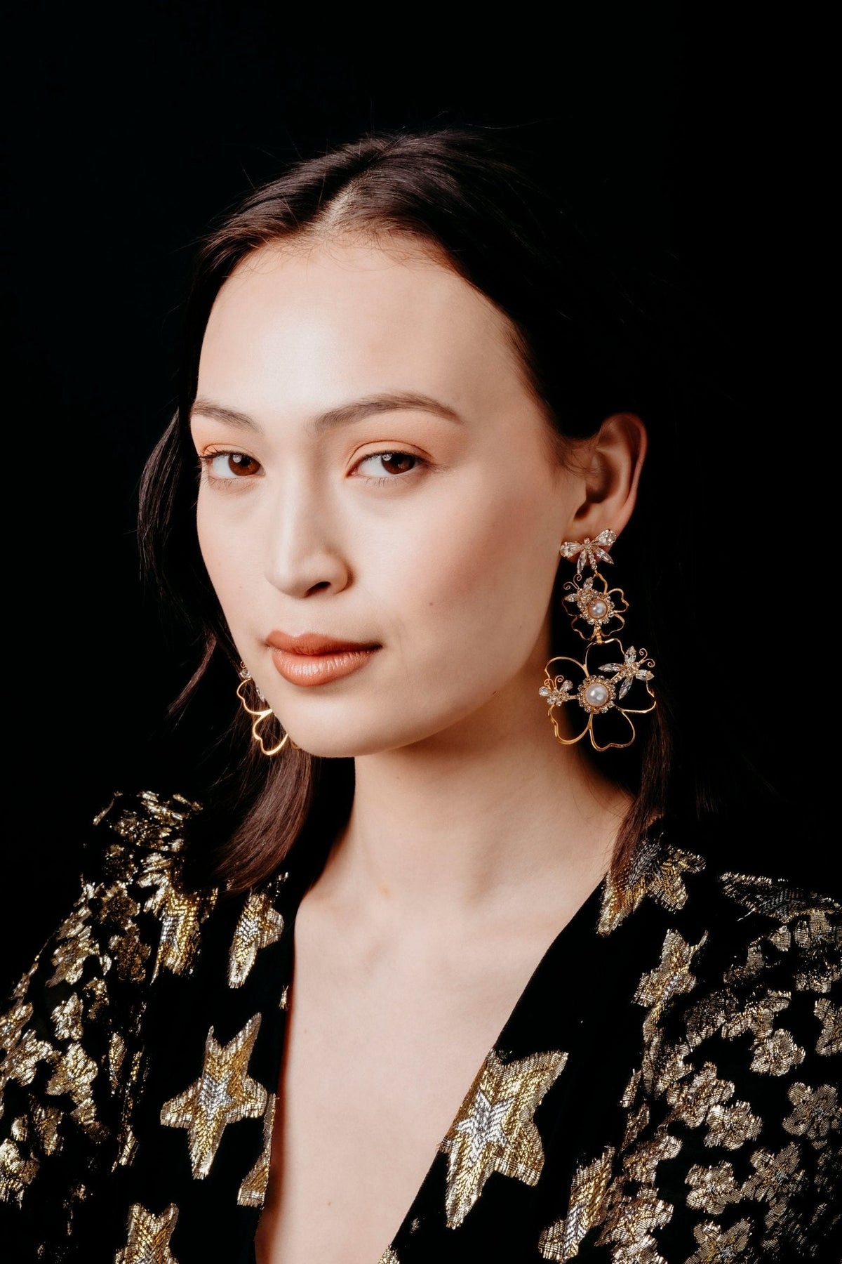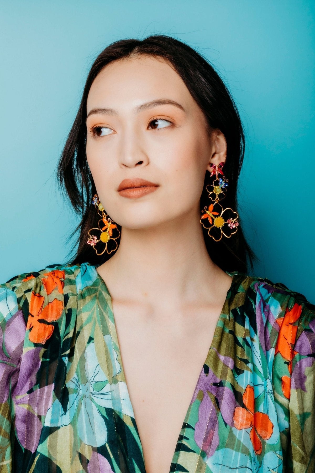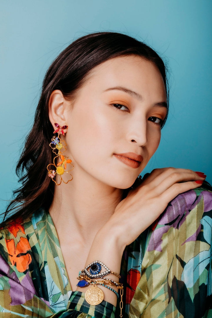 These Myles Earrings by Elizabeth Cole feature delicate golden flowers explored by crystal butterflies, creating an eye-catching design perfect for adding a whimsical touch to your look.