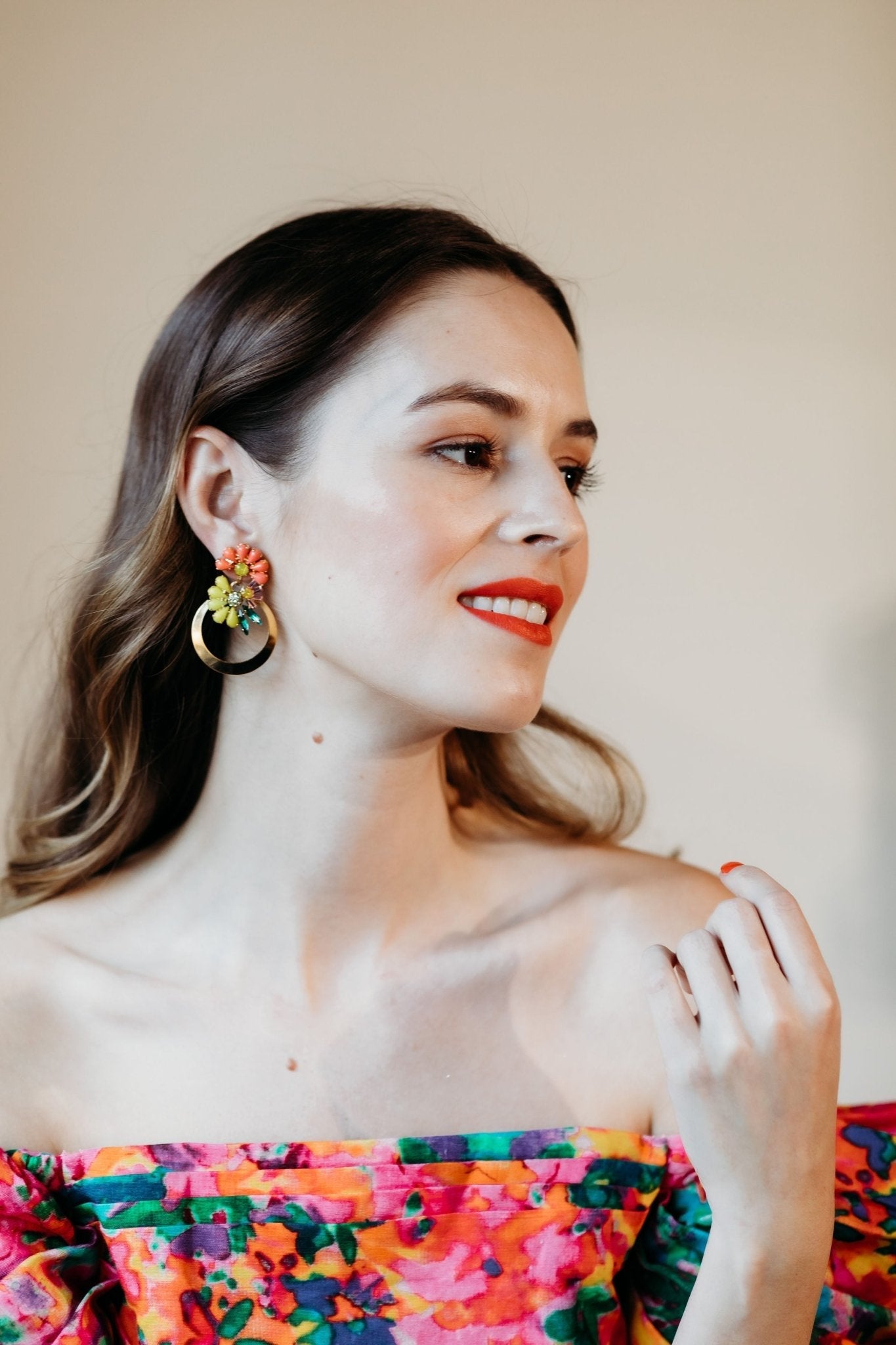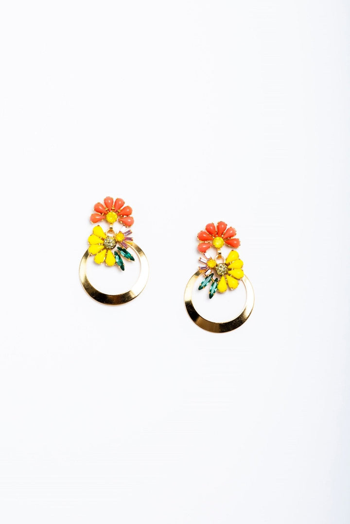 These Nicolette Earrings by Elizabeth Cole bring a dazzling touch with radiant coral and yellow flowers, complemented by vivid emerald green leaves and a timeless gold hoop. A vibrant, elegant accessory to elevate your look.