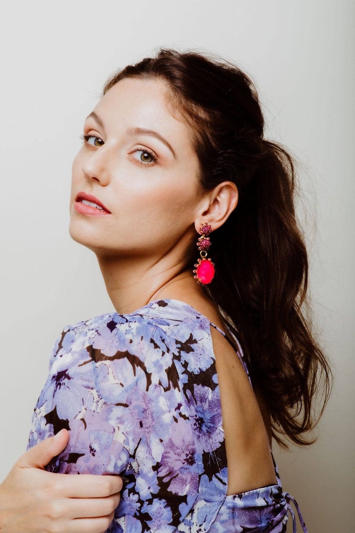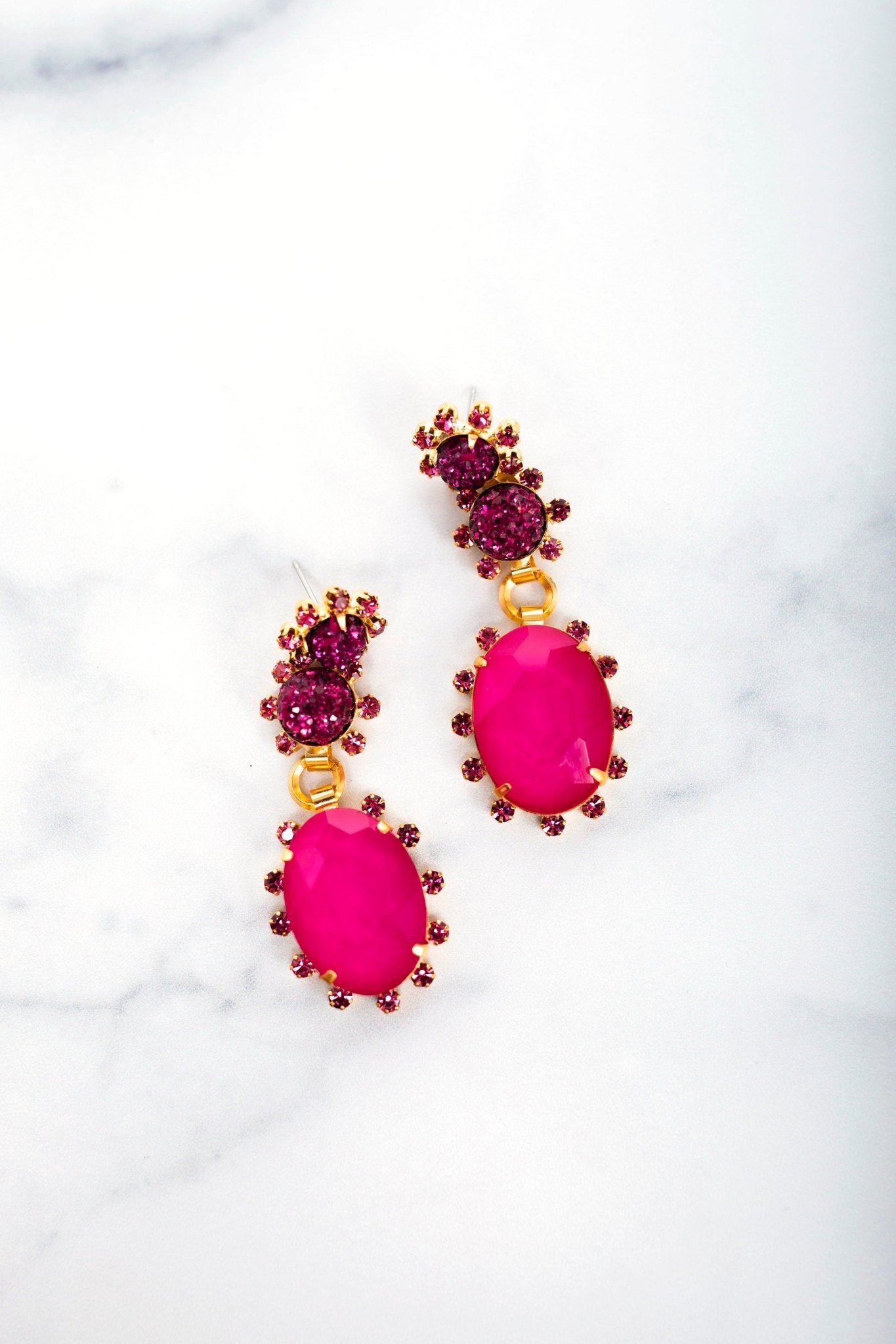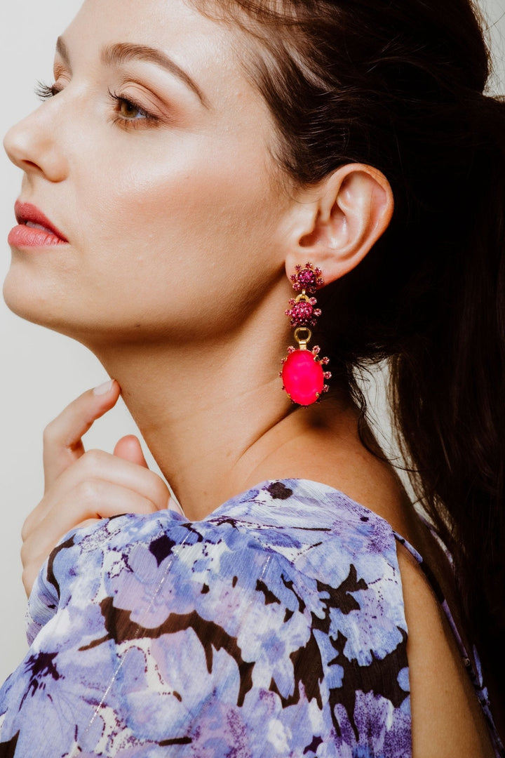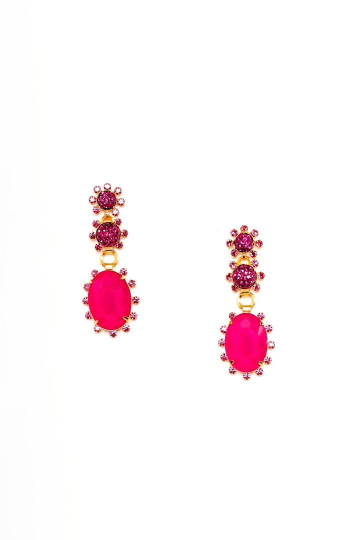 These Olivia Earrings by Elizabeth Cole are a classic silhouette, featuring graduated circles and ovals flanked by glittering crystal details. Available in vibrant pink and blue.