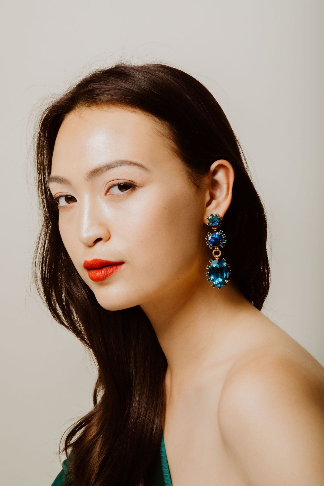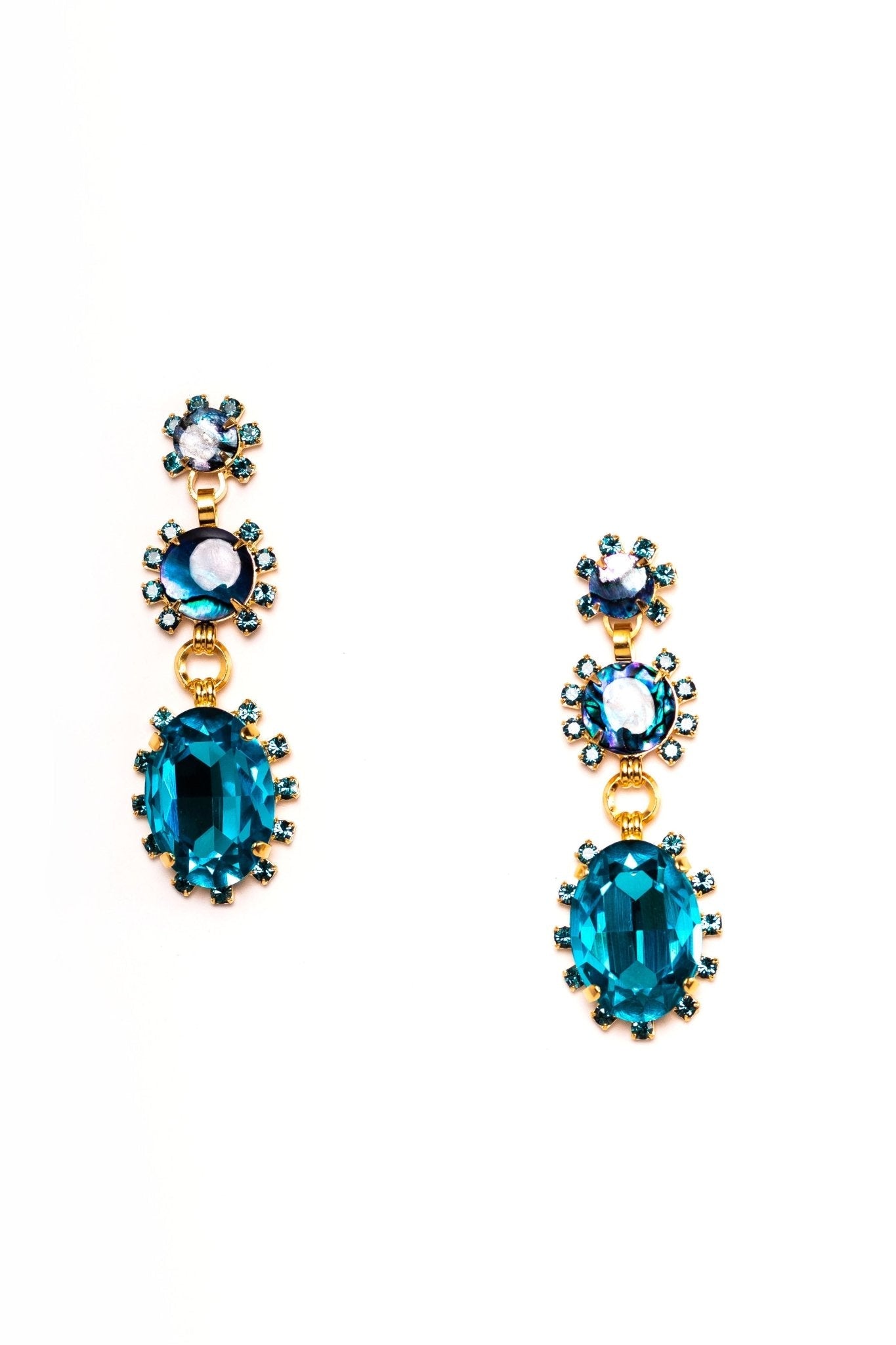 Swarovski crystals, glass stones, 24kt gold plate. Length: 2.75in (6.9cm), Weight: 13.2g. Post closure. Proudly made in the USA.