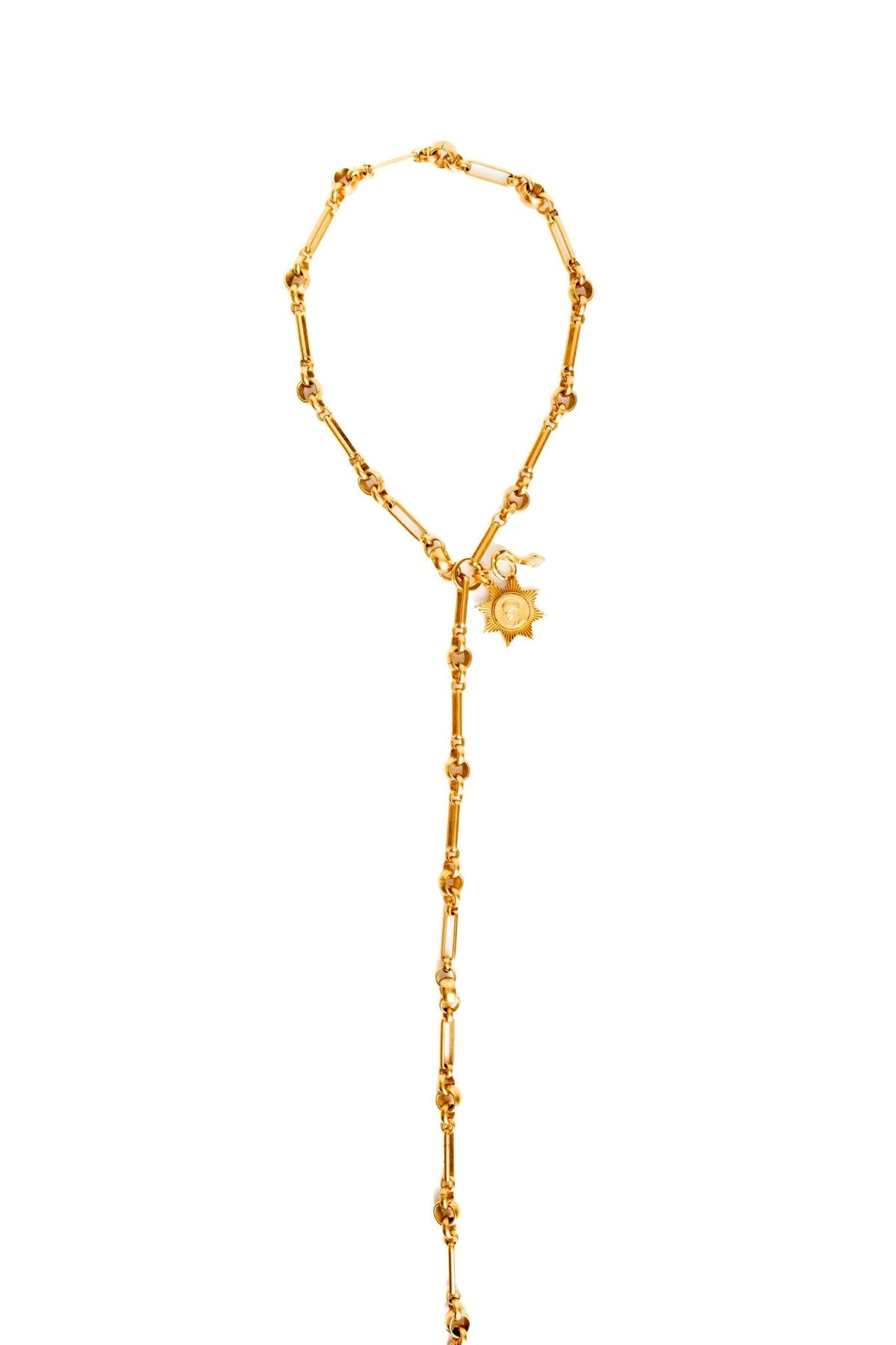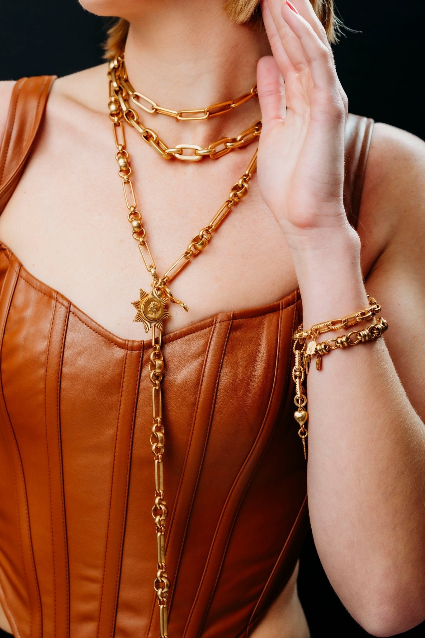 This Ophira Necklace by Elizabeth Cole combines edgy and elegant elements with its open link chain, starburst charm featuring a Roman soldier, and crystal-adorned snake charm. A bold statement piece to elevate any outfit.