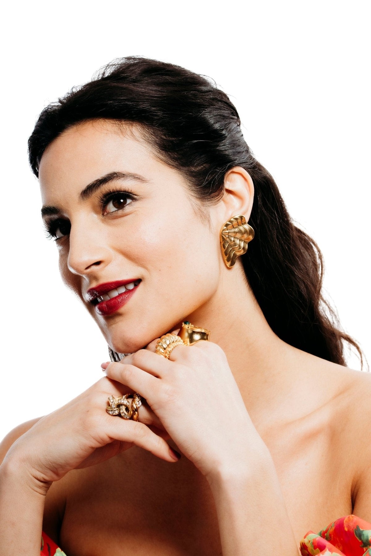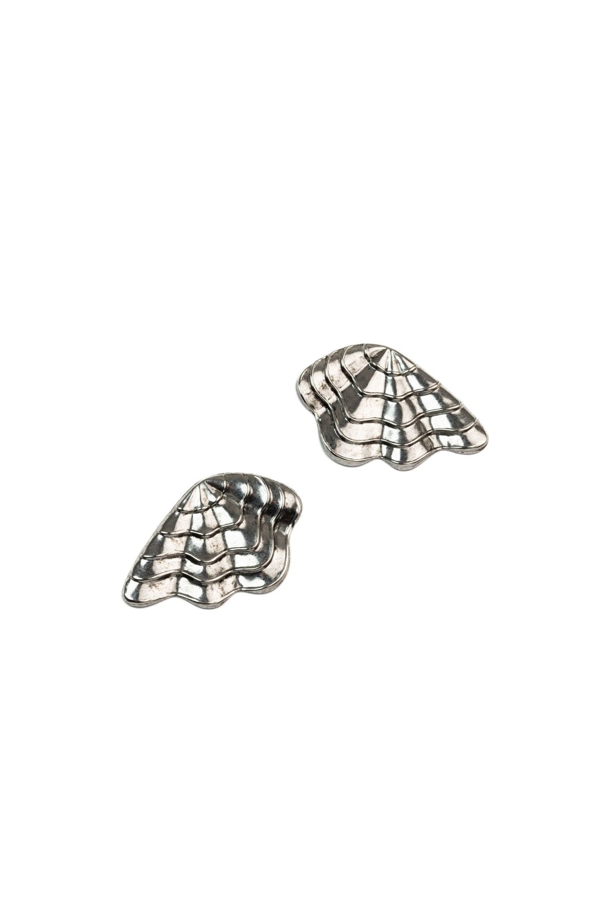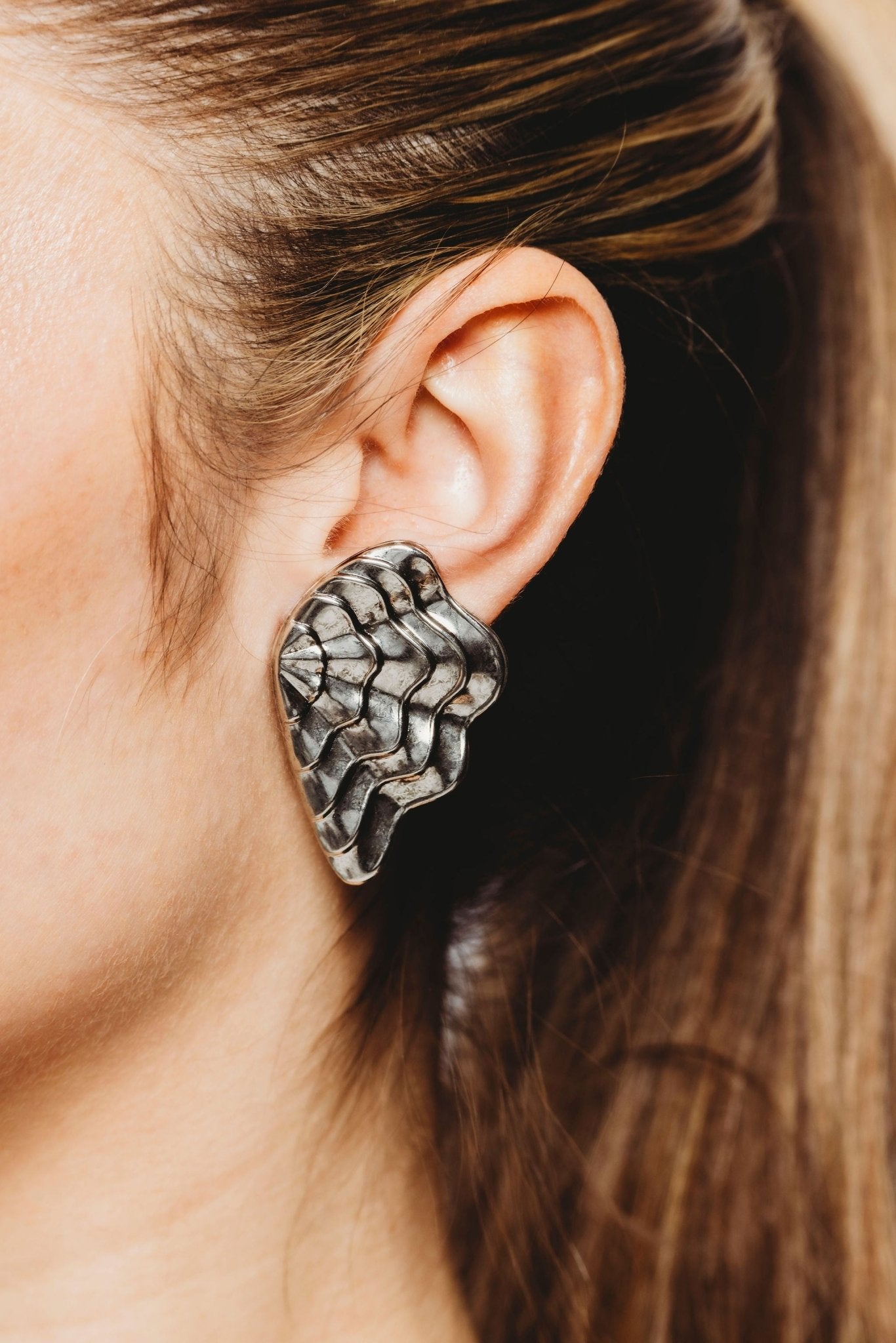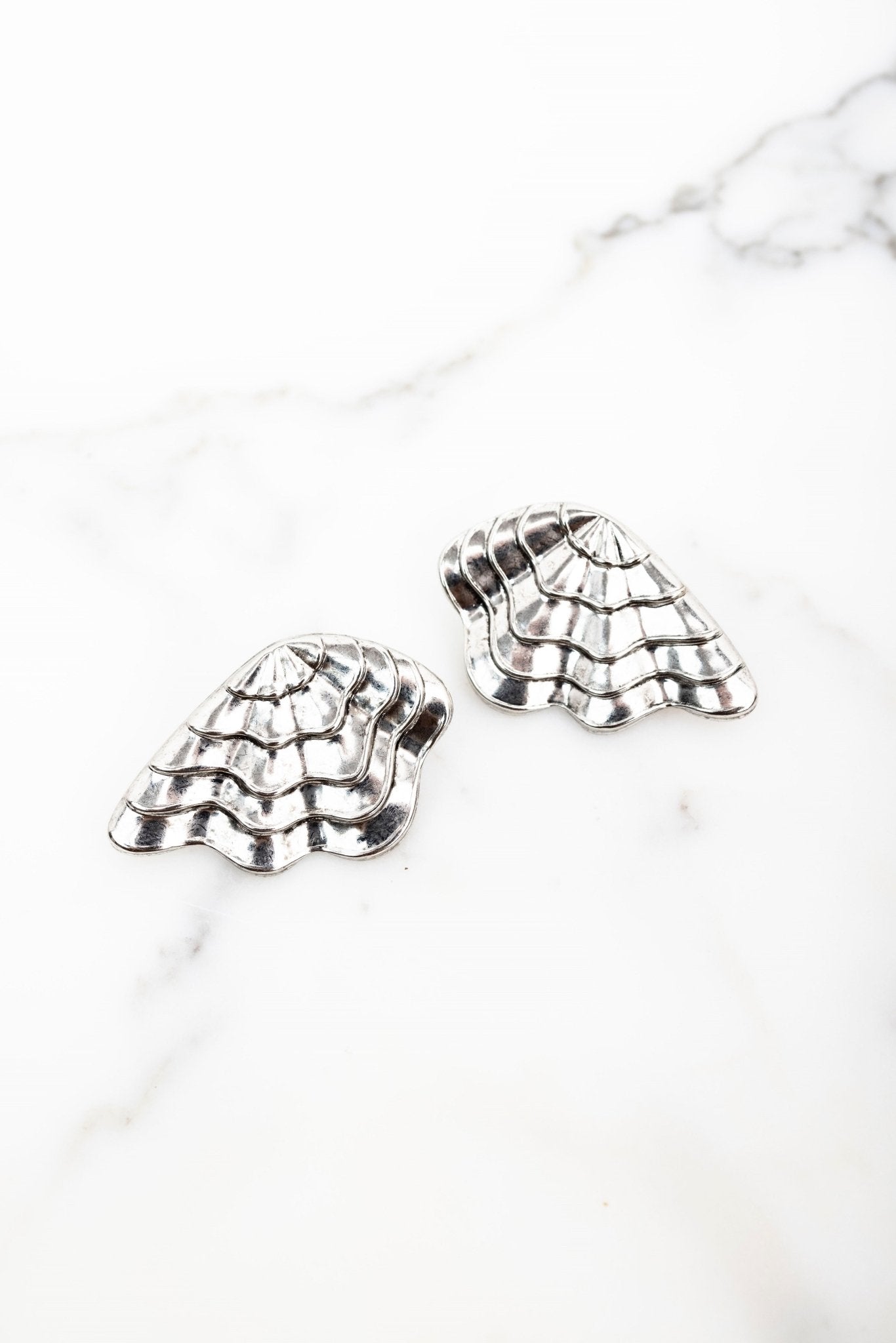 These Perly Earrings by Elizabeth Cole offer a beachy vibe with large seashell-like studs, available in gold or silver. A whimsical and playful addition to any jewelry collection.