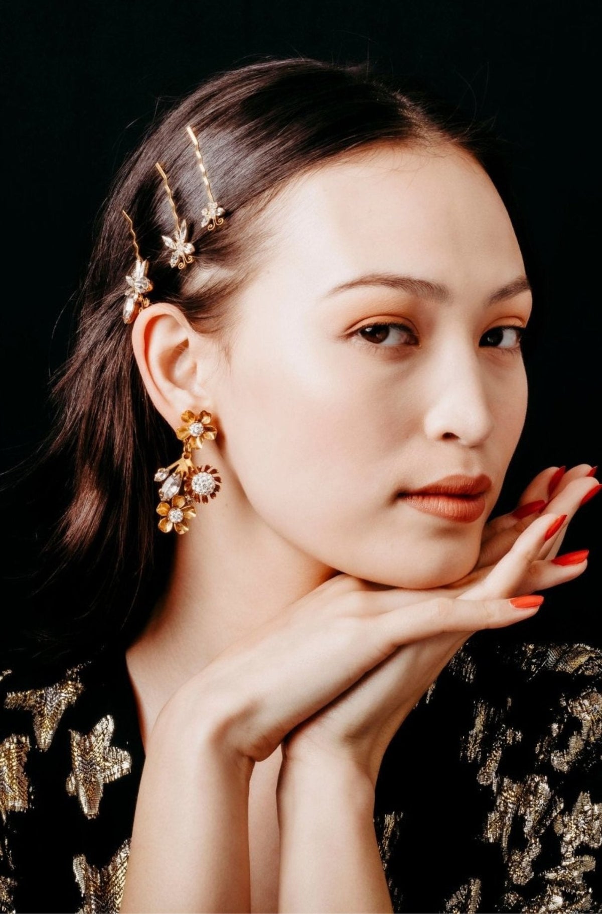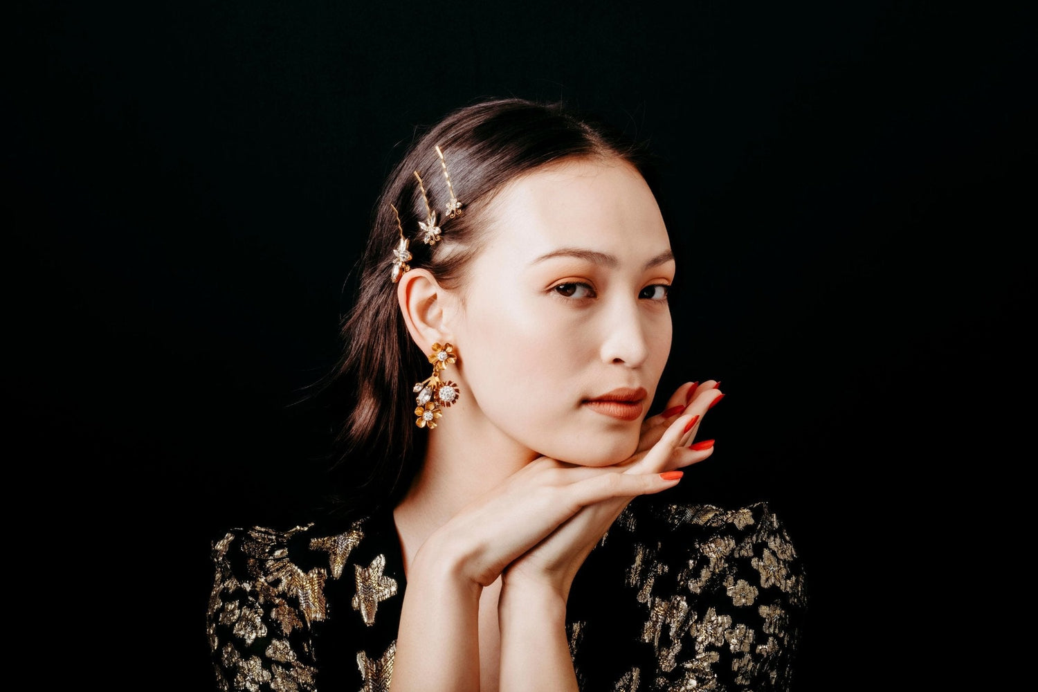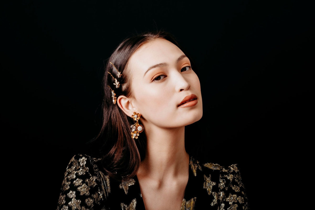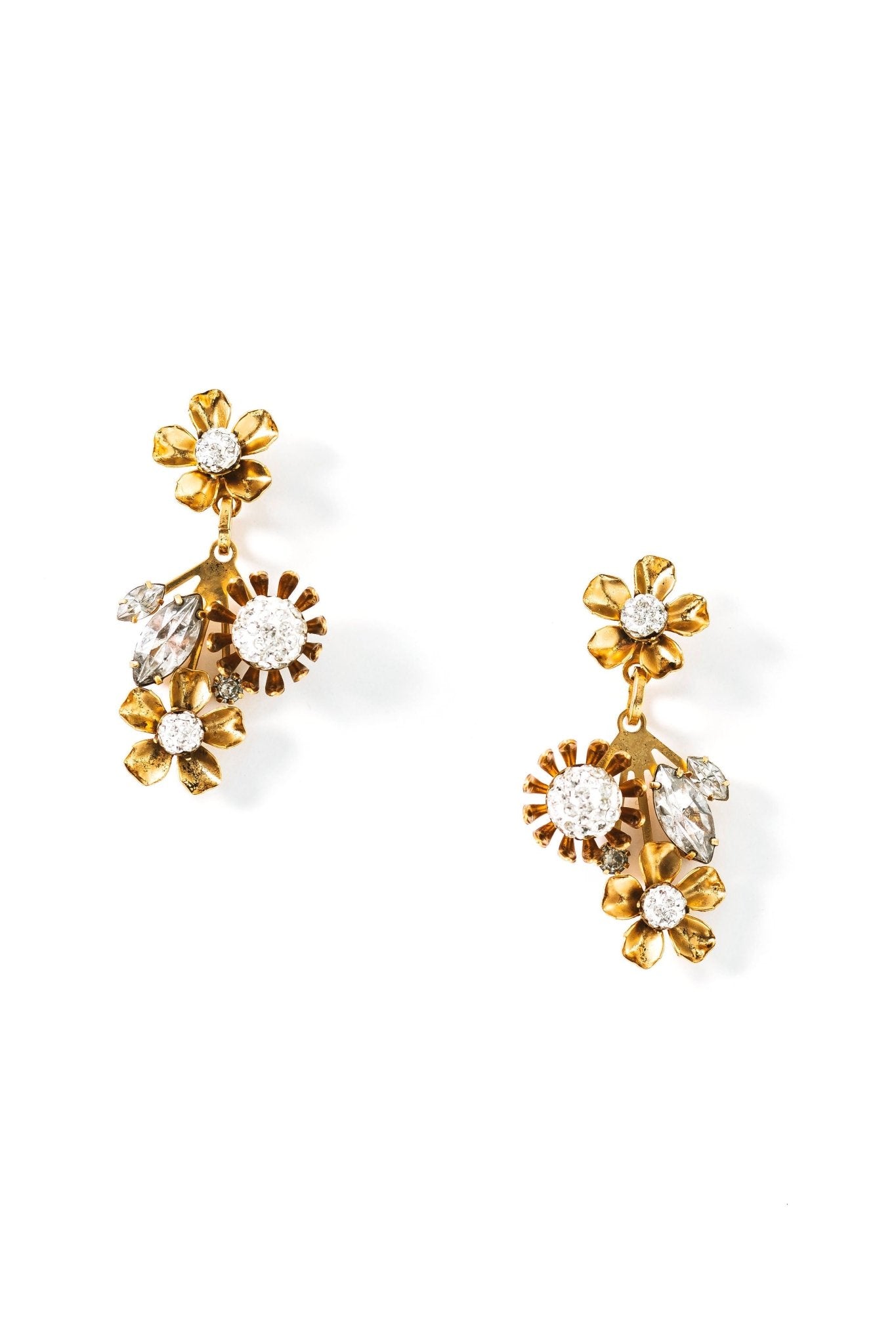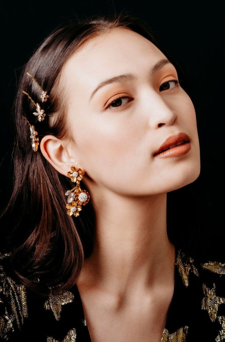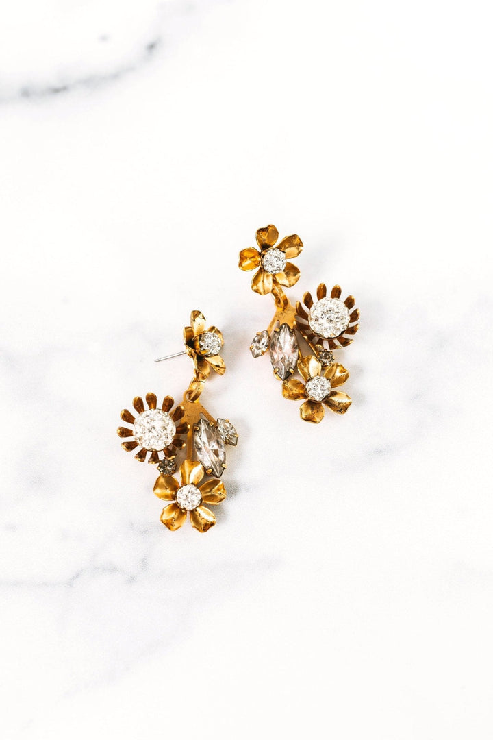 Austrian and Czech crystals, 24kt gold plate. Post closure. Proudly made in the USA.