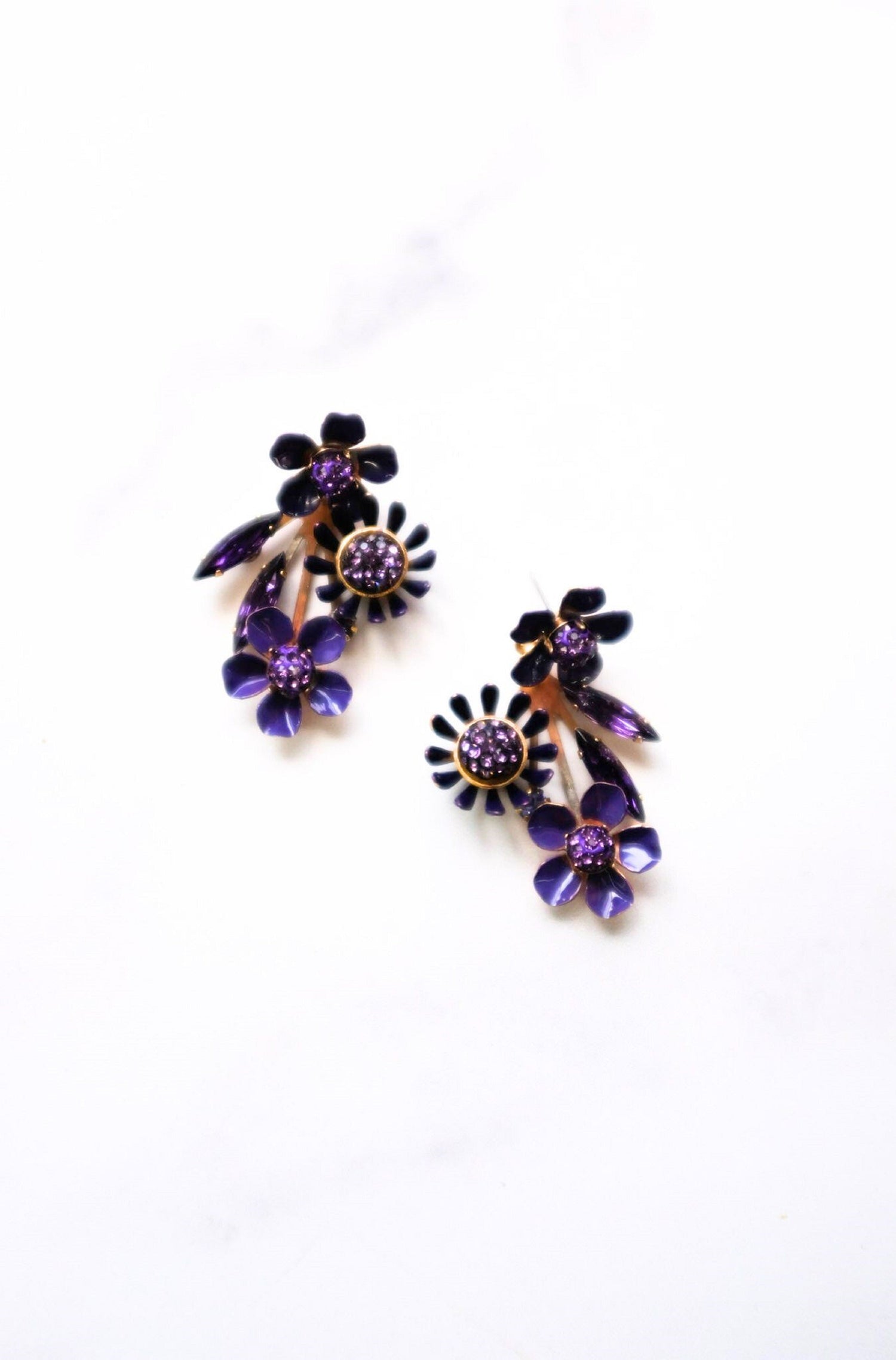 These Peyton Earrings by Elizabeth Cole feature a delightful bouquet of purple flowers with encrusted, glittering centers, complemented by purple leaves. A perfect touch of floral elegance for your ears.