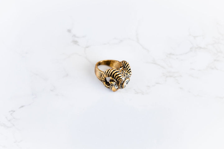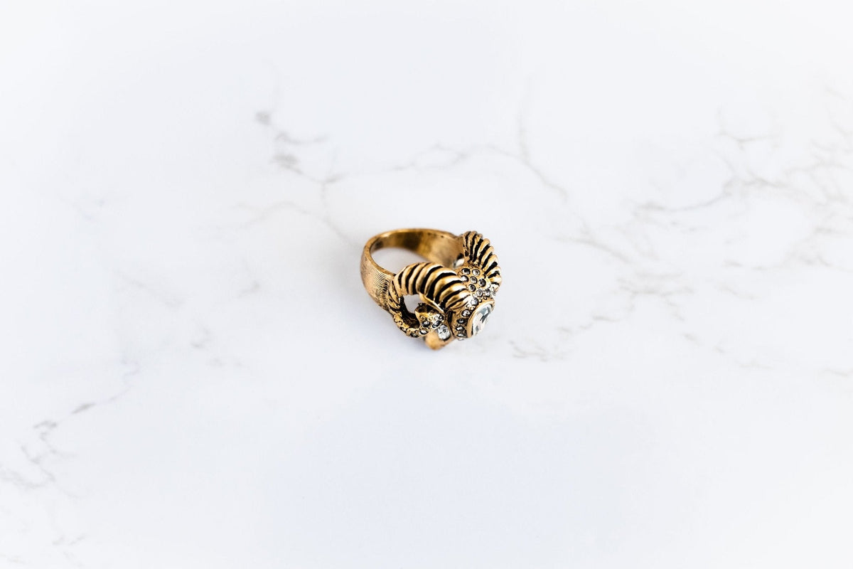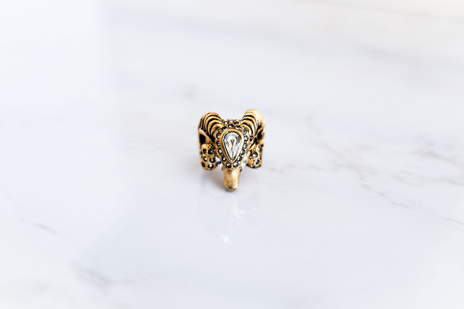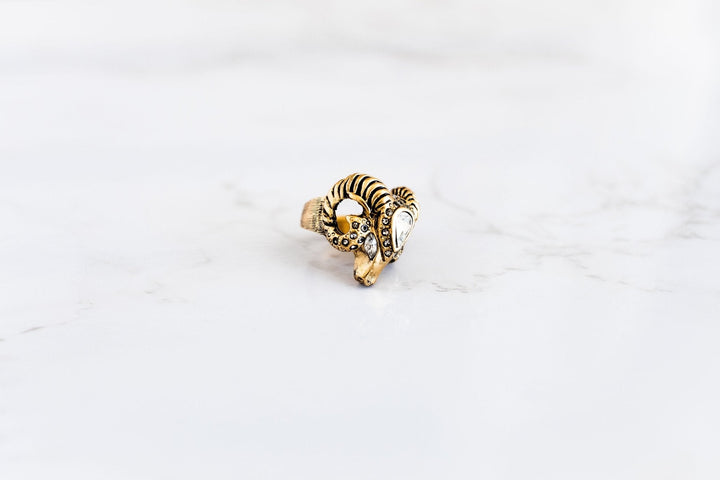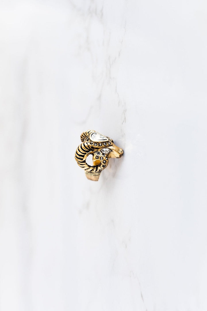 This Ram Head Ring by Elizabeth Cole is a classic, featuring a large ram head adorned with crystal pears, navettes, and petite crystal details, reflecting the designer’s love for the American West.
