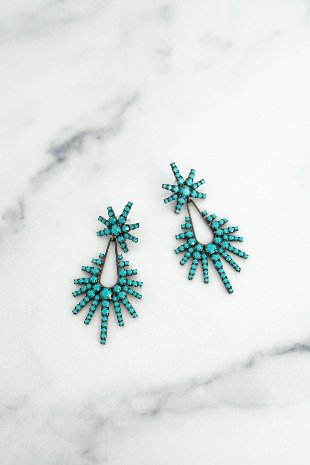 These Remington Earrings by Elizabeth Cole showcase sparkling drop crystals with dynamic movement, swinging from a star-shaped stud. These earrings bring sparkle and glamour, perfect for evening wear or special occasions. Proudly made in the USA, they add luxury and charm to any collection.