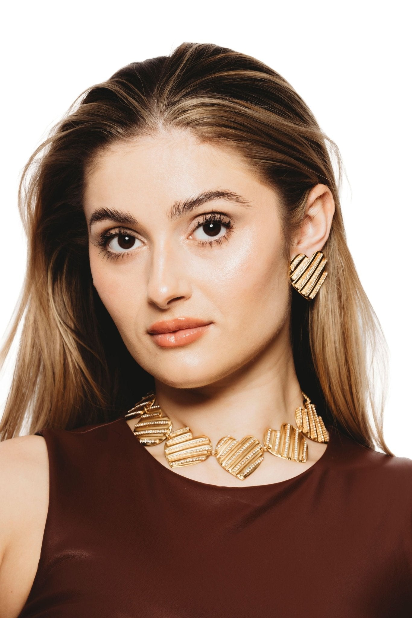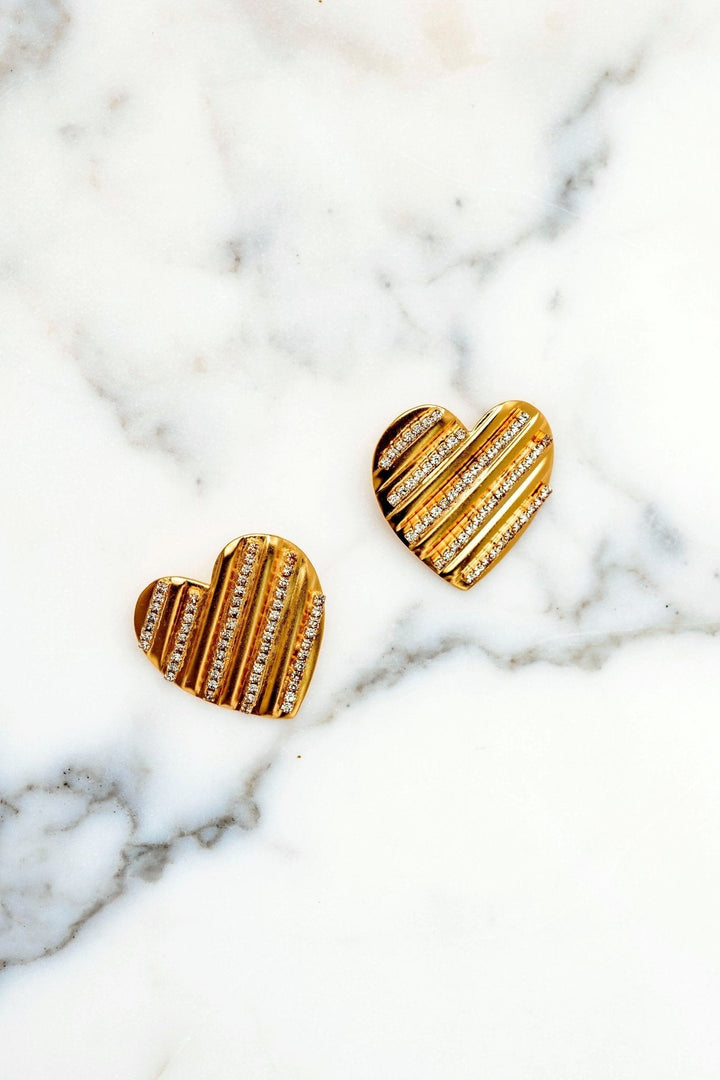 These Renee Earrings by Elizabeth Cole are stunning heart-shaped earrings that feature delicate diagonal crystal lines, adding a subtle touch of sparkle to any outfit. Perfect for showcasing love and elegance, these earrings elevate your style for any occasion. A must-have for any jewelry collection, they bring a romantic and refined accent to your look. Proudly made in the USA, they offer timeless beauty.