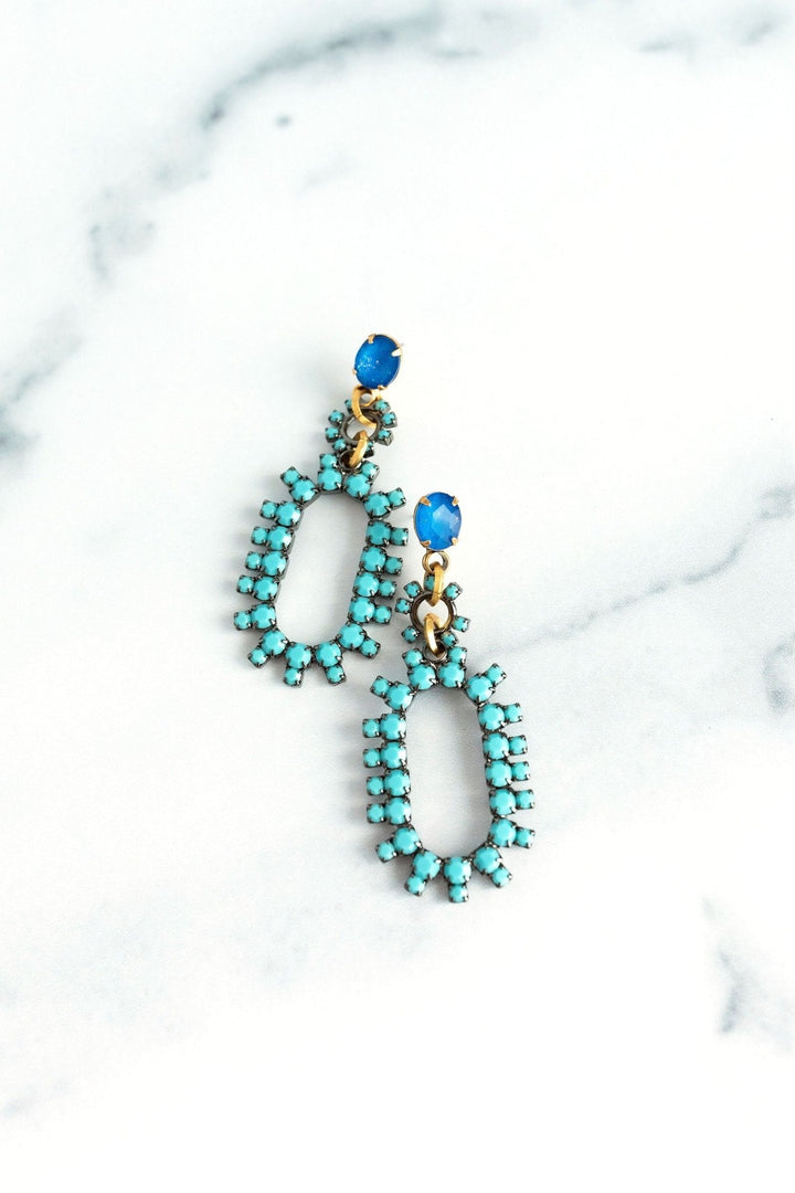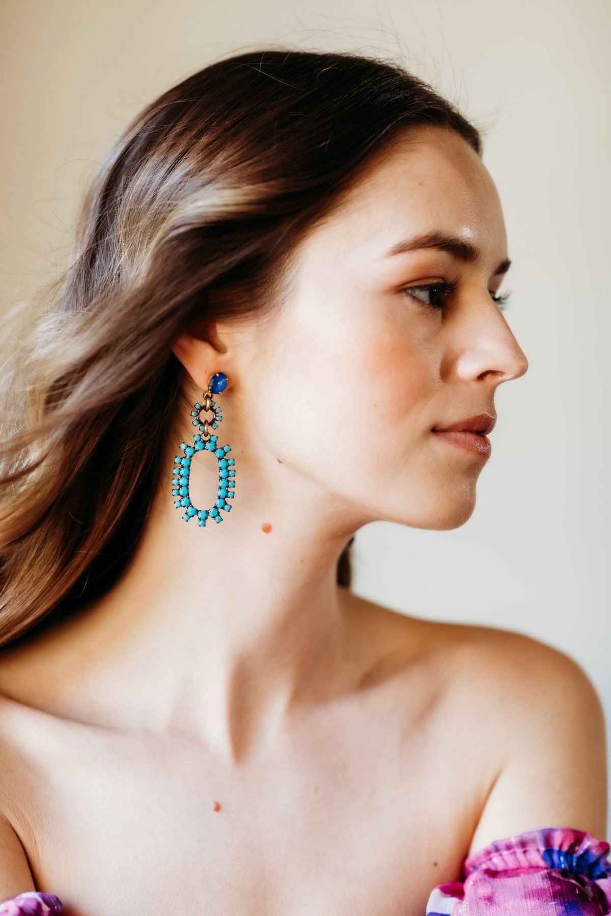 These Rhiannon Earrings by Elizabeth Cole are a stunning showcase of turquoise octagons, accented with graduated-sized stones and golden details. The bright blue oval stone adds a vibrant pop of color, making these earrings perfect for adding a bold, luxurious touch to any look. Proudly made in the USA, these earrings are an elegant yet striking addition to your jewelry collection.