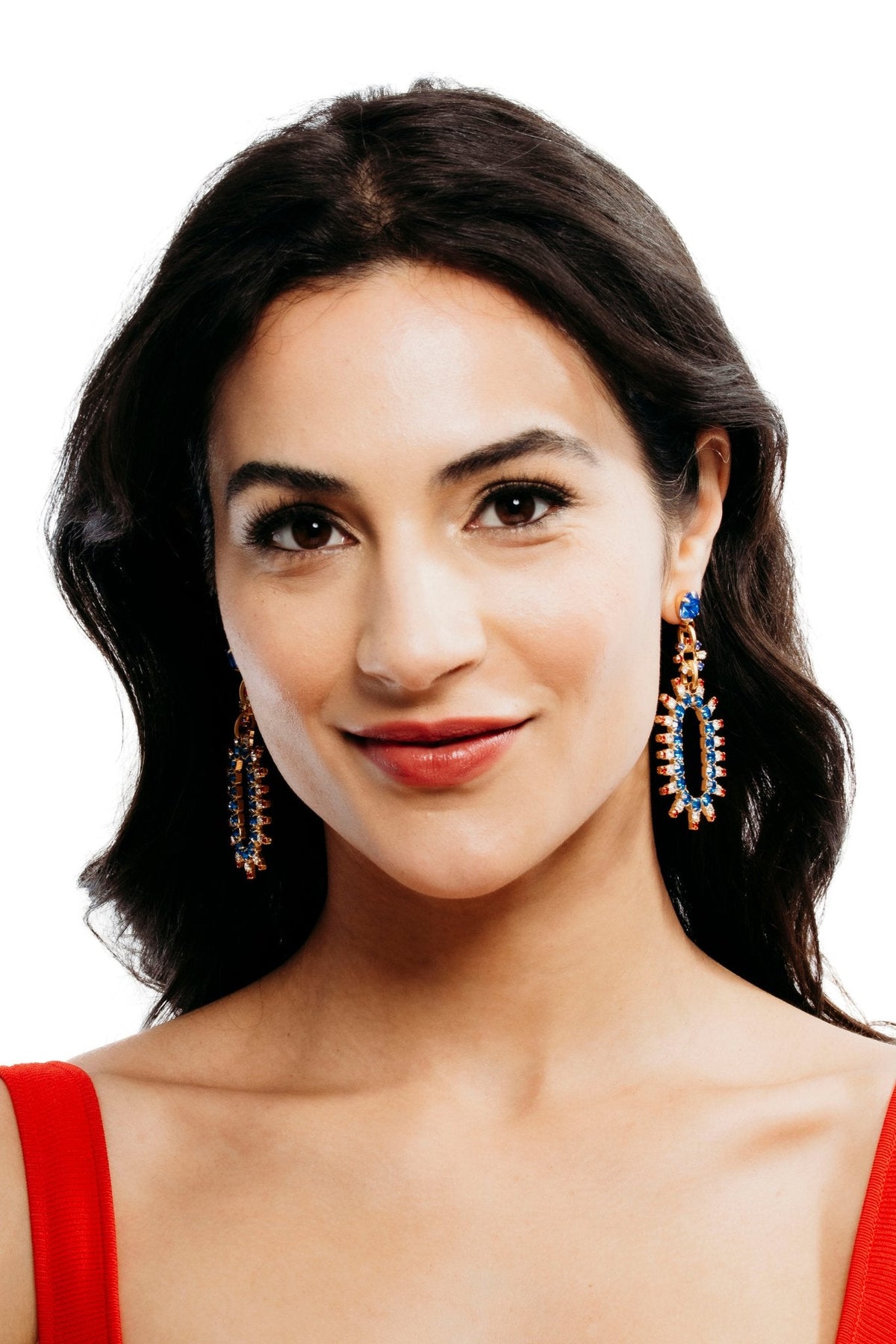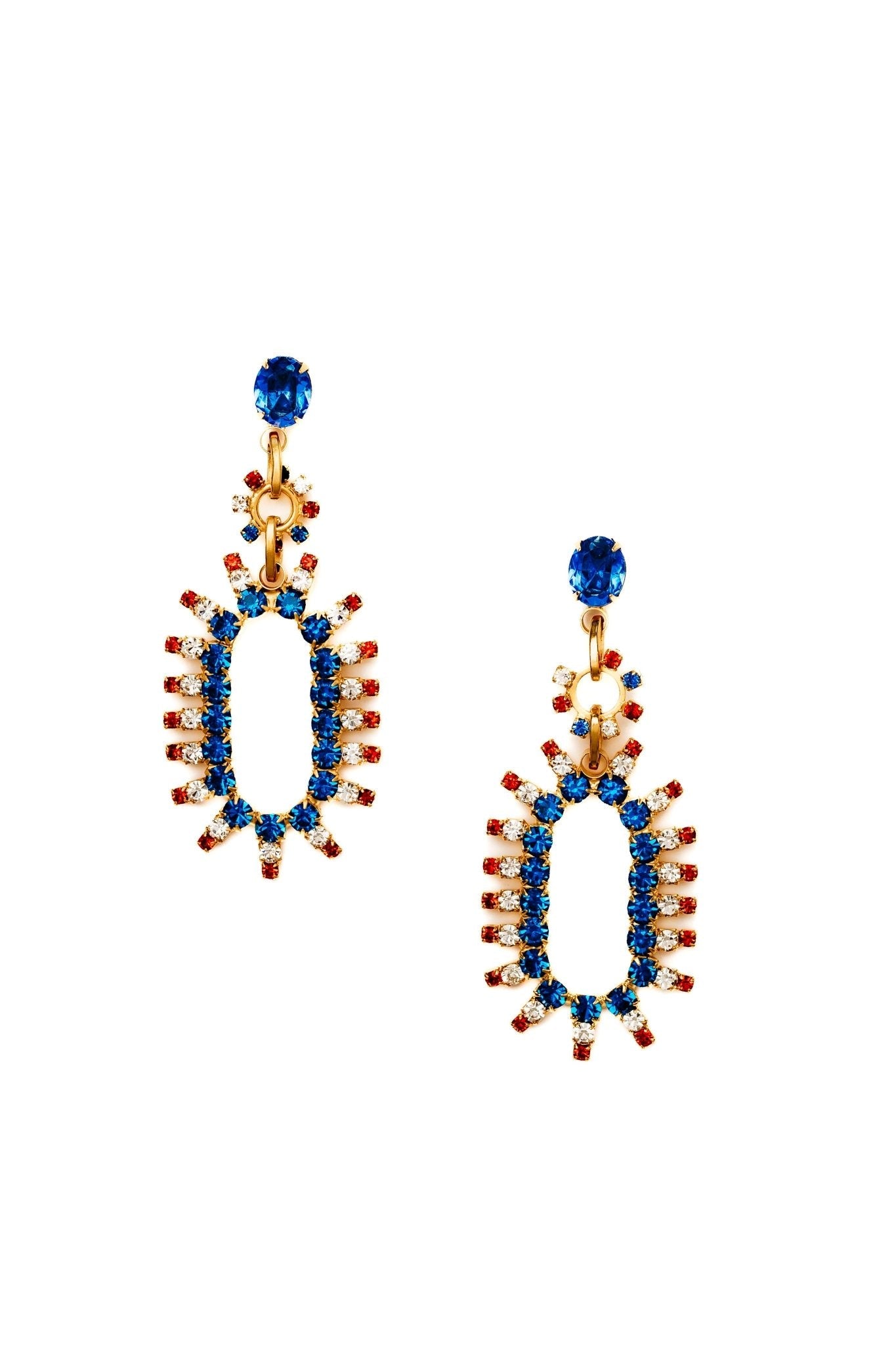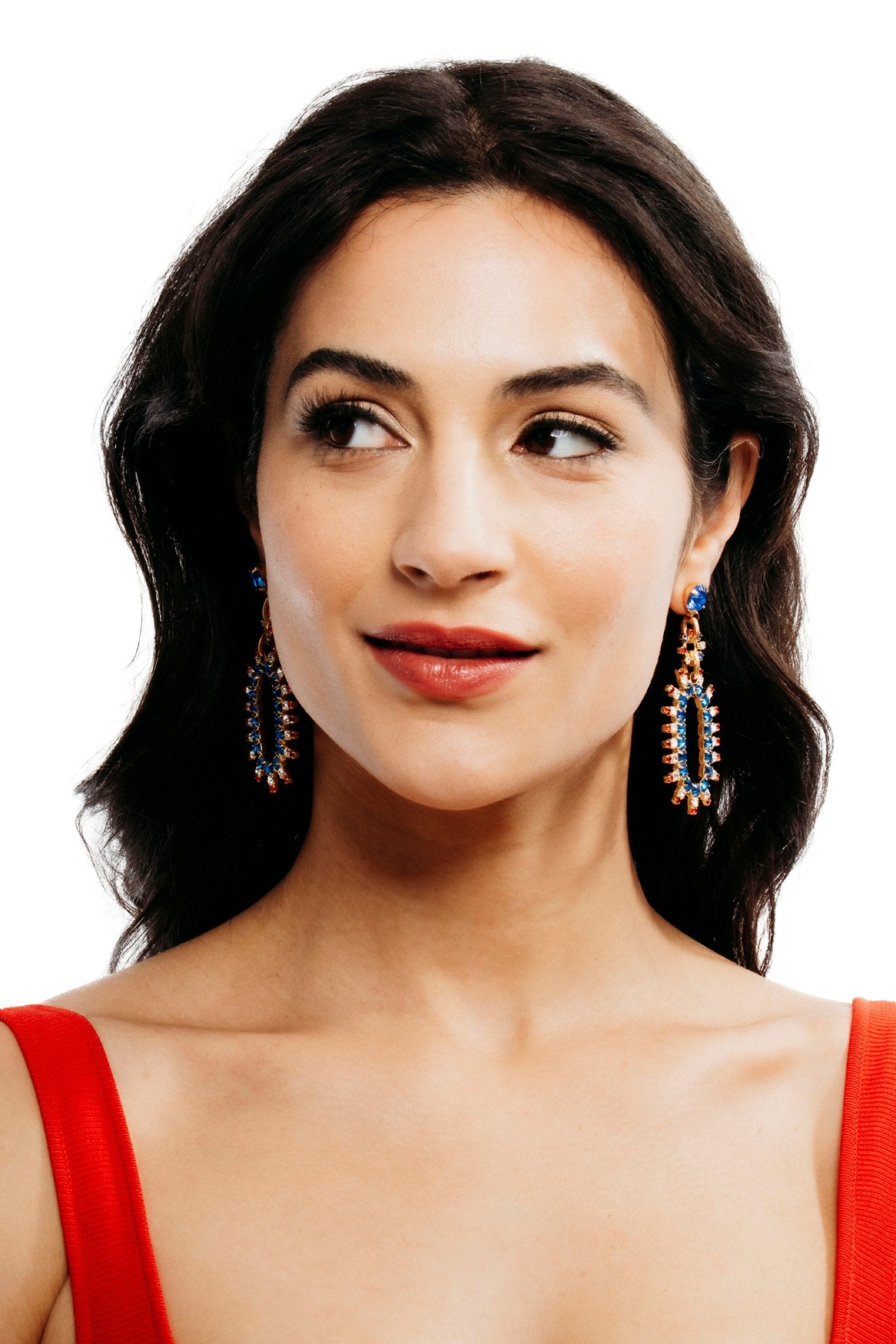 These Rhiannon Earrings by Elizabeth Cole elevate your style with a bold and patriotic twist. Featuring a crystal oval and topped with a brilliant blue stone, these earrings showcase strong design and motion, perfect for making a statement. A best-selling piece, they exude a risk-taking attitude and vibrant energy. Proudly made in the USA, they are a standout addition to any jewelry collection.