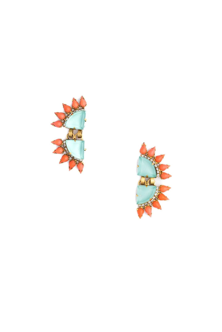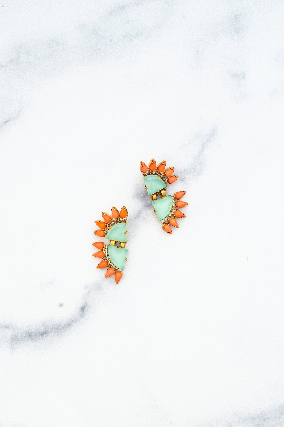 These Robin Earrings by Elizabeth Cole brighten up any outfit with playful double triangle jade stones and pear-shaped coral accents, adding a pop of color and charm. Perfect for those who love a touch of quirkiness in their style, these earrings bring an element of fun and uniqueness to your look. Proudly made in the USA, they are a vibrant accessory for any collection.