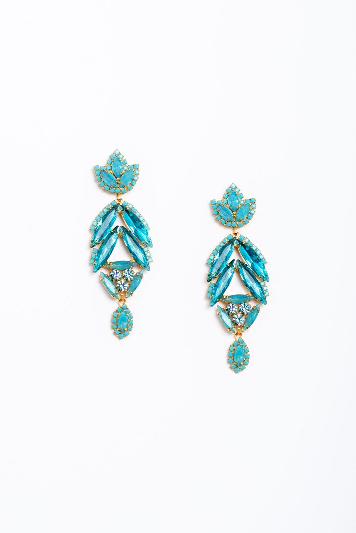 These Rogue Earrings by Elizabeth Cole offer a beautiful display of marquis-shaped stones in multiple sizes and shades of blue, combining vibrant colors with cheerful motion. These earrings are perfect for adding a bold touch to any look, bringing a vibrant and dynamic element to your style. Proudly made in the USA, they are a striking accessory for any jewelry collection.