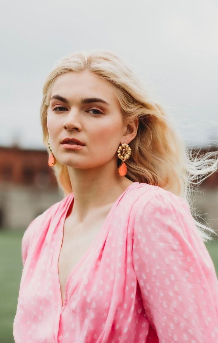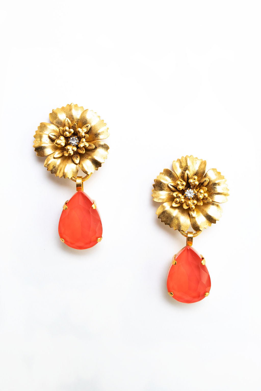 These Romina Earrings by Elizabeth Cole offer flowers that last forever. The golden layered flower design with crystal centers is finished with coral-colored pear stones, adding an elegant and timeless touch to any look. These earrings are perfect for both casual and formal settings, proudly made in the USA.