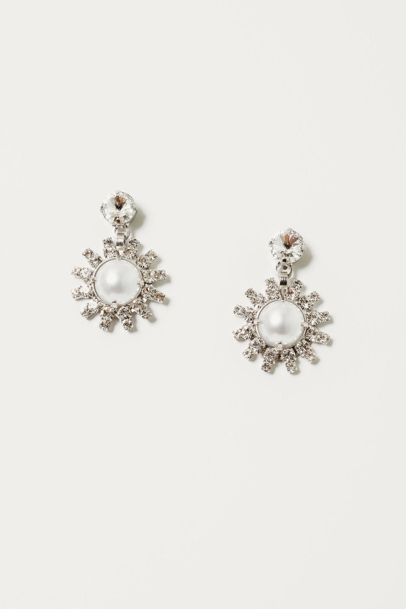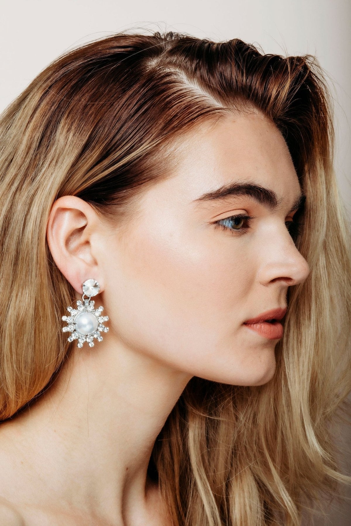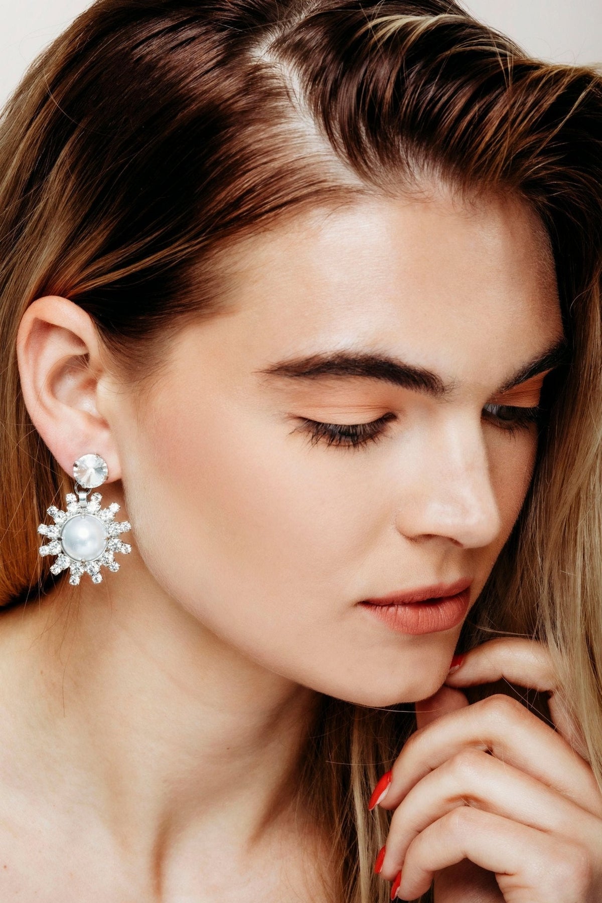 Austrian crystals, glass stones, hematite plate (turquoise version), imitation rhodium plate (white version), 24K gold plate (blue version), post closure, measuring 1.5 inches (4 cm) in length and weighing 7.3g (equivalent to a nickel and a dime).