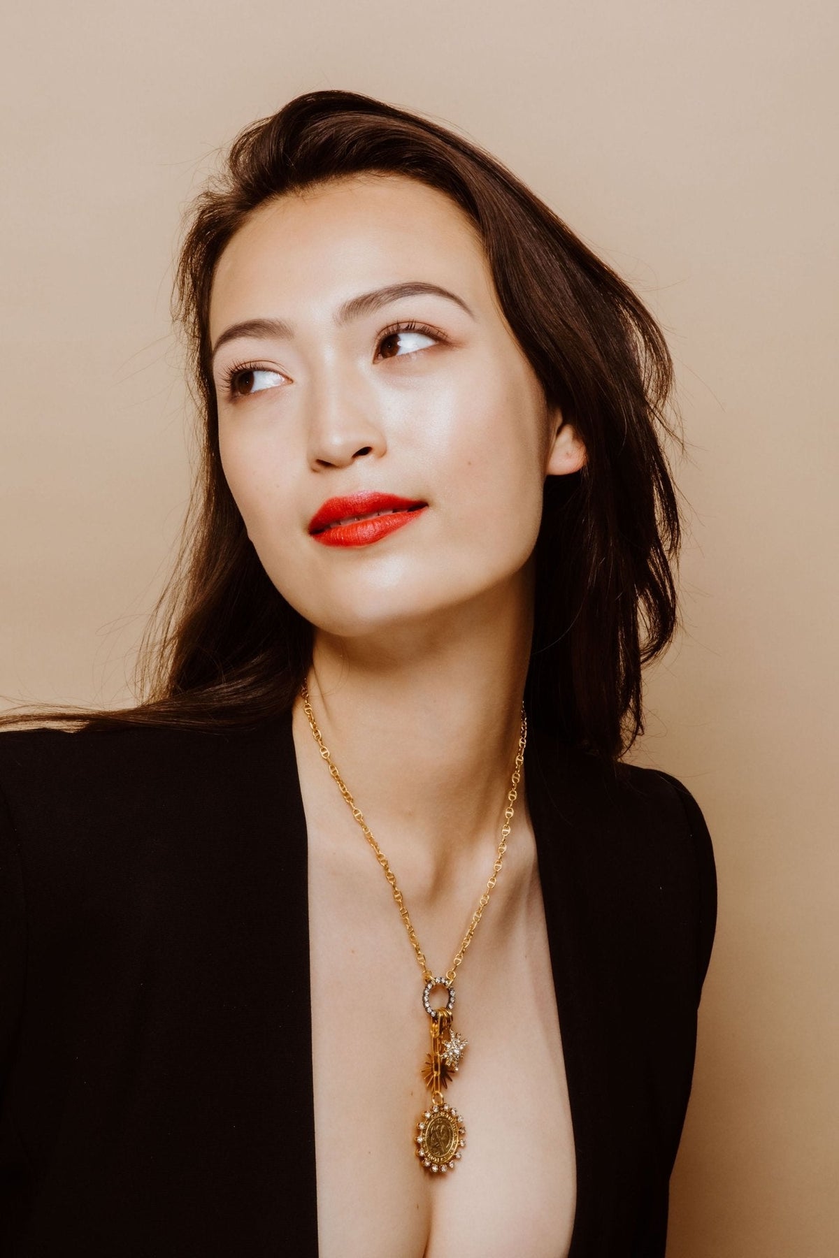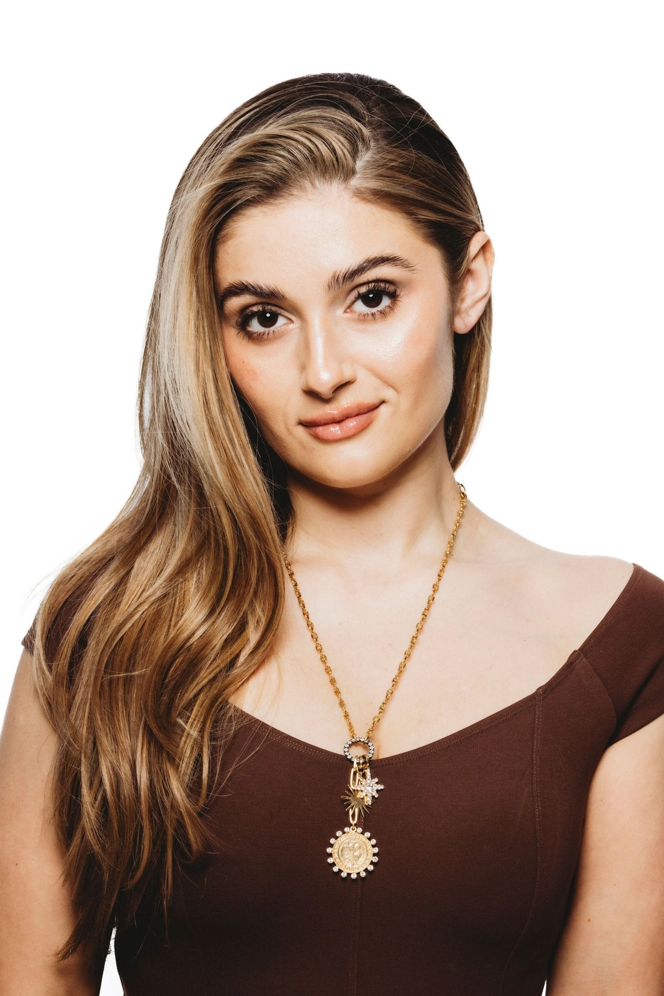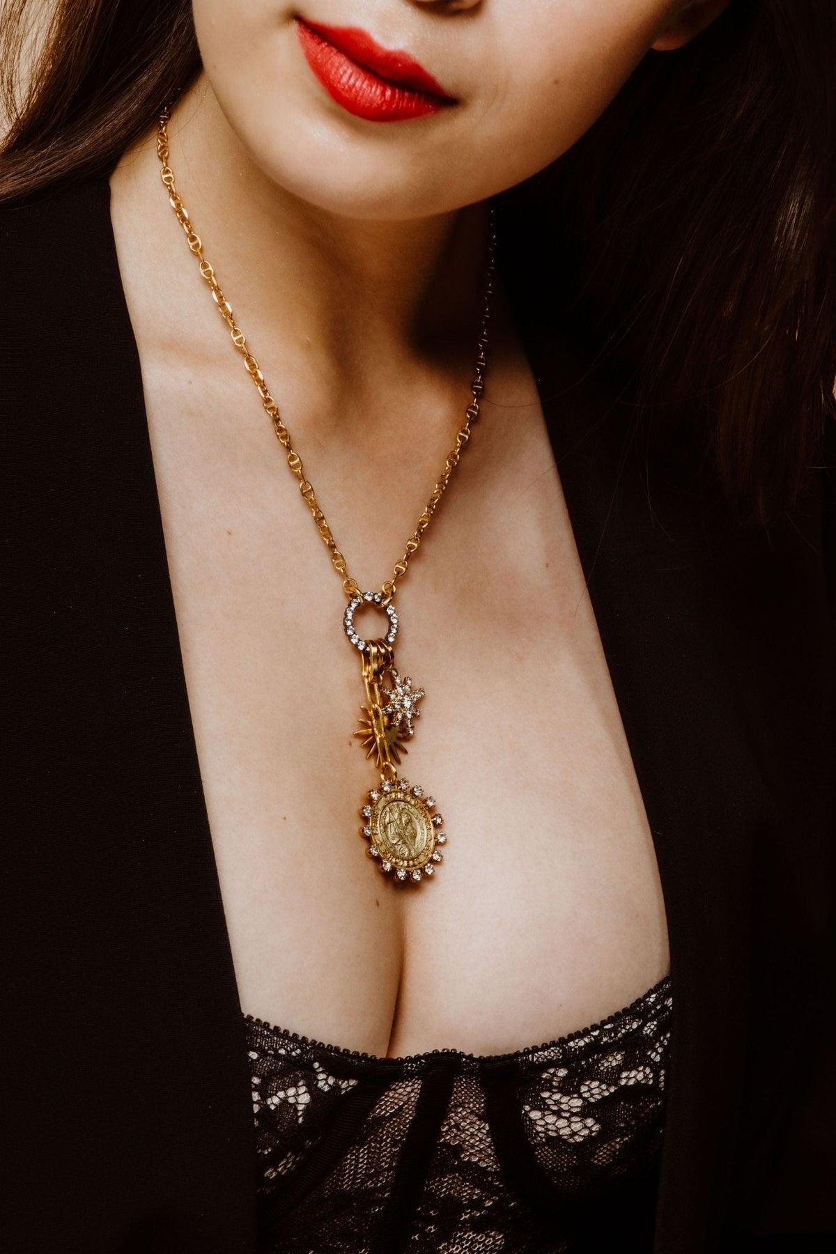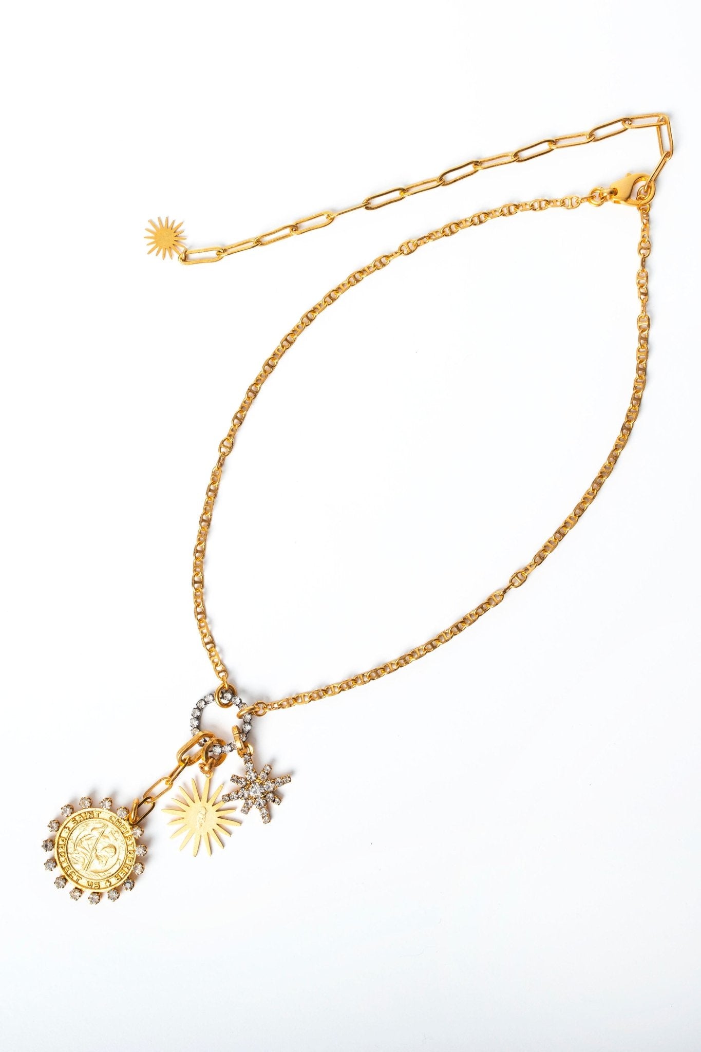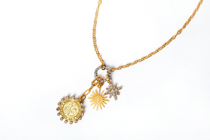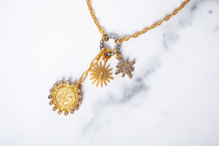 This Roxanne Necklace by Elizabeth Cole features a collection of charms including a St. Christopher charm (the patron saint of travelers), a golden star, and a glittering crystal star. Whether worn alone or layered, this necklace adds a meaningful and stylish touch to any look. Proudly made in the USA.