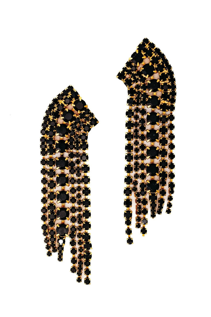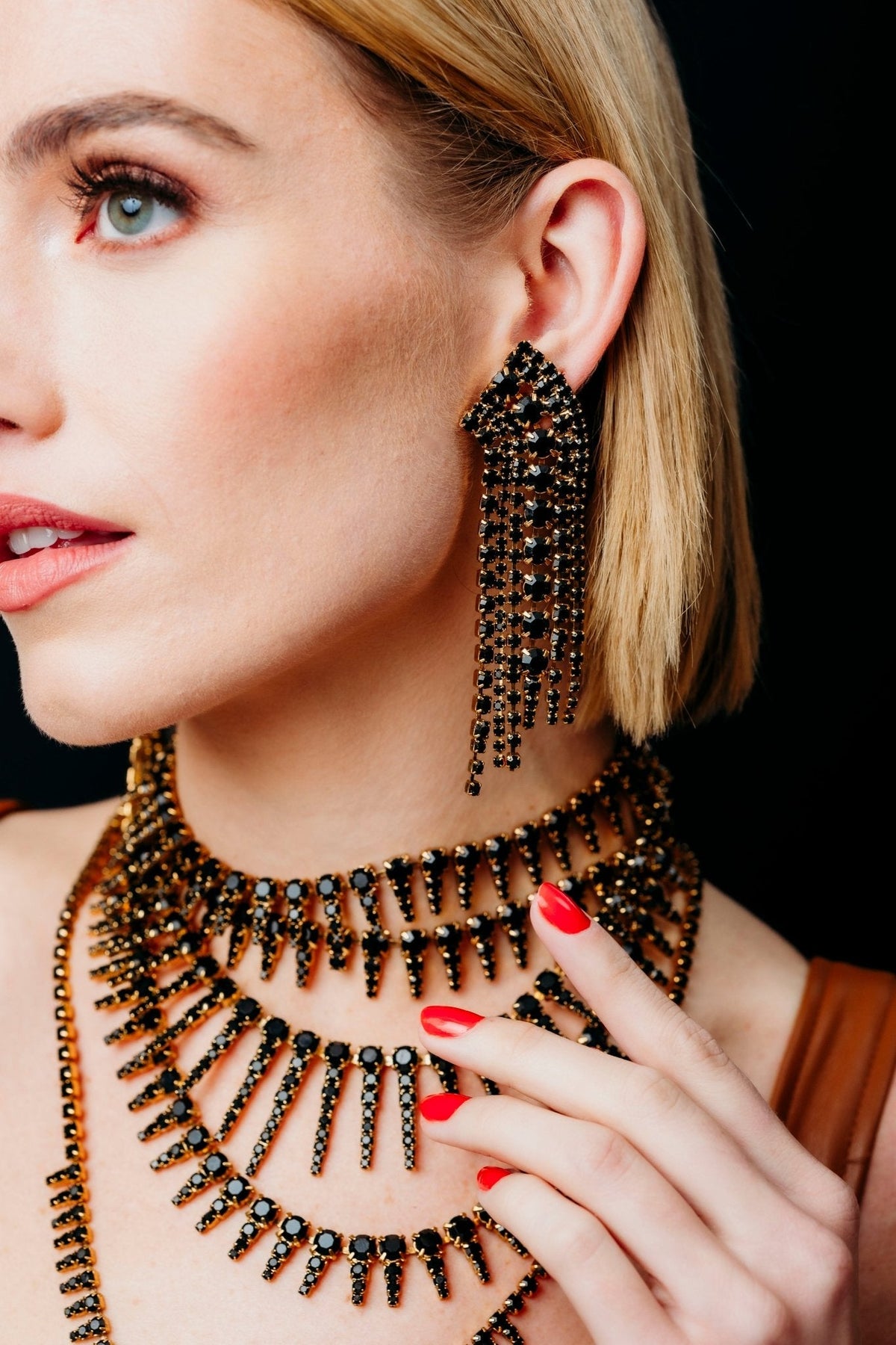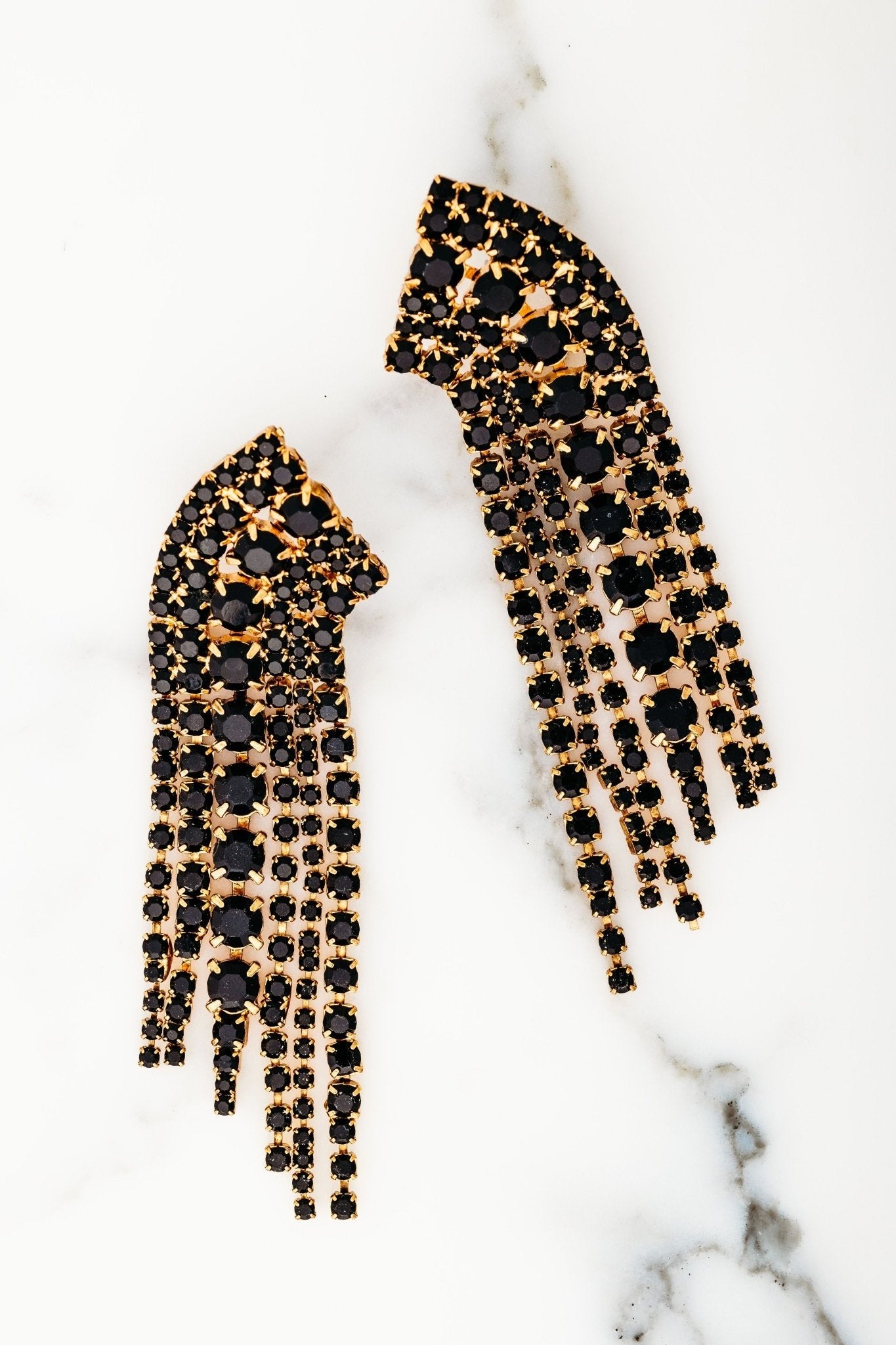 These Sabrina Earrings by Elizabeth Cole feature a cascading waterfall of crystals in a variety of sizes, available in rainbow or classic jet black. These statement earrings add an element of glamor and sparkle to any outfit. Proudly made in the USA.