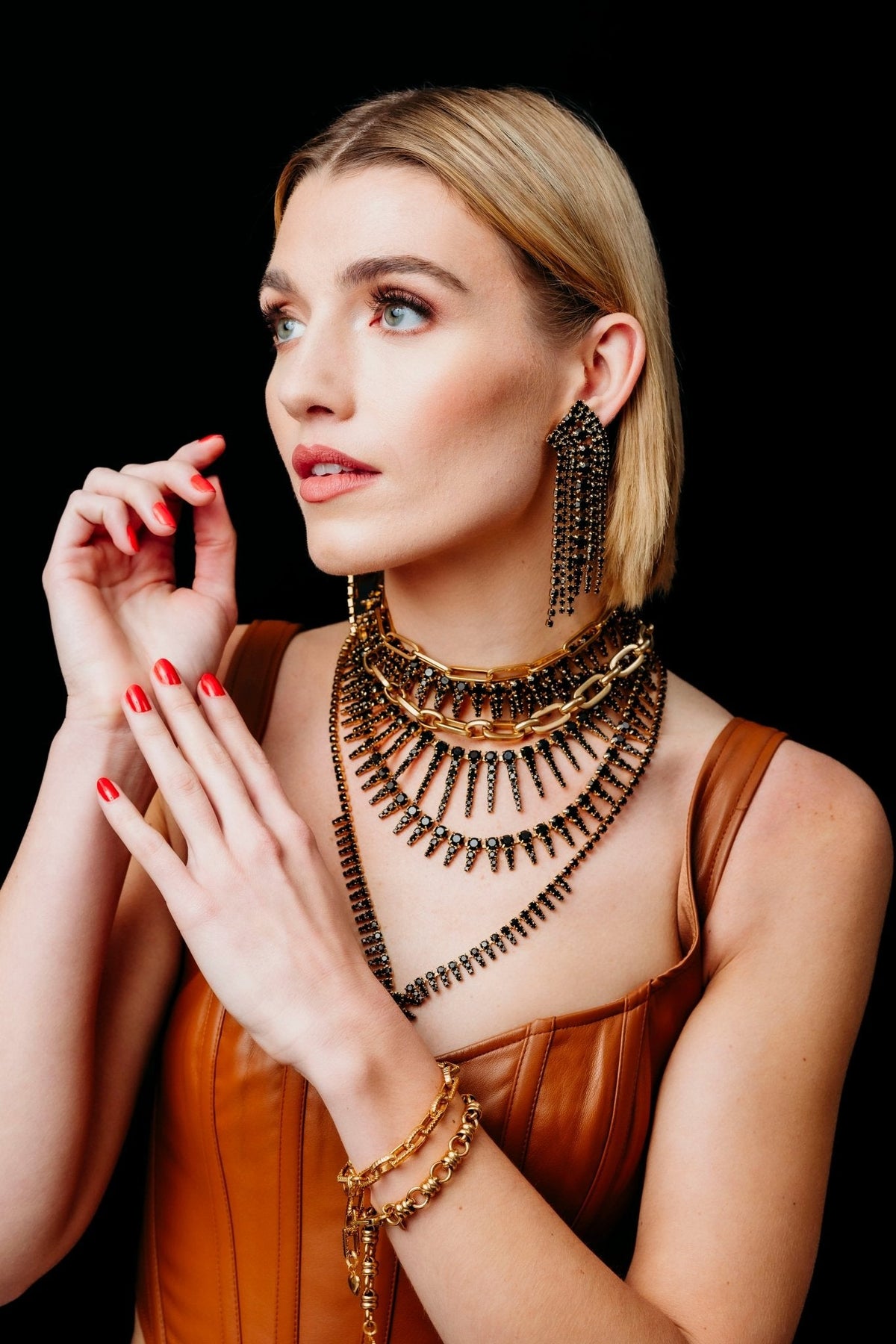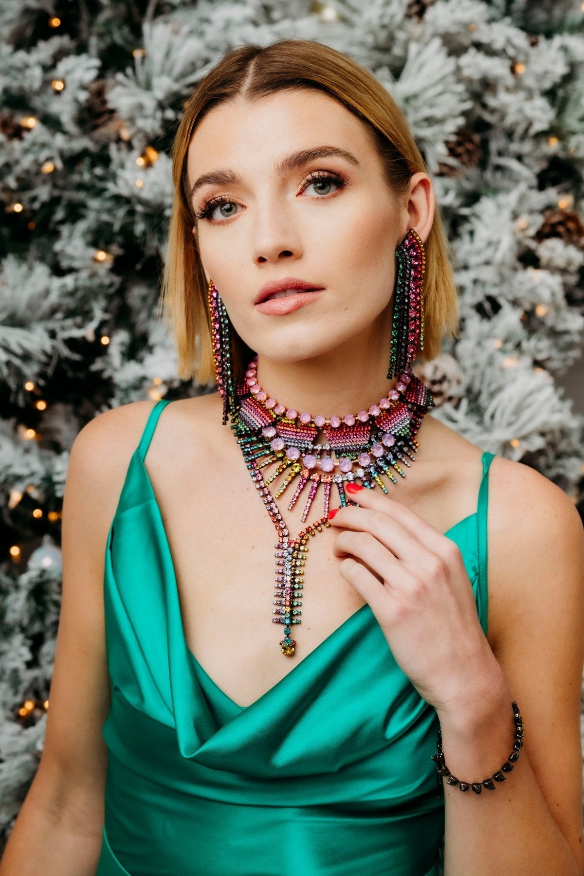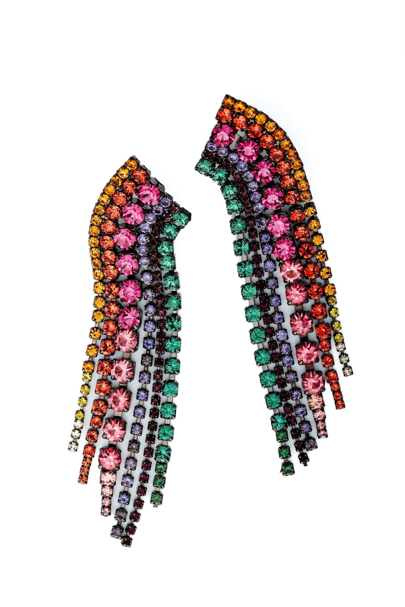 These Sabrina Earrings by Elizabeth Cole feature a cascading waterfall of crystals in a variety of sizes, available in rainbow or classic jet black. These statement earrings add an element of glamor and sparkle to any outfit. Proudly made in the USA.