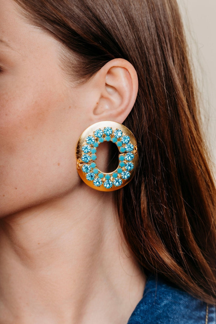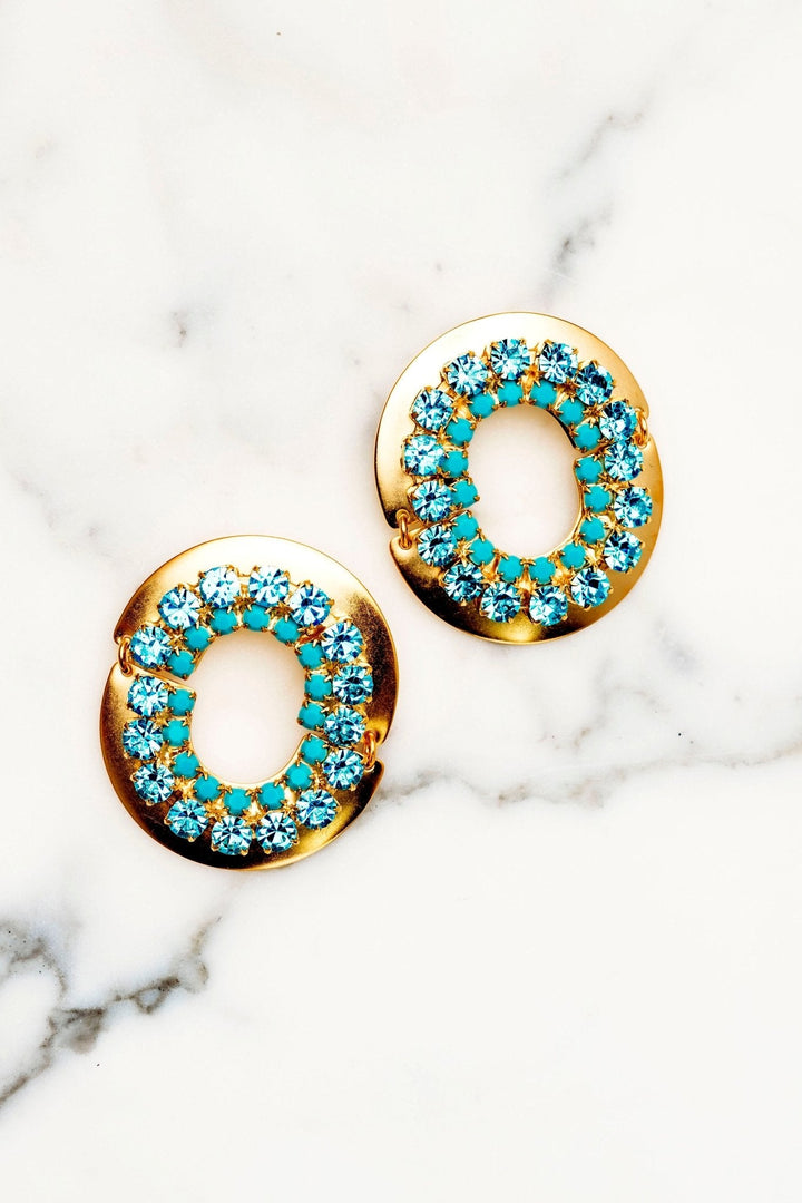 These Samantha Earrings by Elizabeth Cole are adorned with bold blue crystal details, adding a touch of adventure and luxury to any look. These hinged oval earrings bring a daring and glamorous statement to your style. Proudly made in the USA.