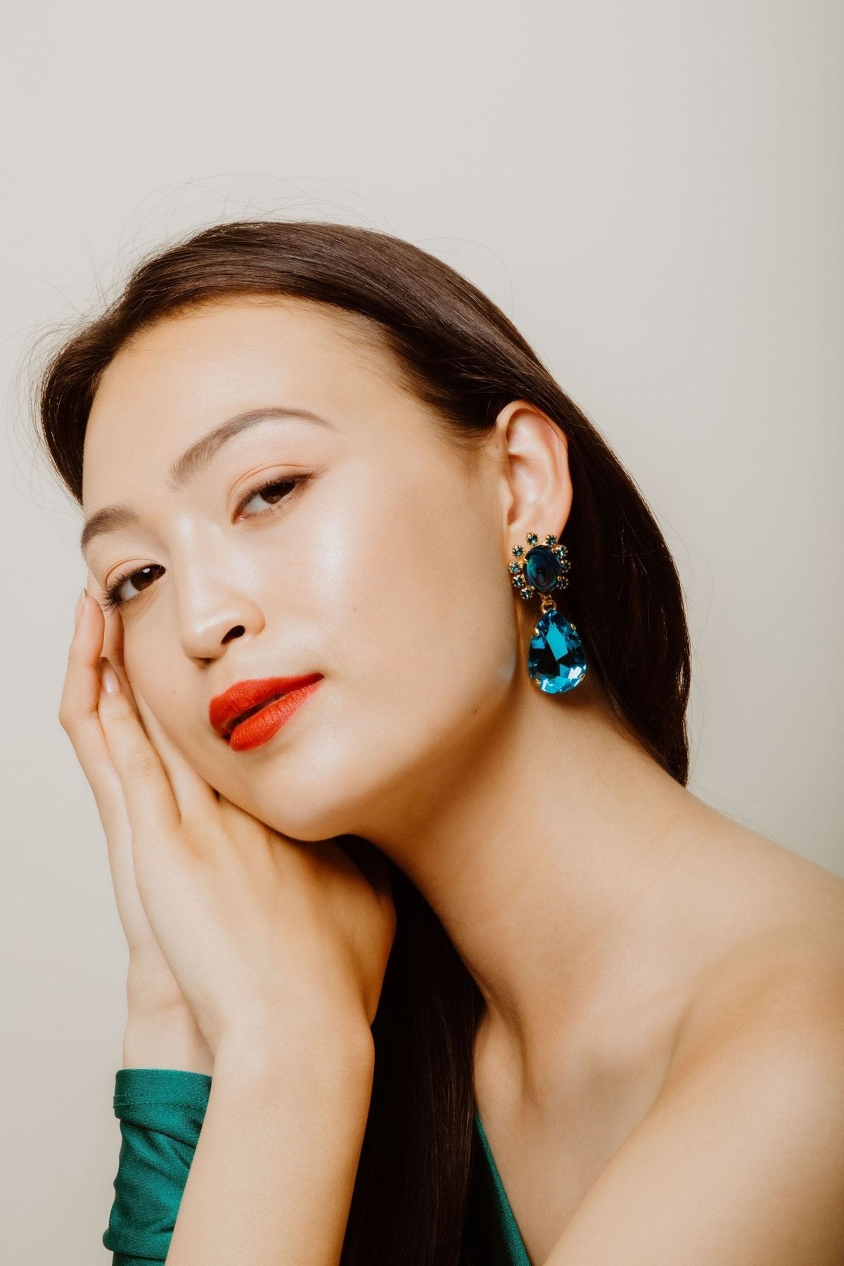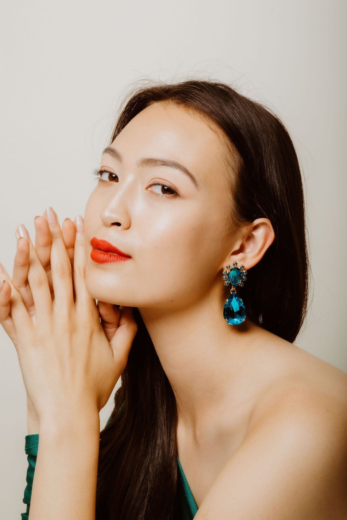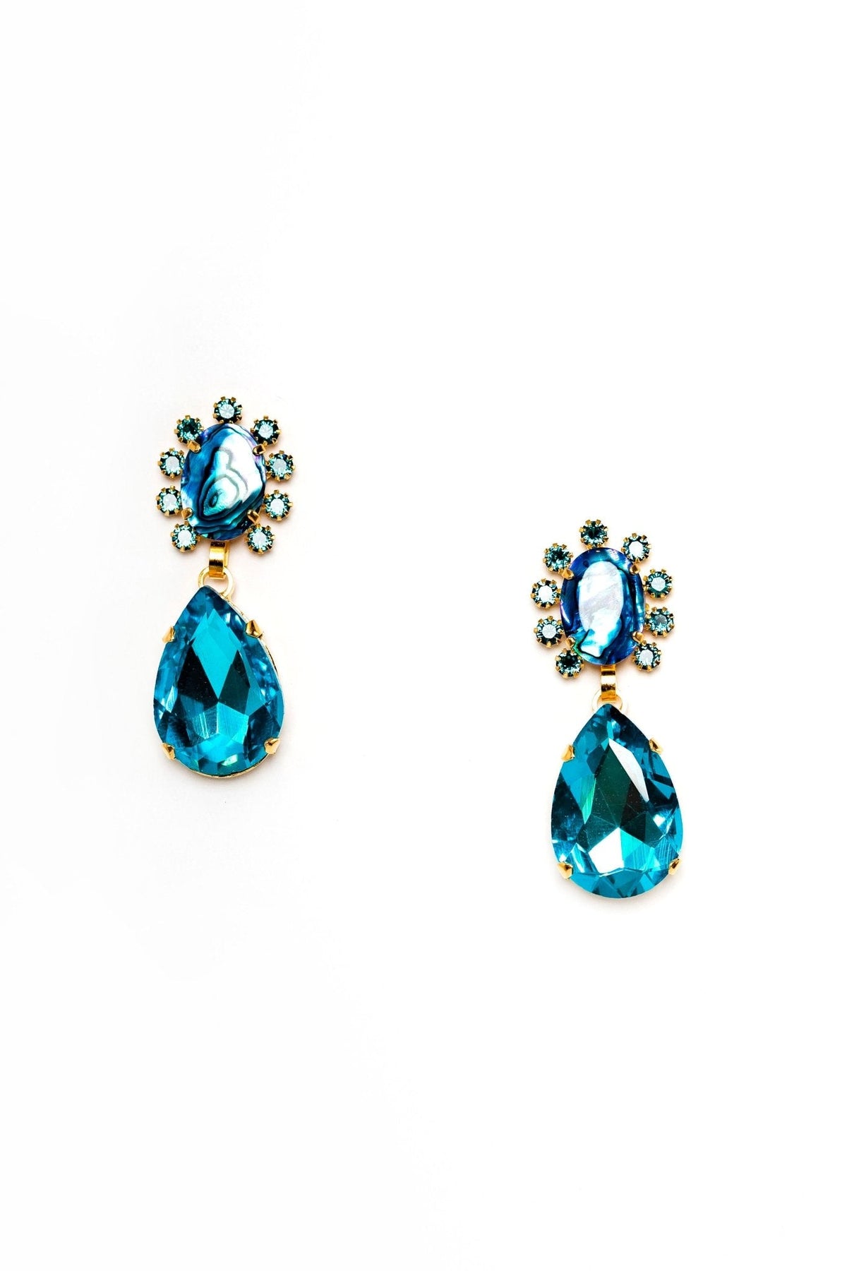 These Seraphina Earrings by Elizabeth Cole put a colorful twist on a classic silhouette. With deep blue abalone ovals, teal crystals, and a dark aqua pear, these lightweight earrings make a bold statement. Proudly made in the USA.