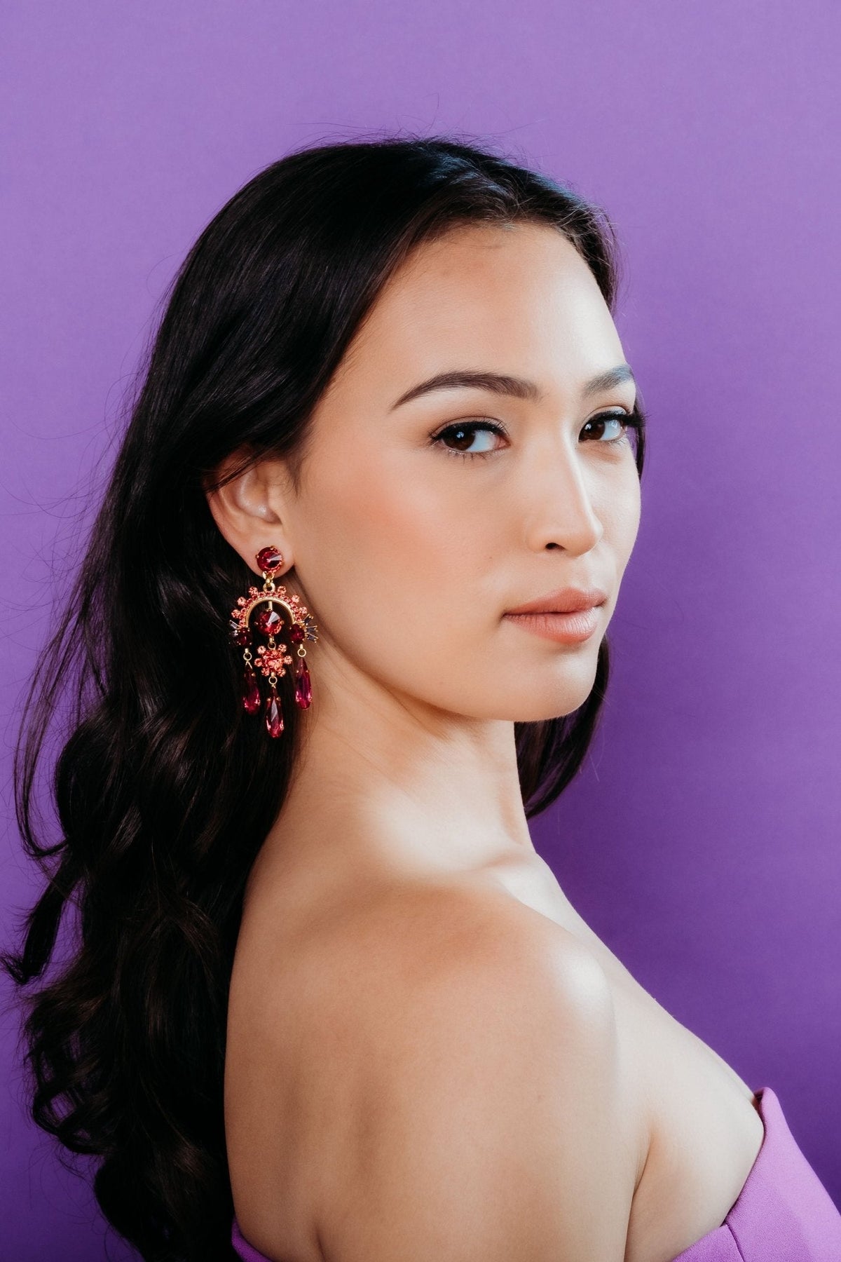 Swarovski crystals, premium crystals, 24K gold plate, post closure, measuring 2.75 inches (6.98 cm) in length and weighing 13g (equivalent to 1 quarter, 1 dime, and 1 nickel).