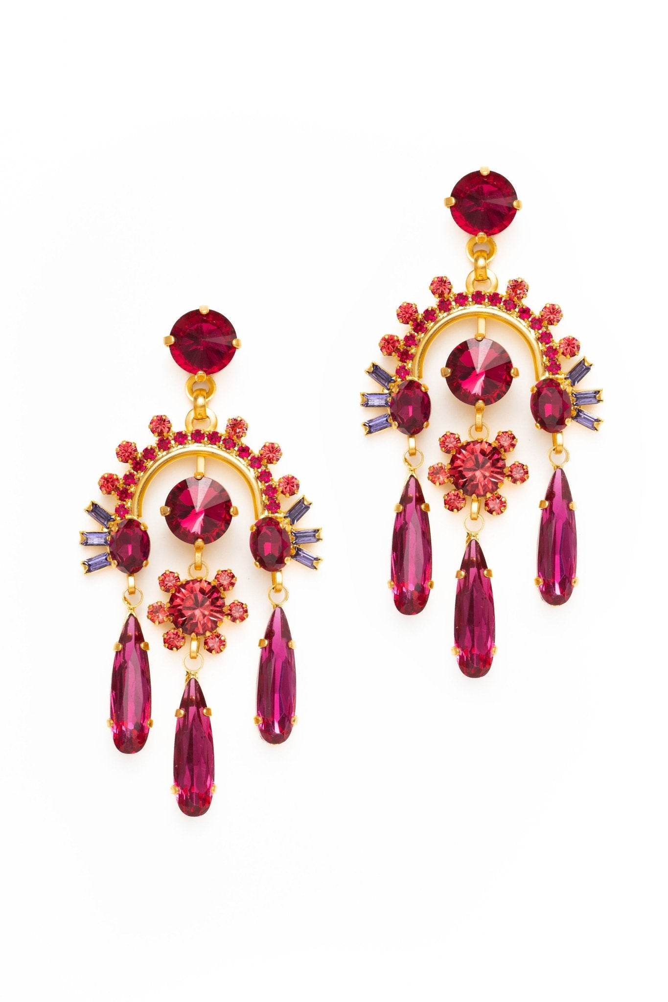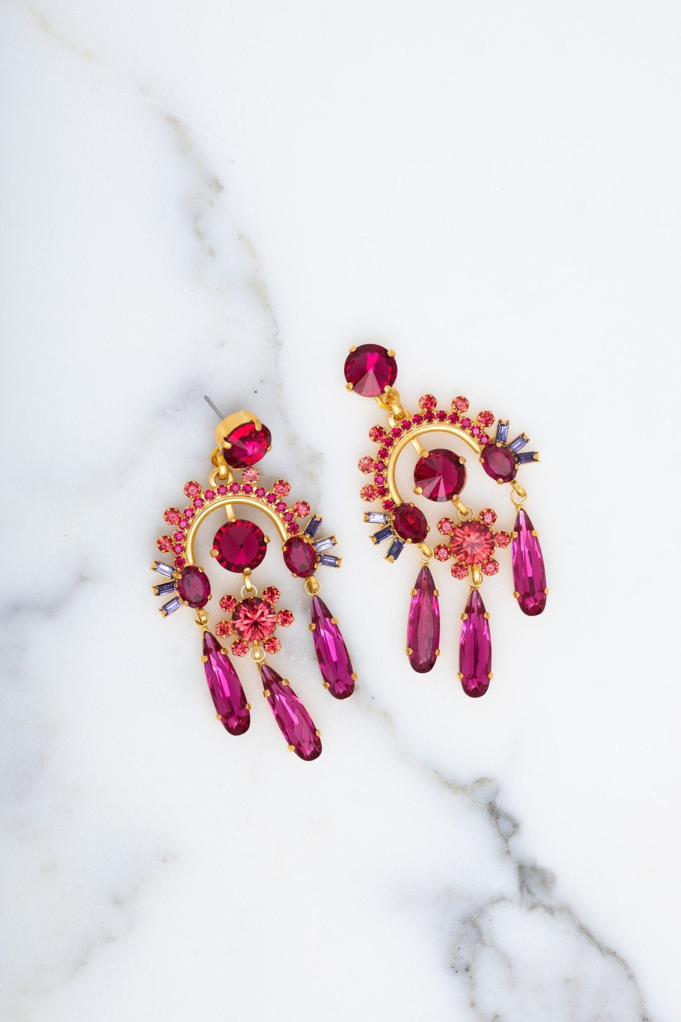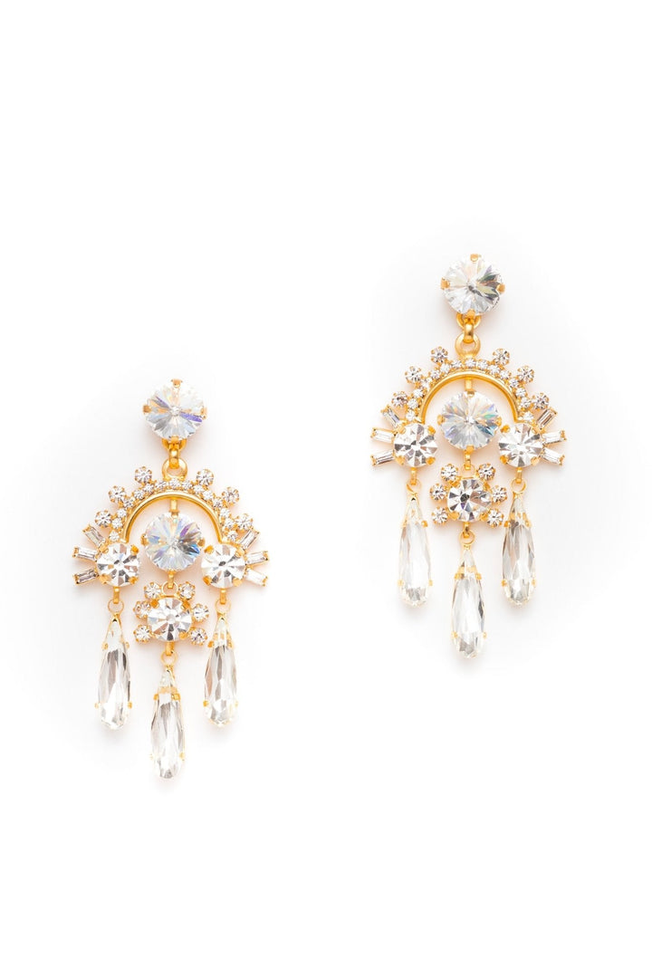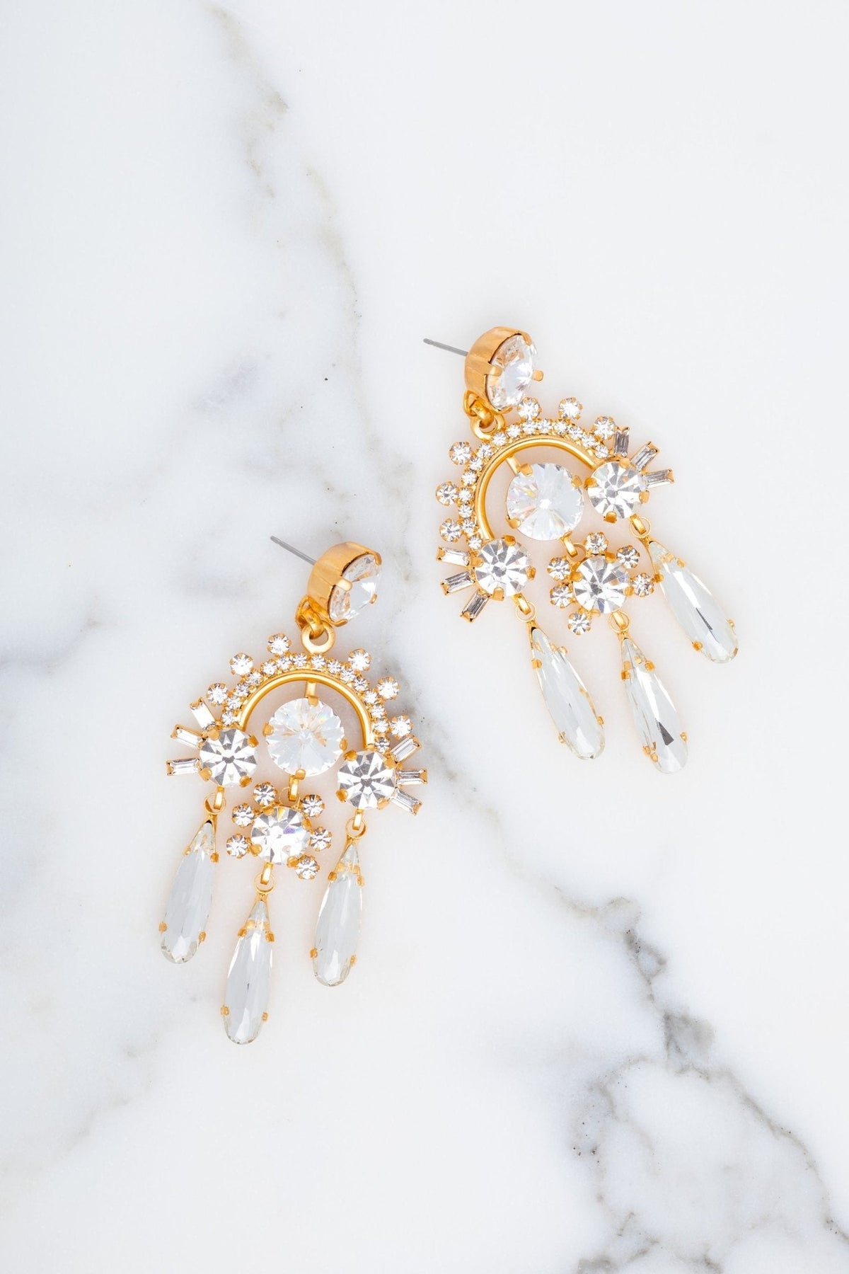 These Seren Earrings by Elizabeth Cole shimmer with sprays of baguette stones and a dazzling pear crystal fringe. These chandelier earrings make a statement, adding sparkle and elegance to your look. Proudly made in the USA.