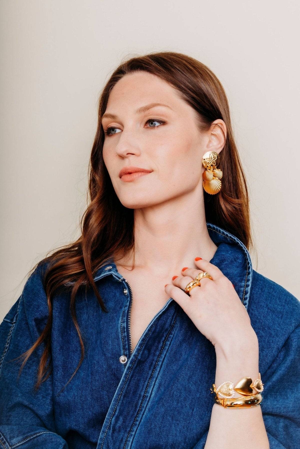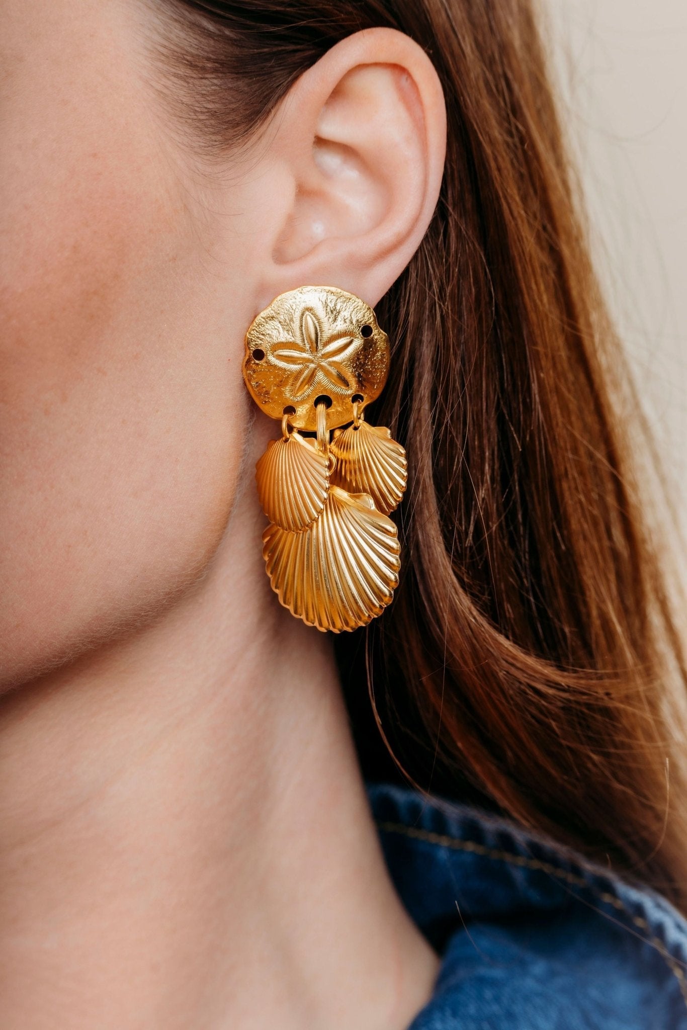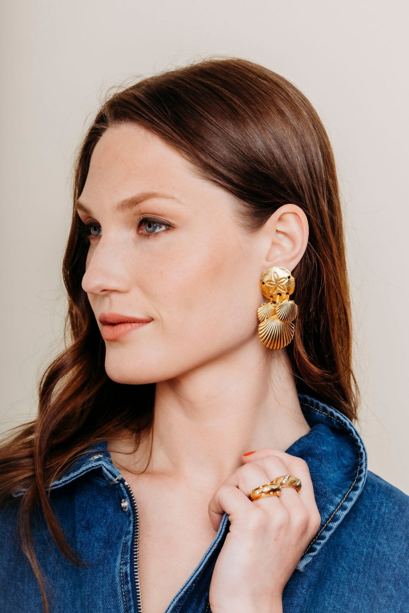 These Shellette Earrings by Elizabeth Cole feature delicate sand dollars and scalloped shells, making them the perfect beach-inspired accessory for any outfit. Proudly made in the USA.