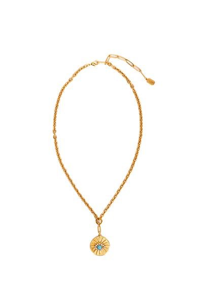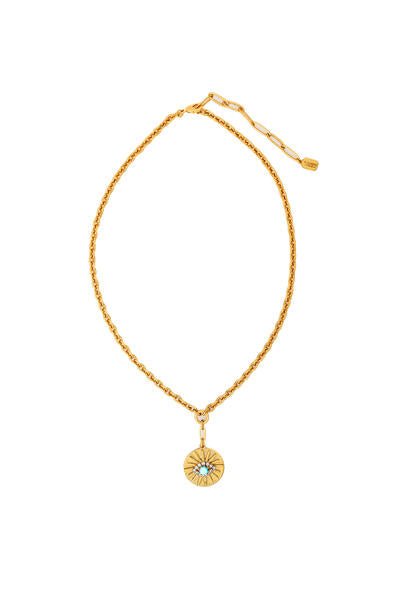 This Sid Necklace by Elizabeth Cole lets you unleash your bold side with a striking sunburst evil eye pendant, embellished with dazzling crystals and a faux turquoise center. This piece adds a touch of protection and style, making it a standout addition to any outfit. Proudly made in the USA.