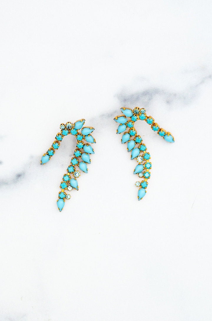 These Solana Earrings by Elizabeth Cole add a touch of elegance to any outfit with vintage blue pear-shaped stones and shimmering 24K gold plating. These drop earrings are perfect for making a statement. Proudly made in the USA.
