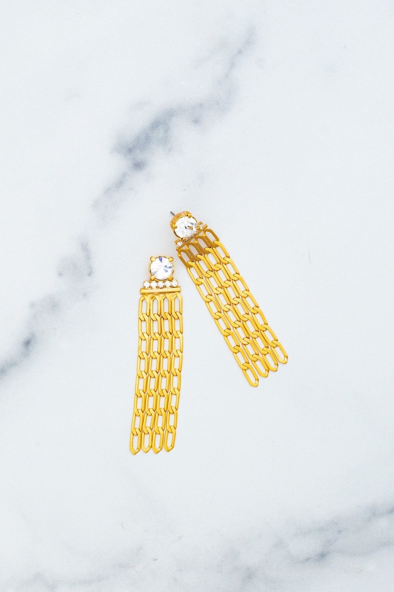 These Sonny Earrings by Elizabeth Cole are designed to make you shine with a golden curtain of links, topped with round and pavé crystals. These dazzling earrings bring a sparkling touch to any night. Proudly made in the USA.