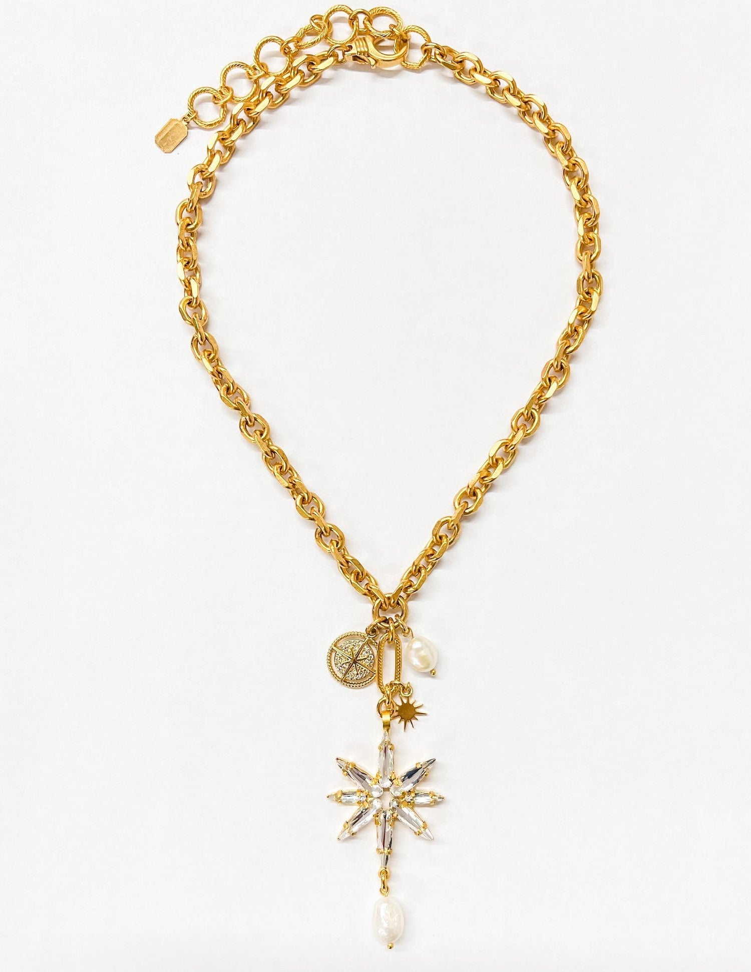 This Staria Necklace by Elizabeth Cole adds a touch of celestial elegance to any outfit with its open link design, featuring a crystal star dangle, two star charms, and two faux pearls for added charm. This unique and enchanting piece elevates your style with a dreamy, otherworldly flair. Proudly made in the USA.