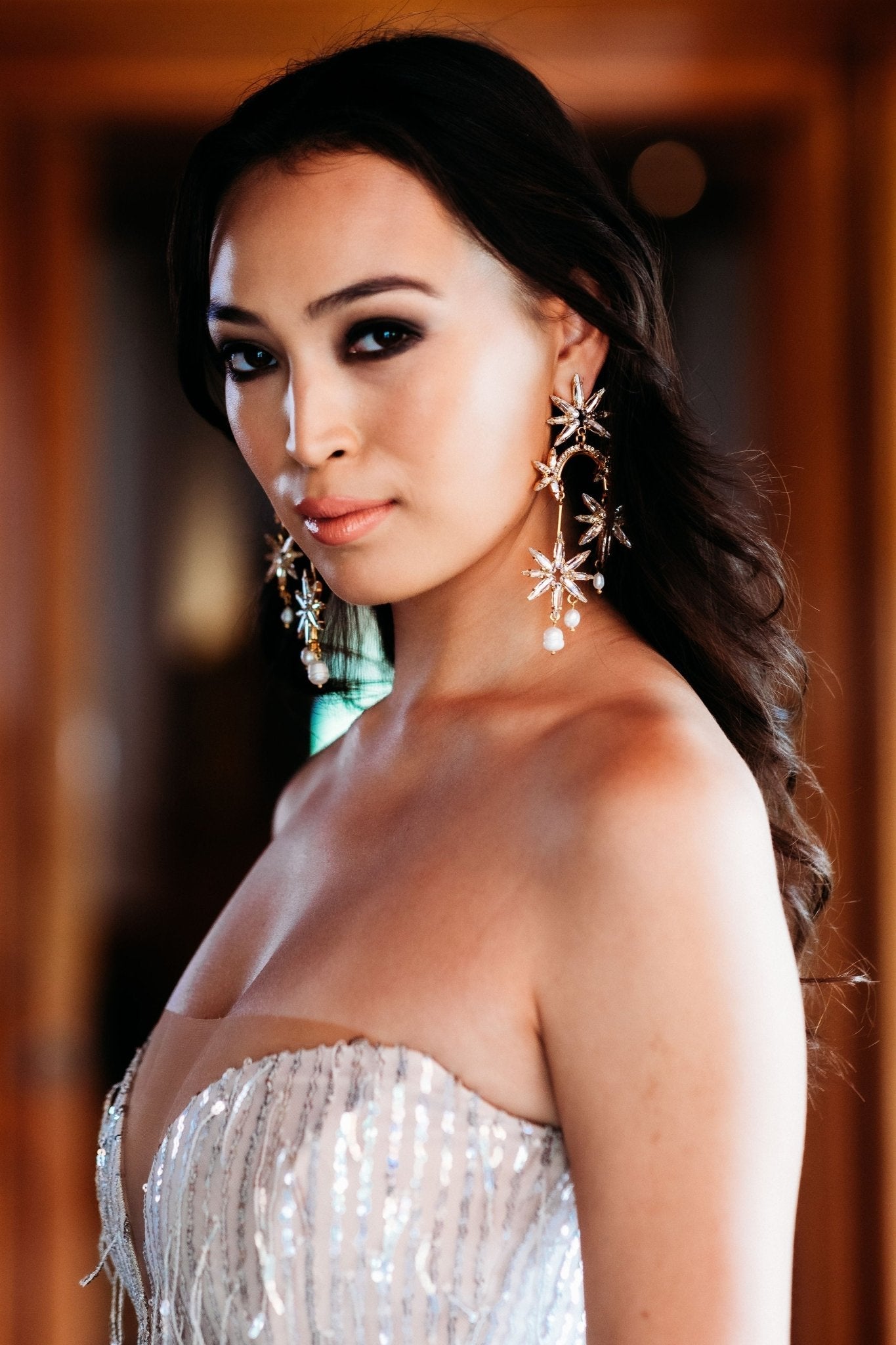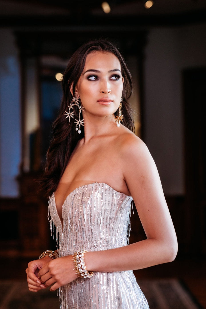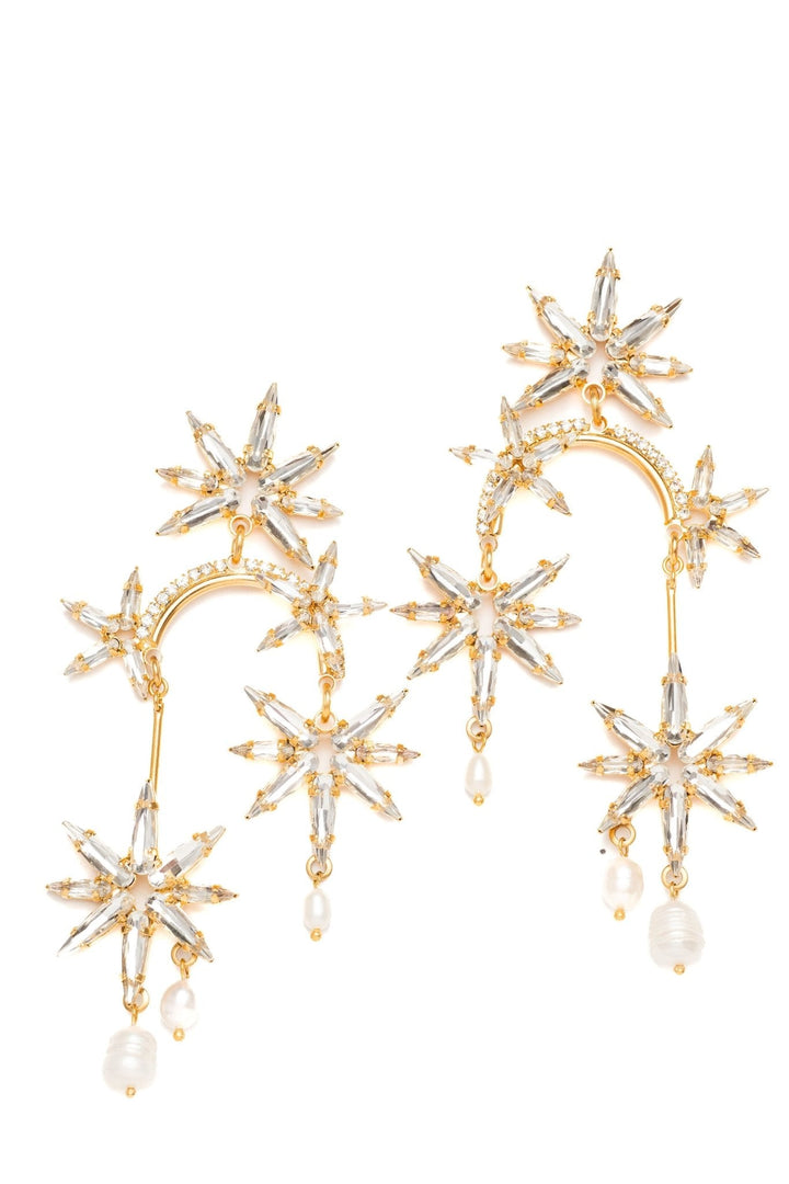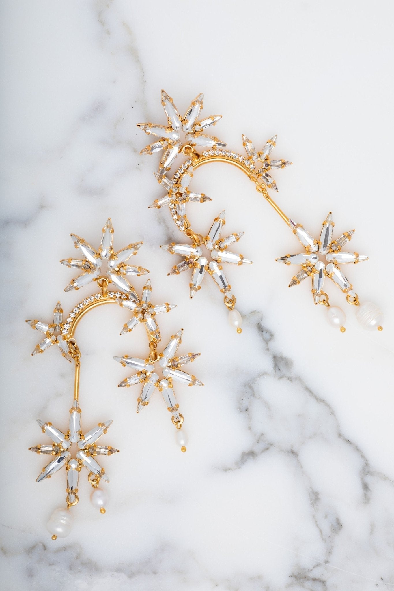 These Starlena Earrings by Elizabeth Cole make a bold statement with a constellation of crystal stars and luxurious pearls, creating an ethereal, glamorous look. Perfect for elevating any outfit with a celestial flair. Proudly made in the USA.