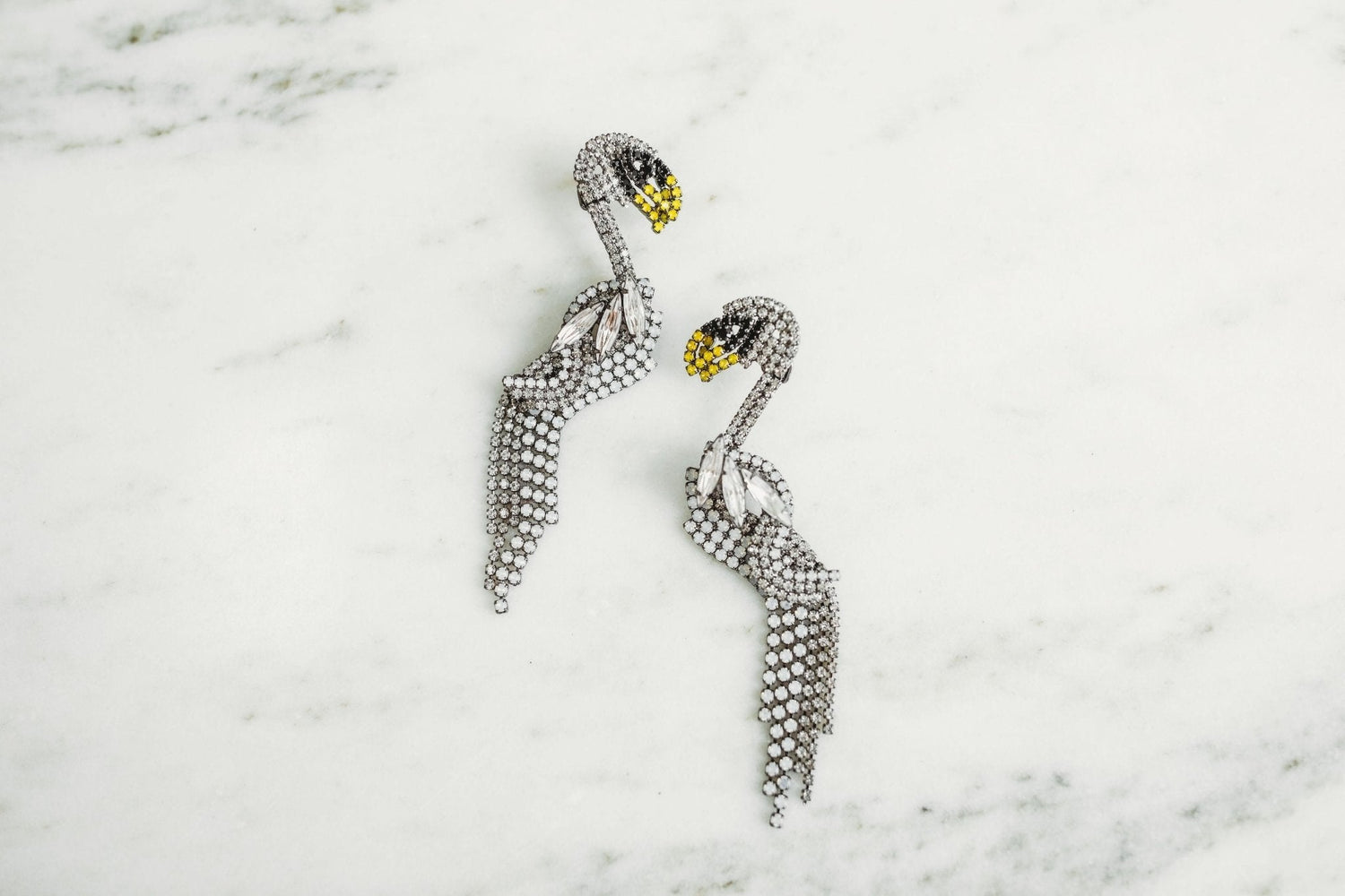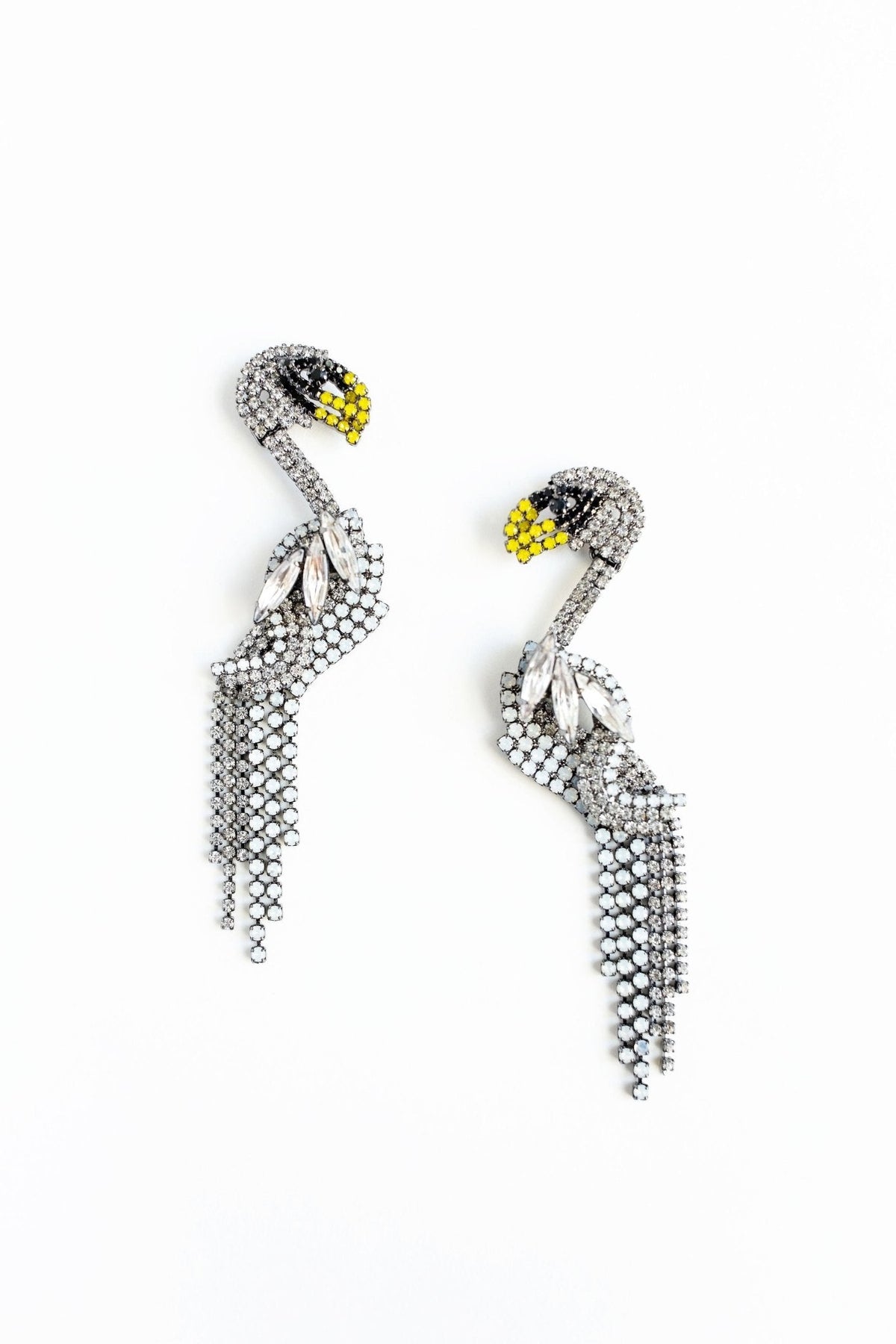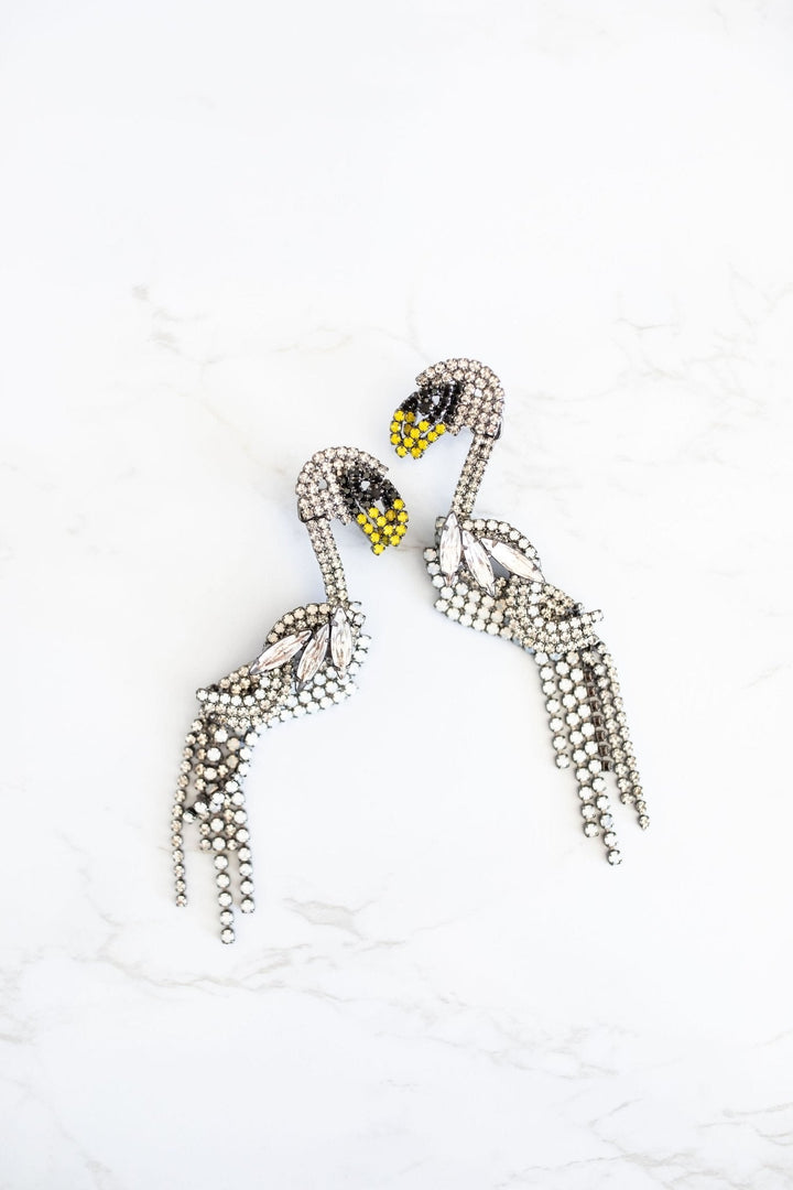 These Svenja Earrings by Elizabeth Cole capture the majesty of the swan with shades of crystal, white, and opalescent stones, featuring bright yellow beaks and brilliant sparkling wings. Proudly made in the USA.