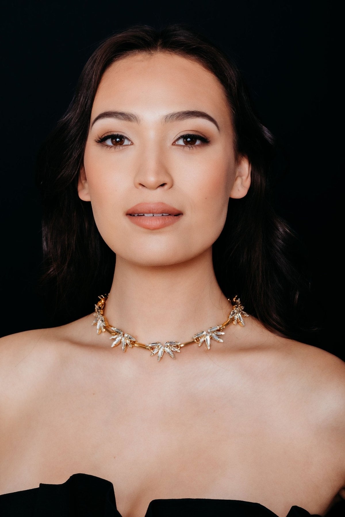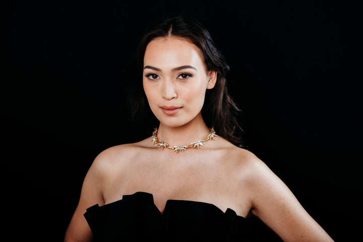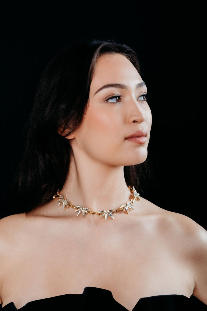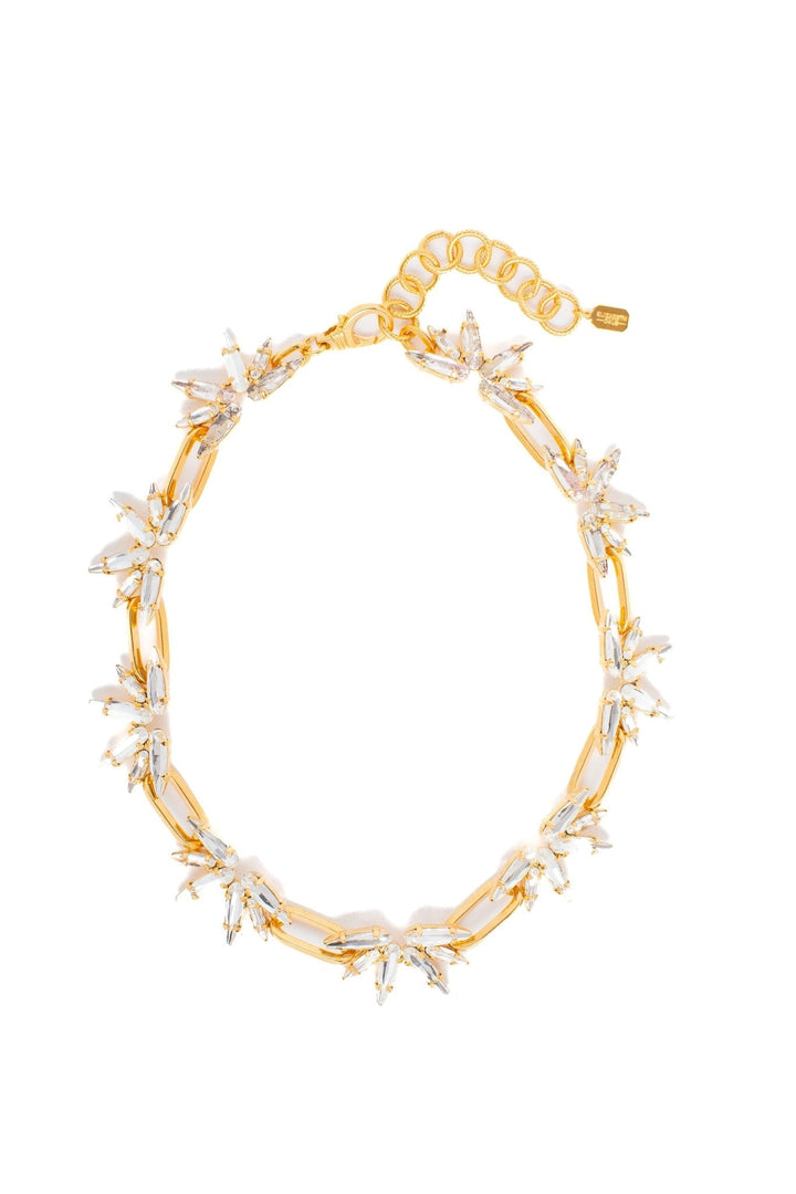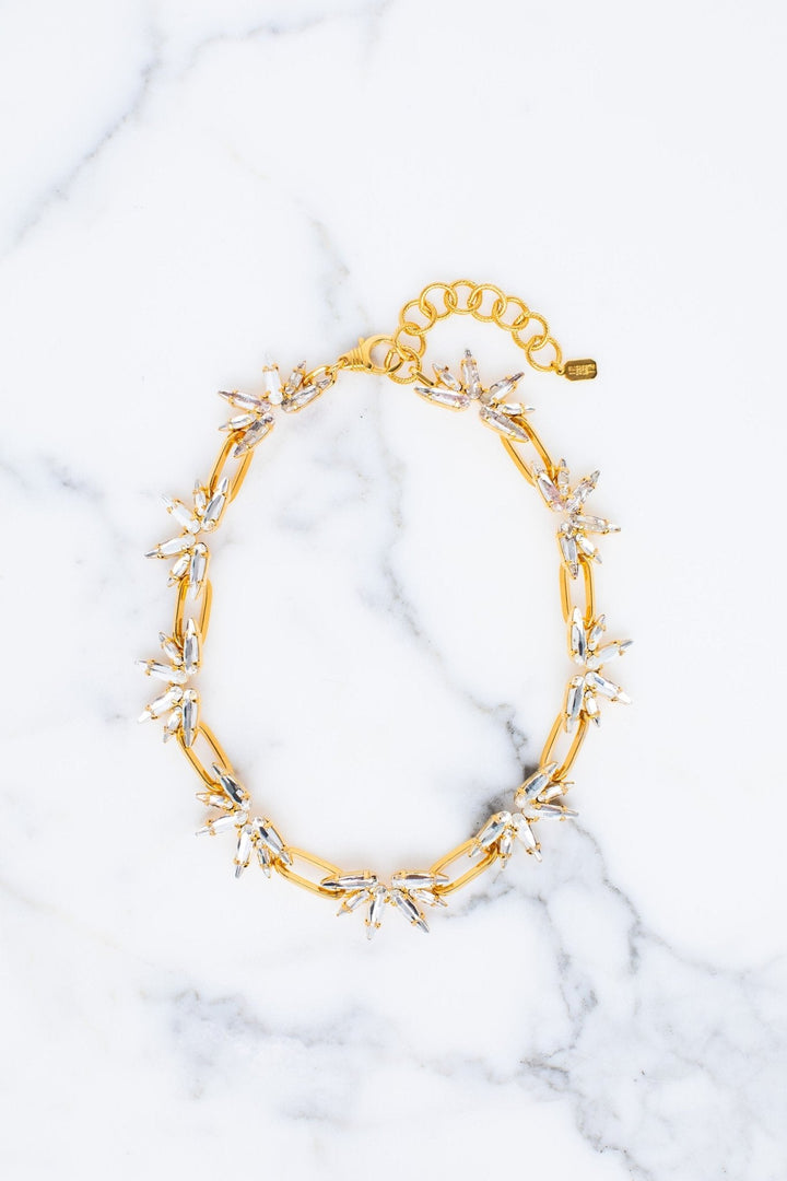 This Tania Necklace by Elizabeth Cole features sprays of shimmering marquis-cut crystals on 24K golden oval links, creating a bold and dazzling statement. Perfect for adding a touch of sophistication to any outfit. Proudly made in the USA.
