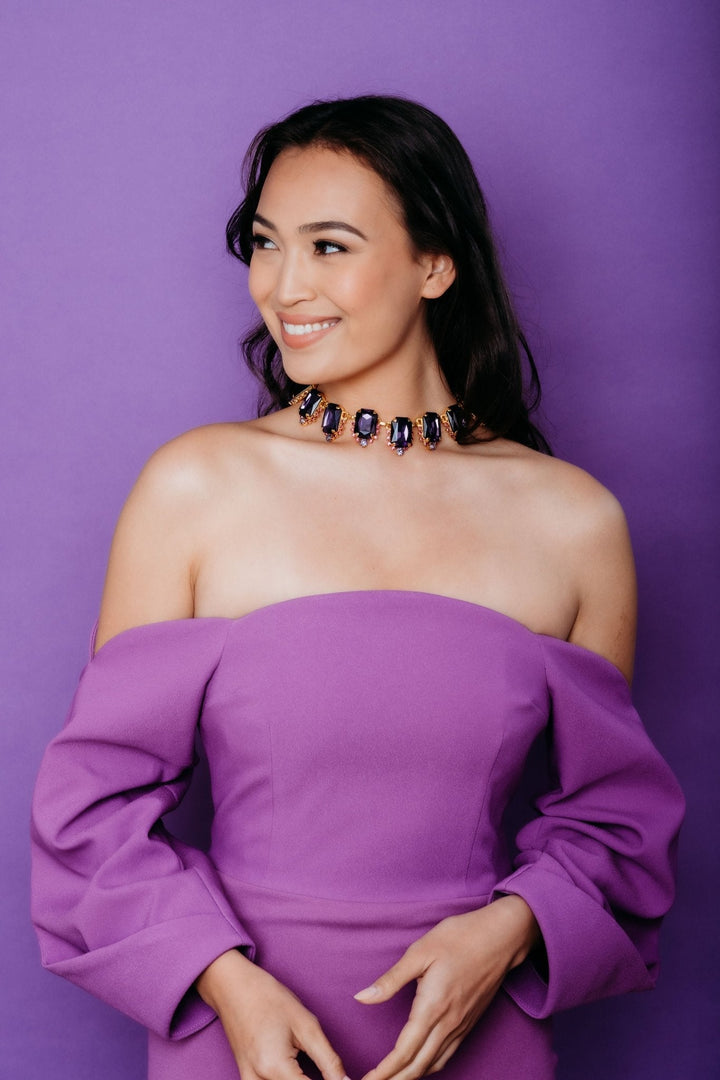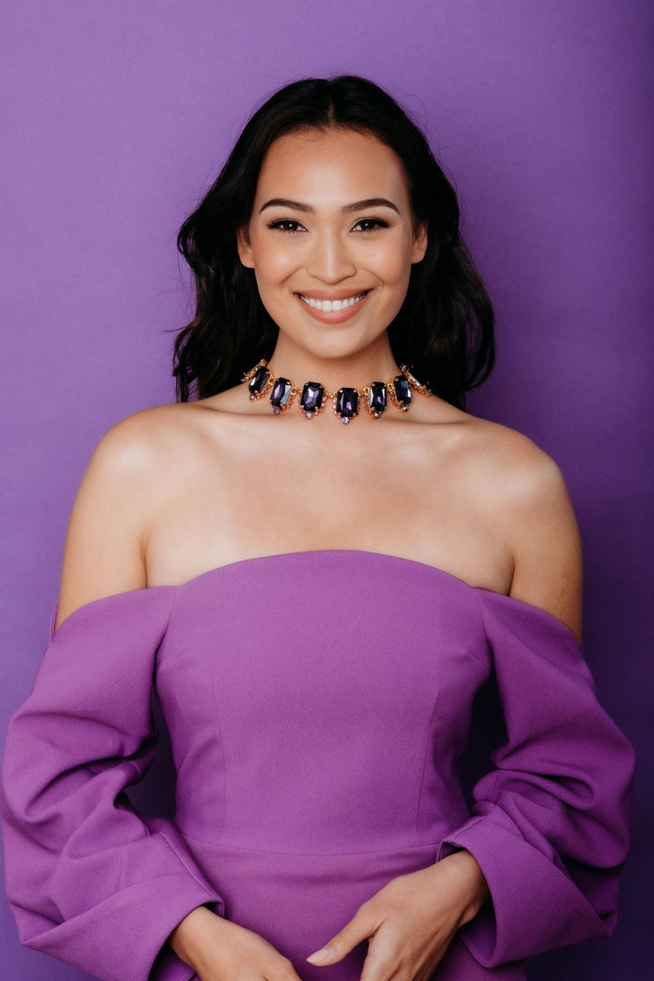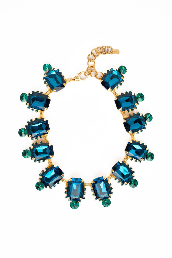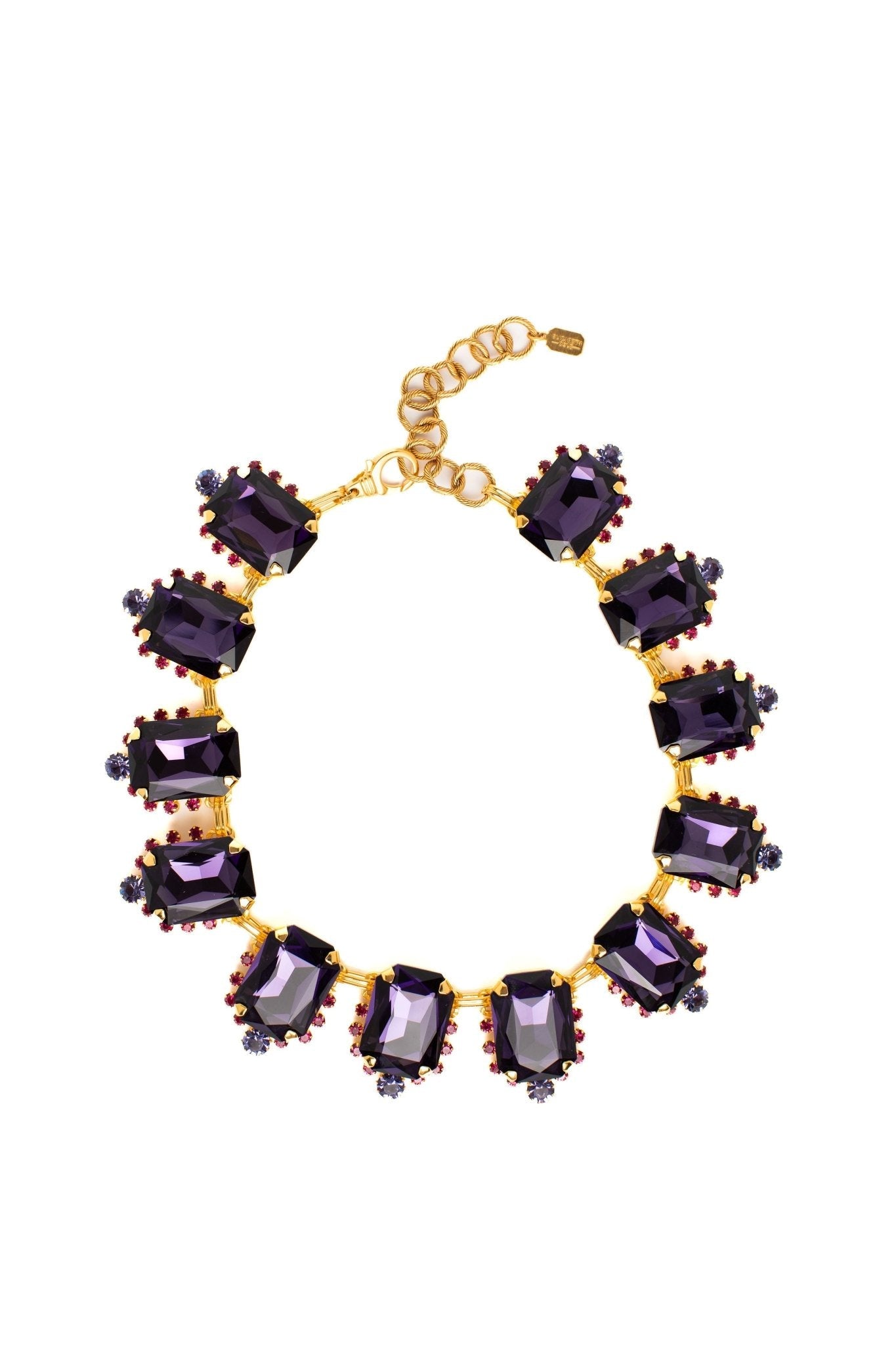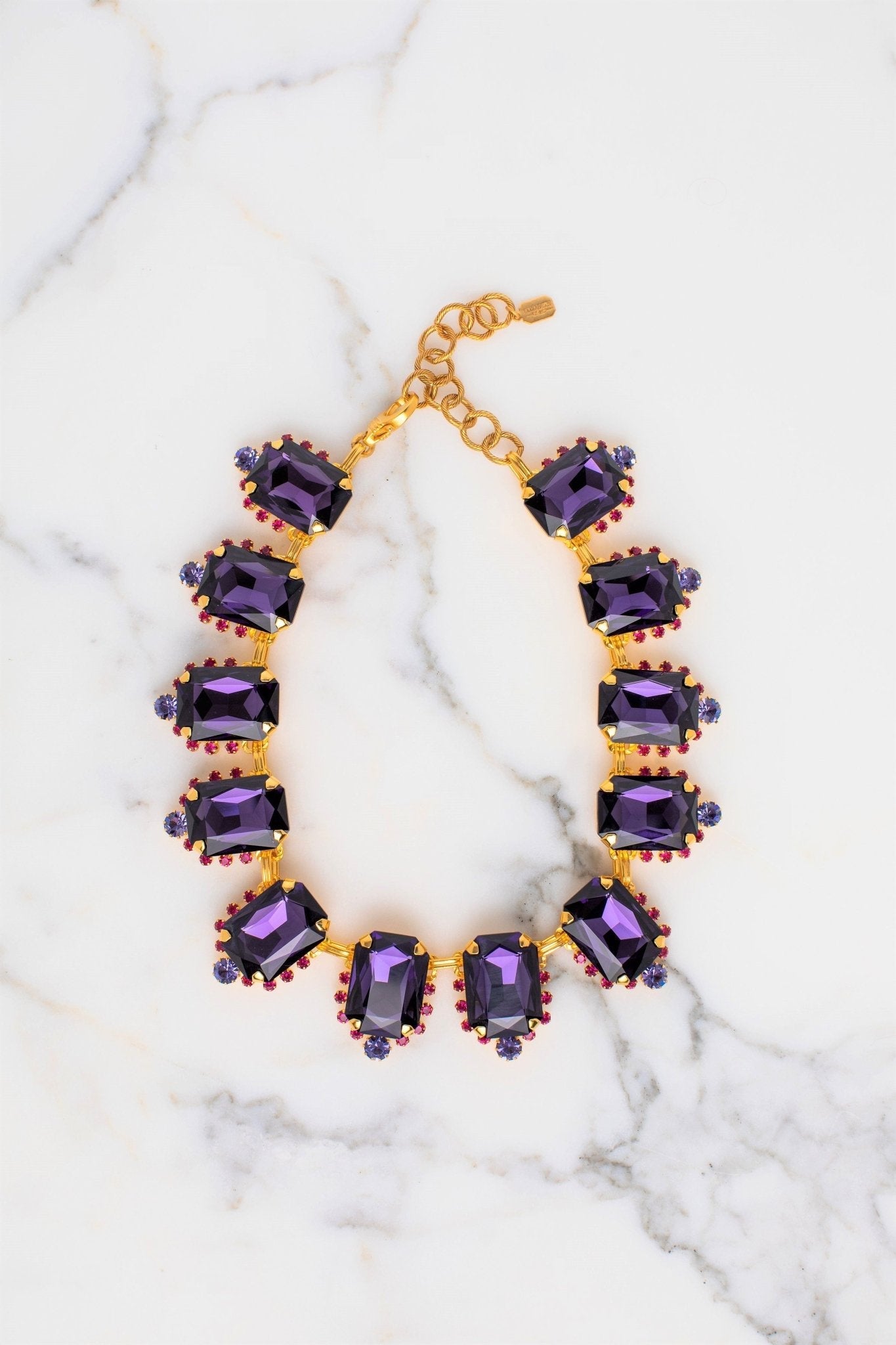 This Vanna Necklace by Elizabeth Cole brings daring allure to your look with oversized octagons and brilliant round Swarovski crystals in shades of purple, classic crystal, and blue. Golden links connect these eye-catching elements to create a timeless, risk-taking piece. Dare to sparkle with this statement necklace. Proudly made in the USA.