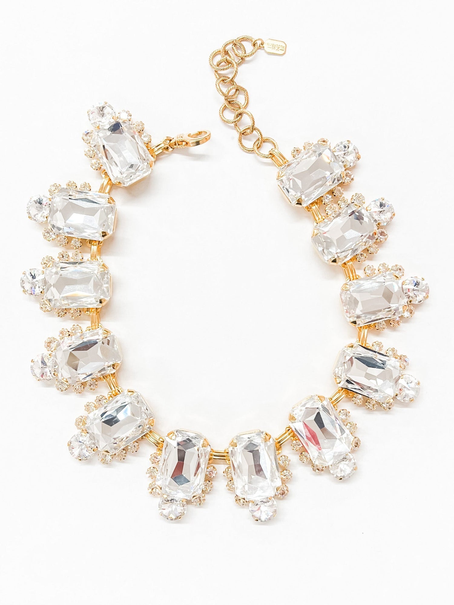Swarovski crystals, premium crystals, 24K gold plate, lobster claw closure, measuring 14 inches with a 3-inch extender.