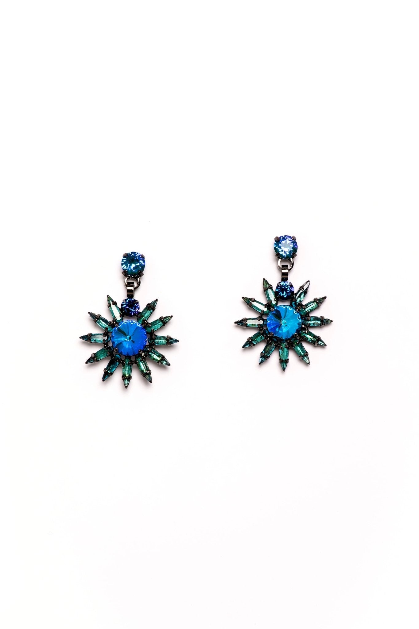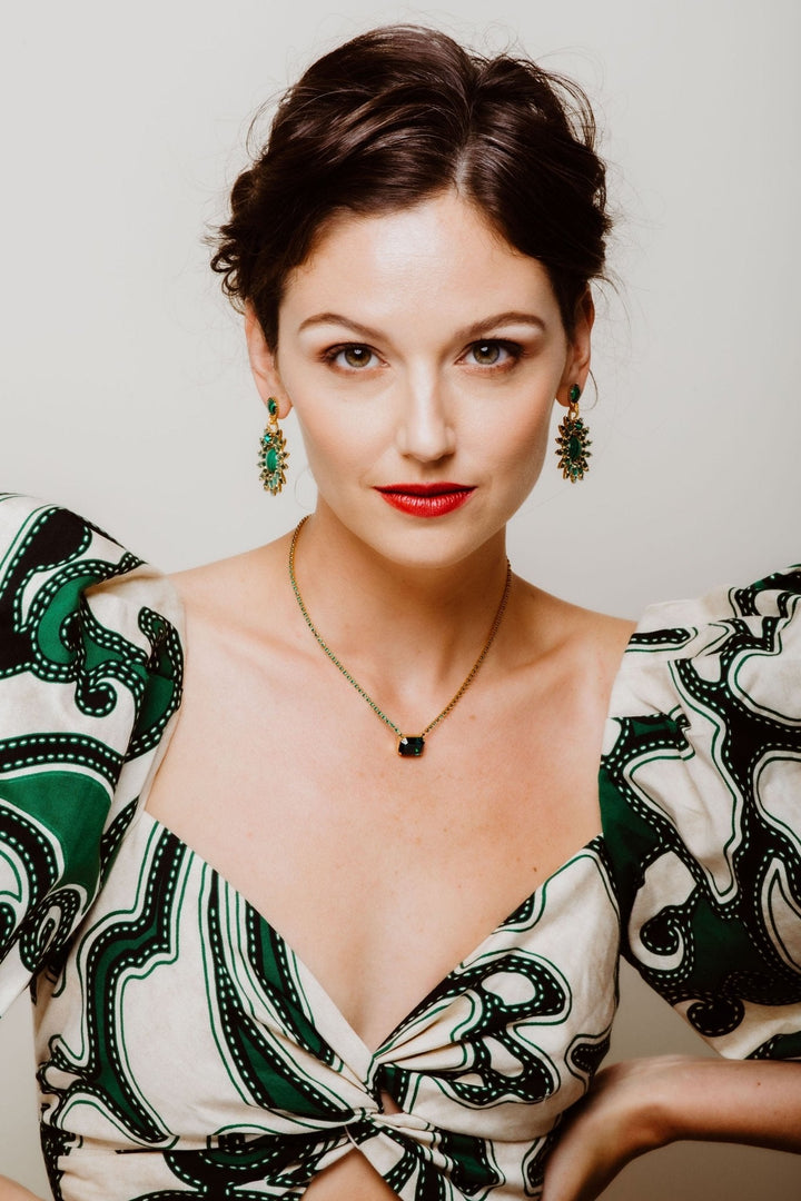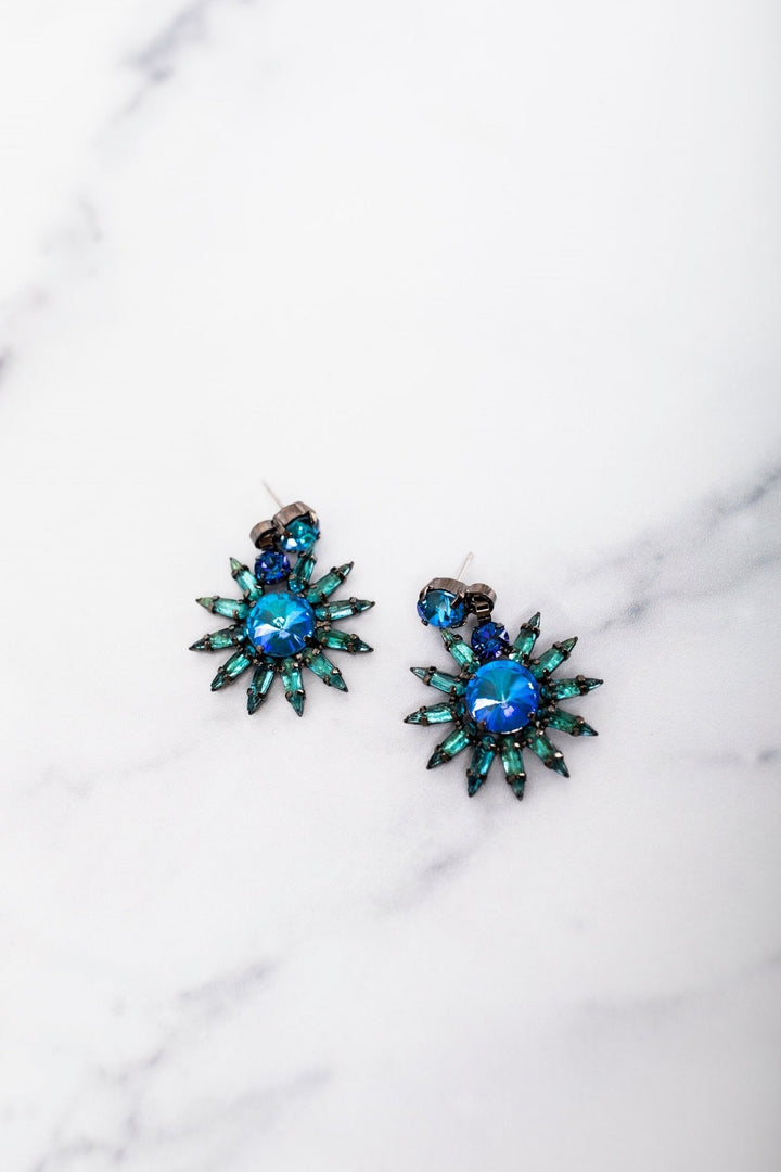 These Viona Earrings by Elizabeth Cole feature a playful double drop design with graduated round stones flanked by elongated pears, creating a striking look. Available in Bermuda blue and deep green hues, these earrings add a touch of fun and elegance to any outfit. Proudly made in the USA.