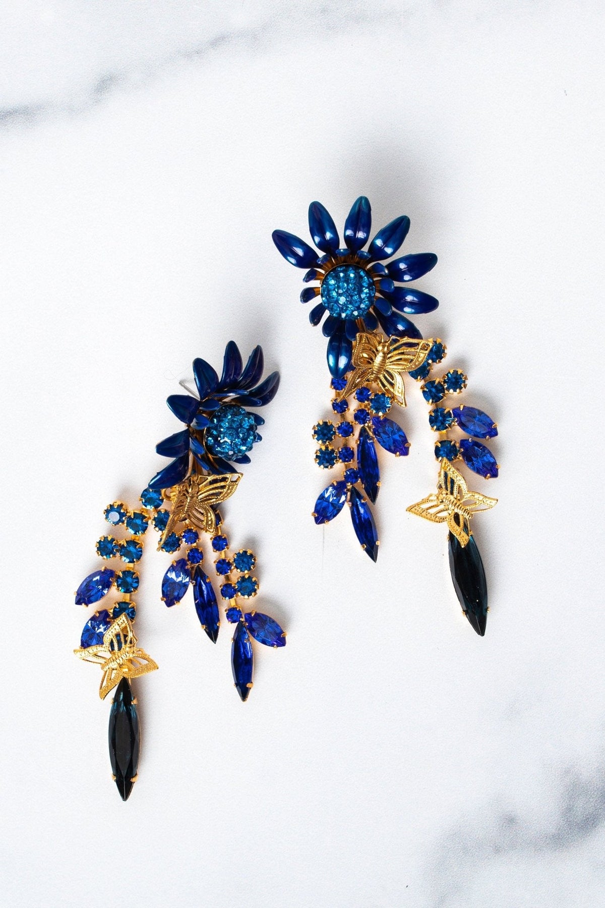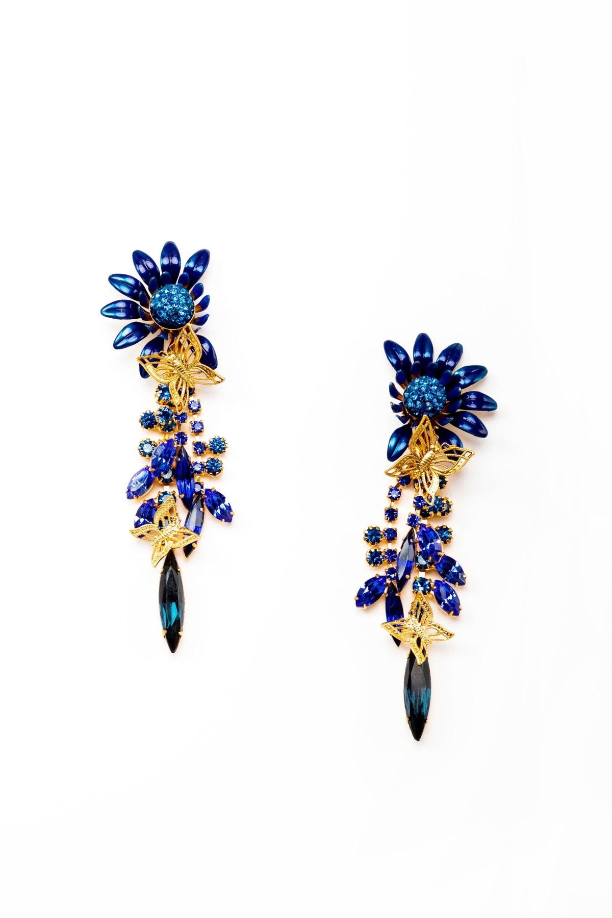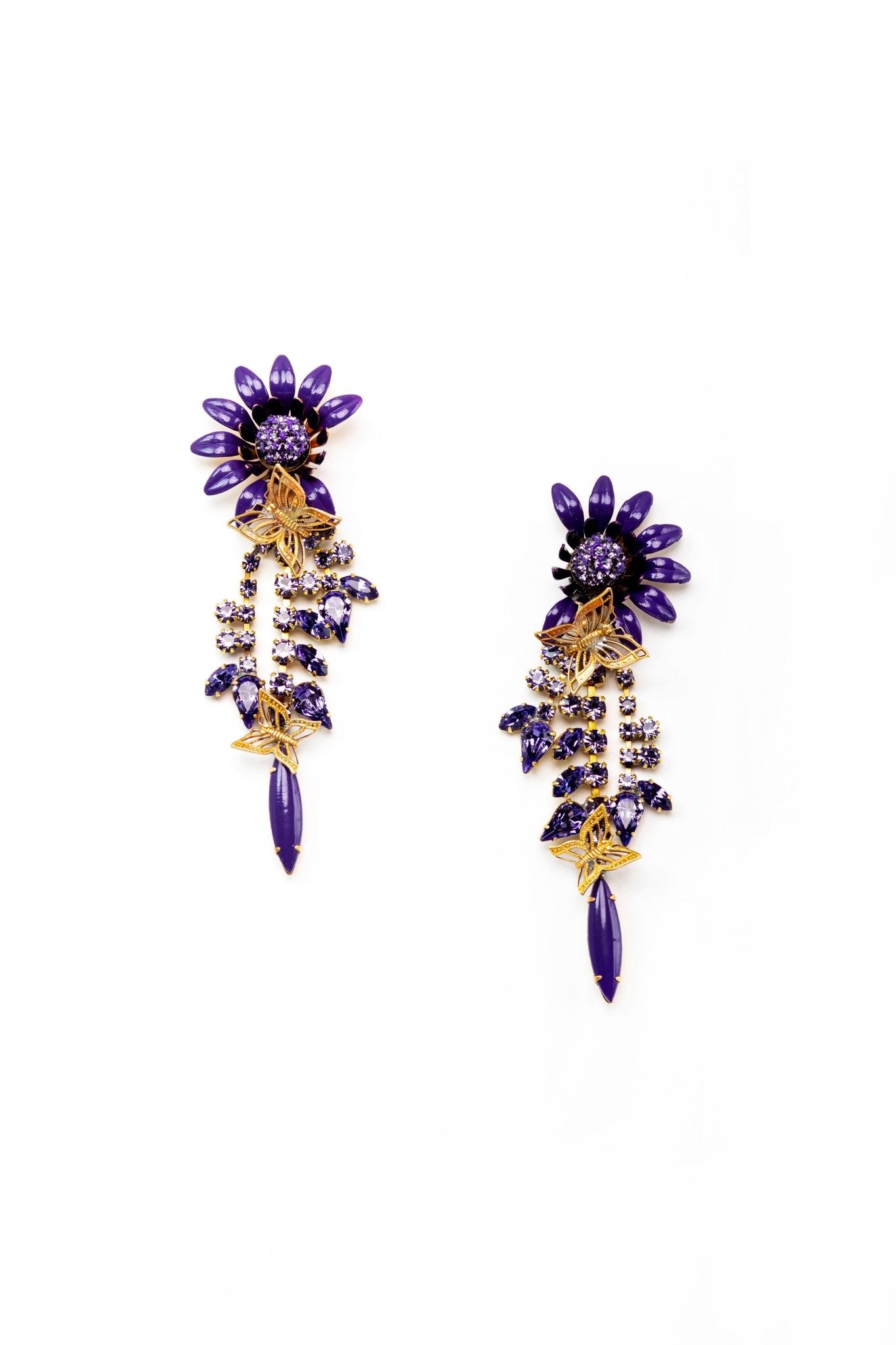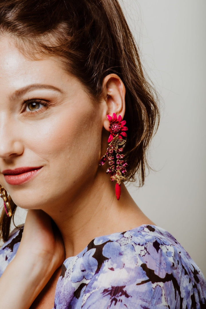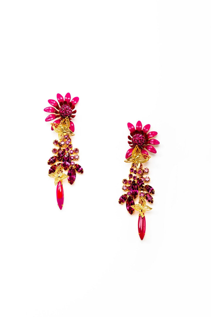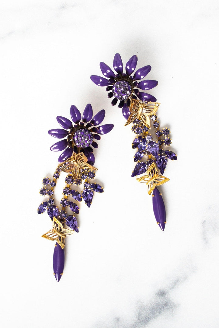 These Winnie Earrings by Elizabeth Cole feature an oversized colorful flower with glittering centers, complemented by crystal stems and leaves, topped with petite golden butterflies. Available in blue, pink, and purple, these earrings add a bold and whimsical touch to any outfit. Perfect for making a statement with playful elegance. Proudly made in the USA.