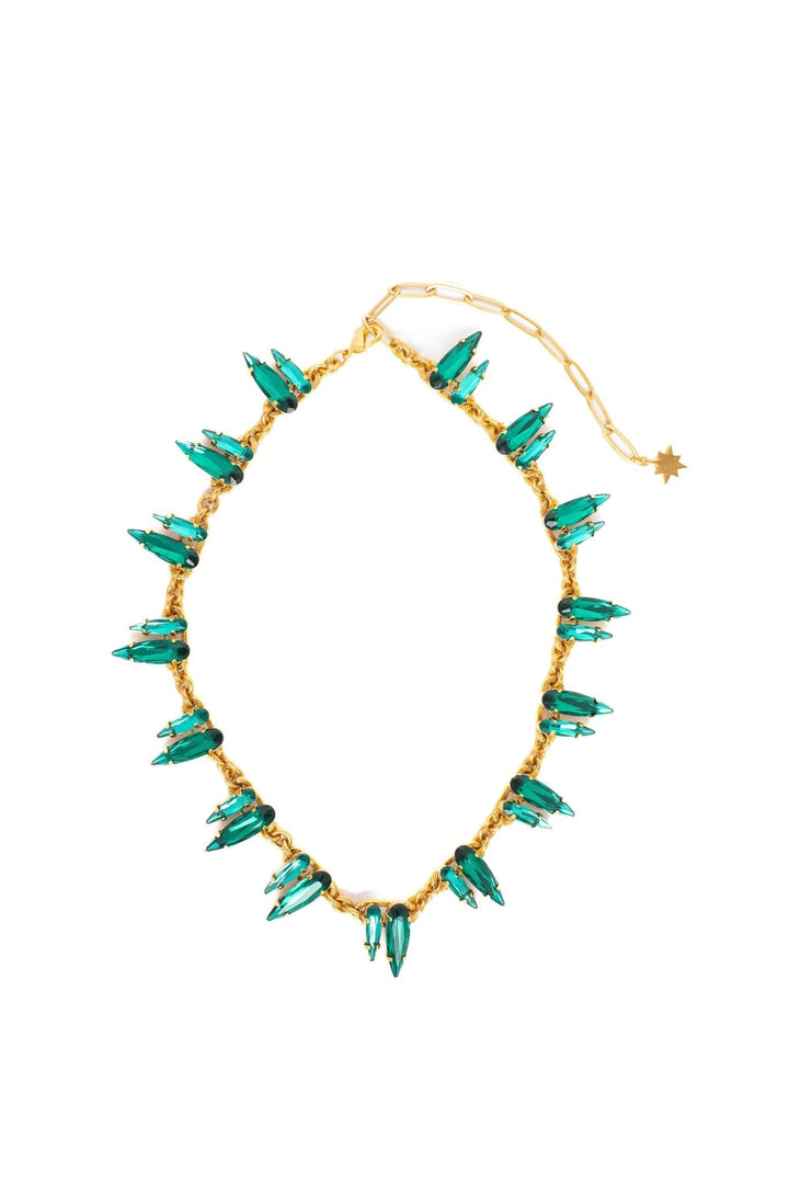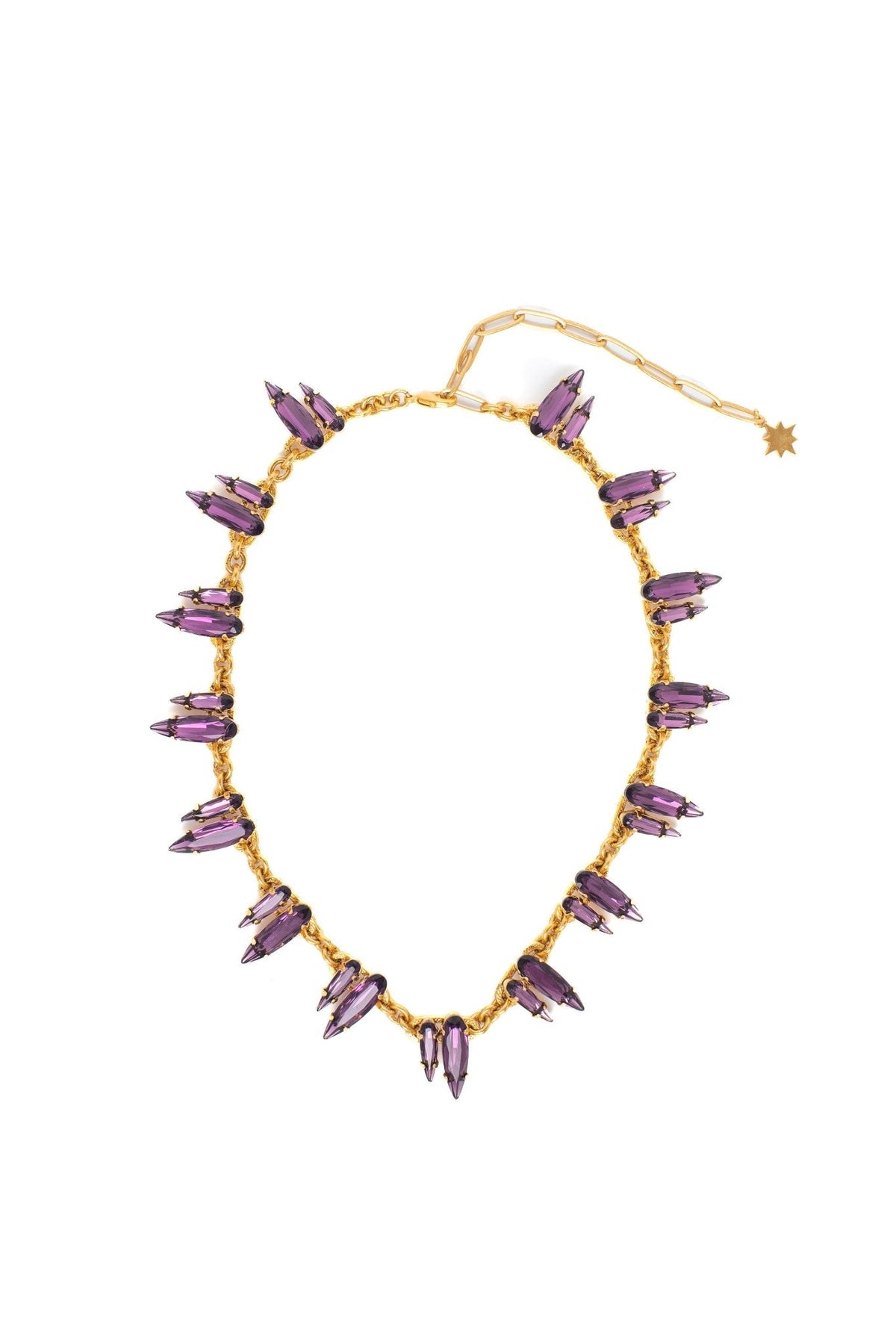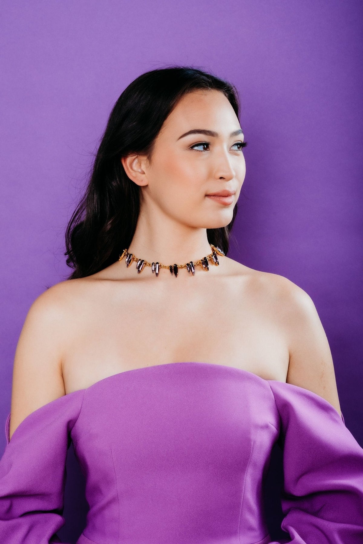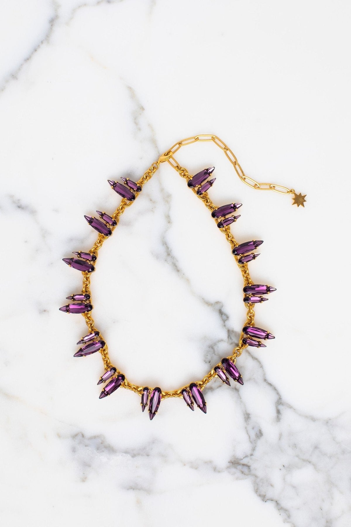 This Xylah Necklace by Elizabeth Cole is the perfect statement piece for those who love to take risks with their style. Featuring clusters of alternatingly sized pear-shaped crystals connected by golden links, it adds bold elegance to any outfit. Available in four hues: green, purple, pink, and crystal, this necklace allows you to choose your own adventure. Proudly made in the USA.