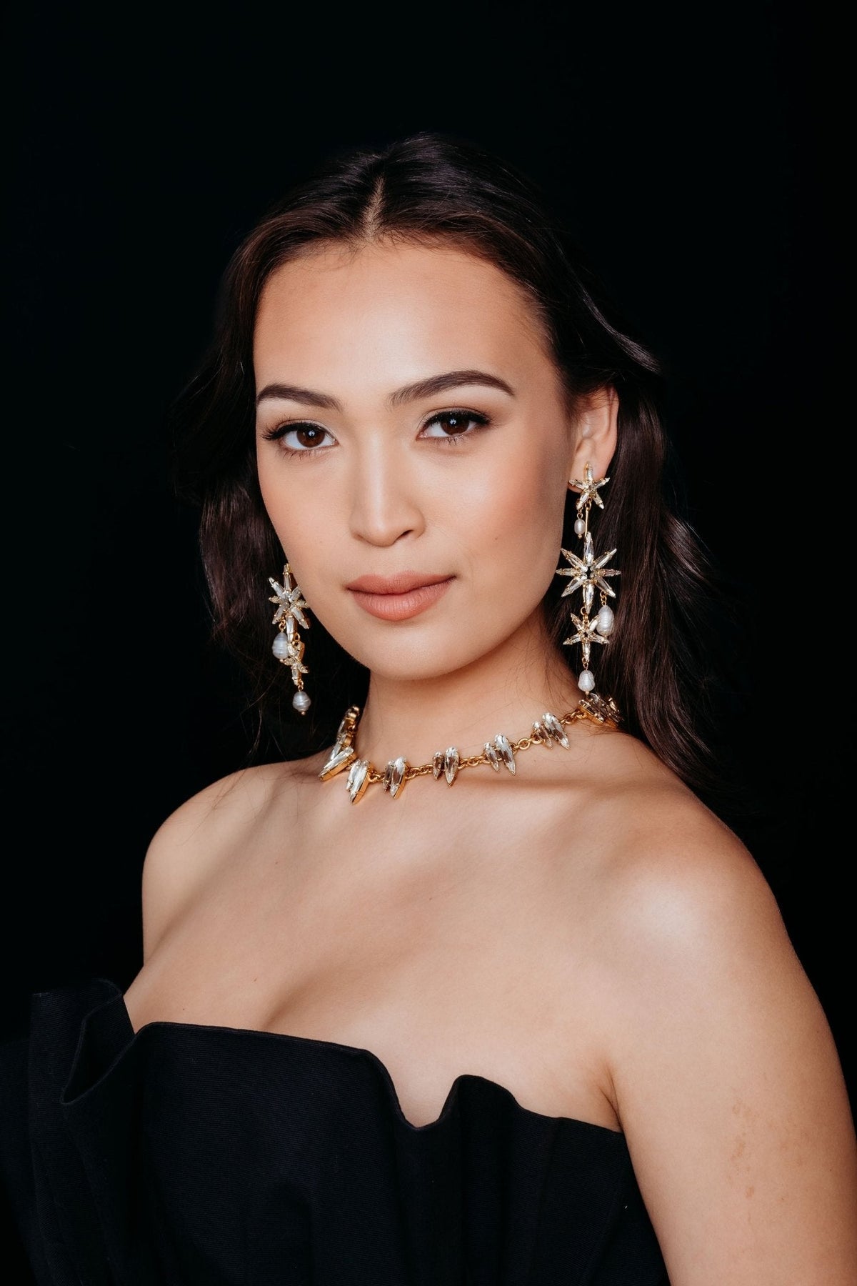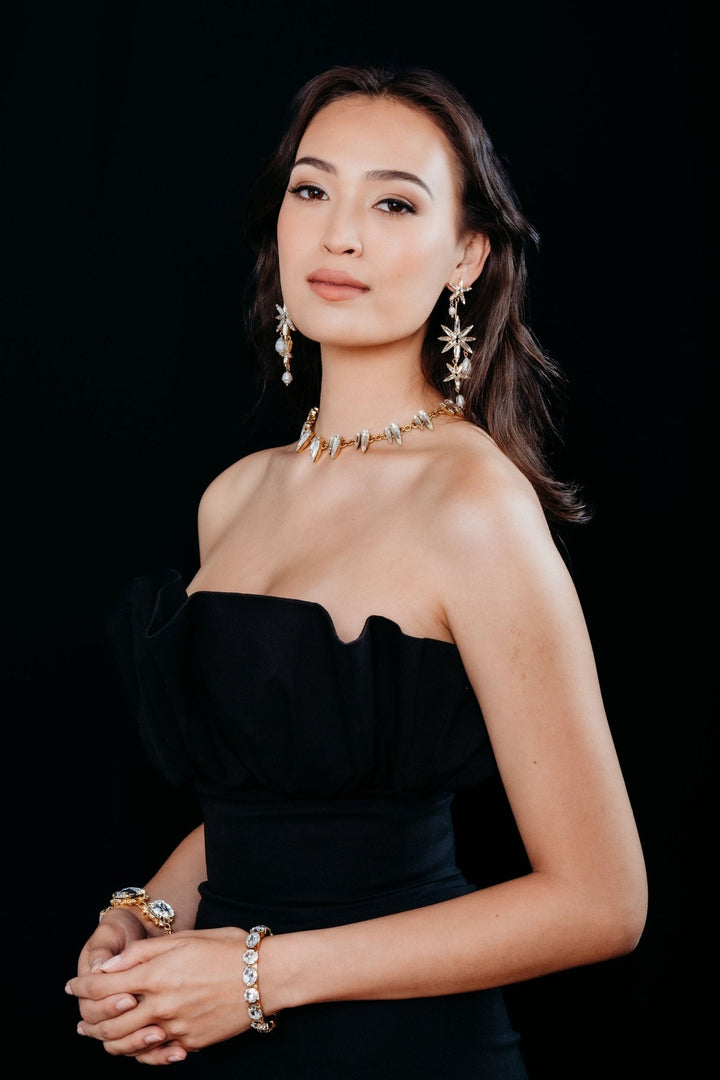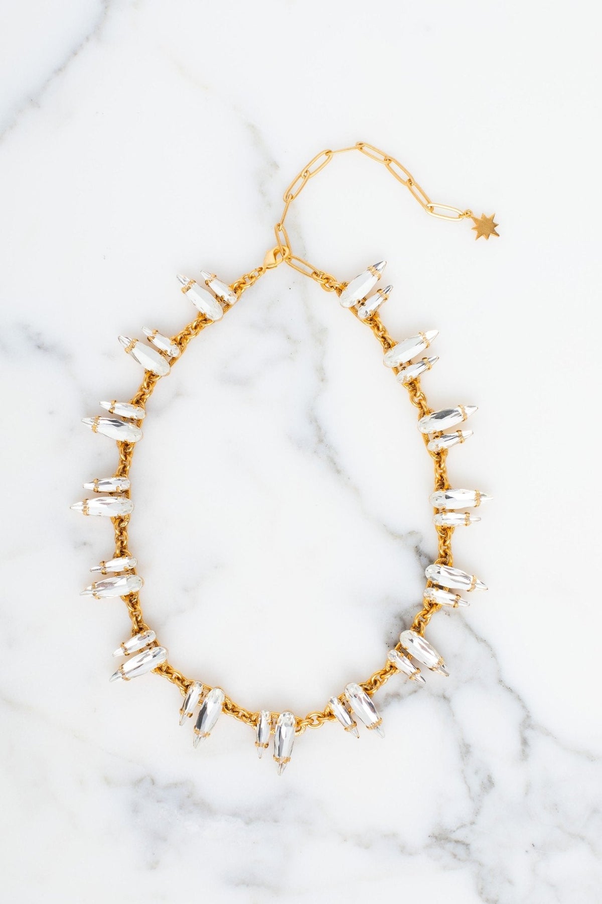 Premium crystals, 24K gold plate, lobster claw closure, handcrafted in the USA.
