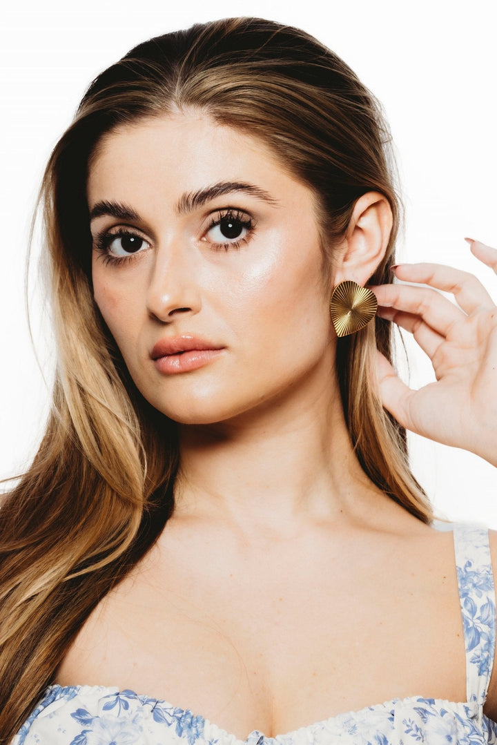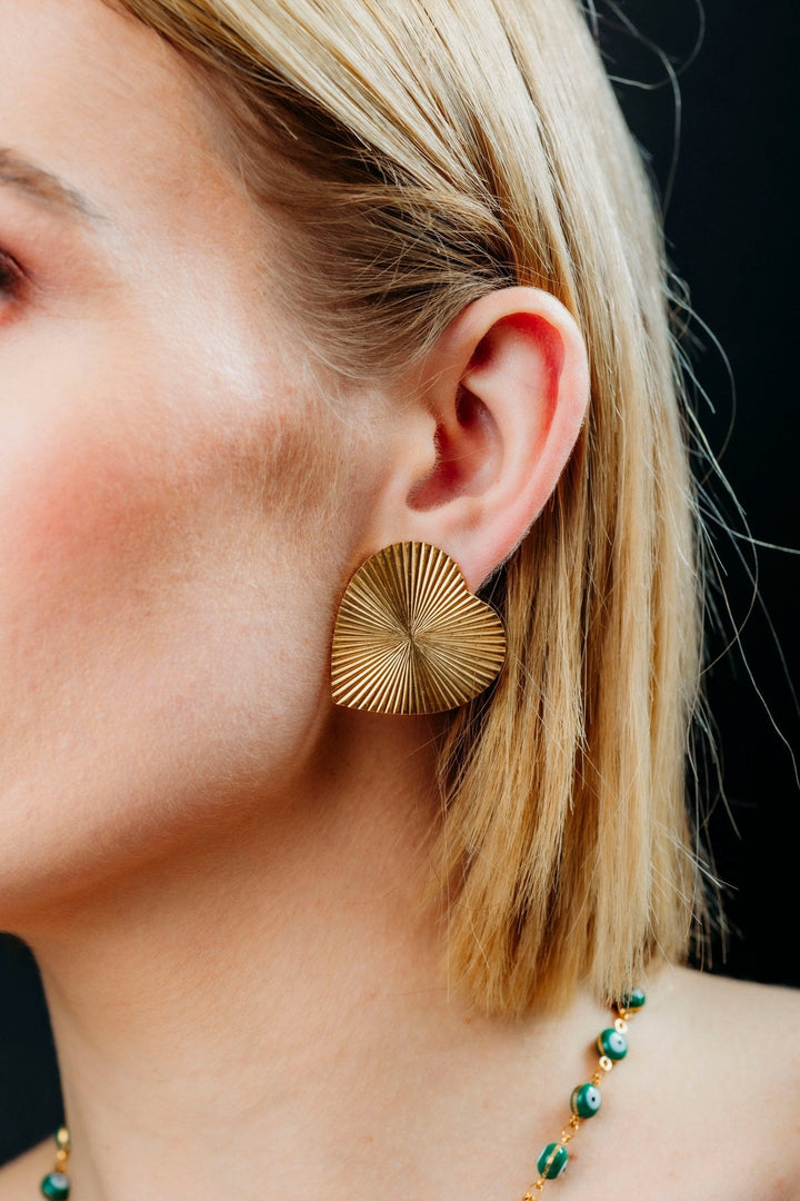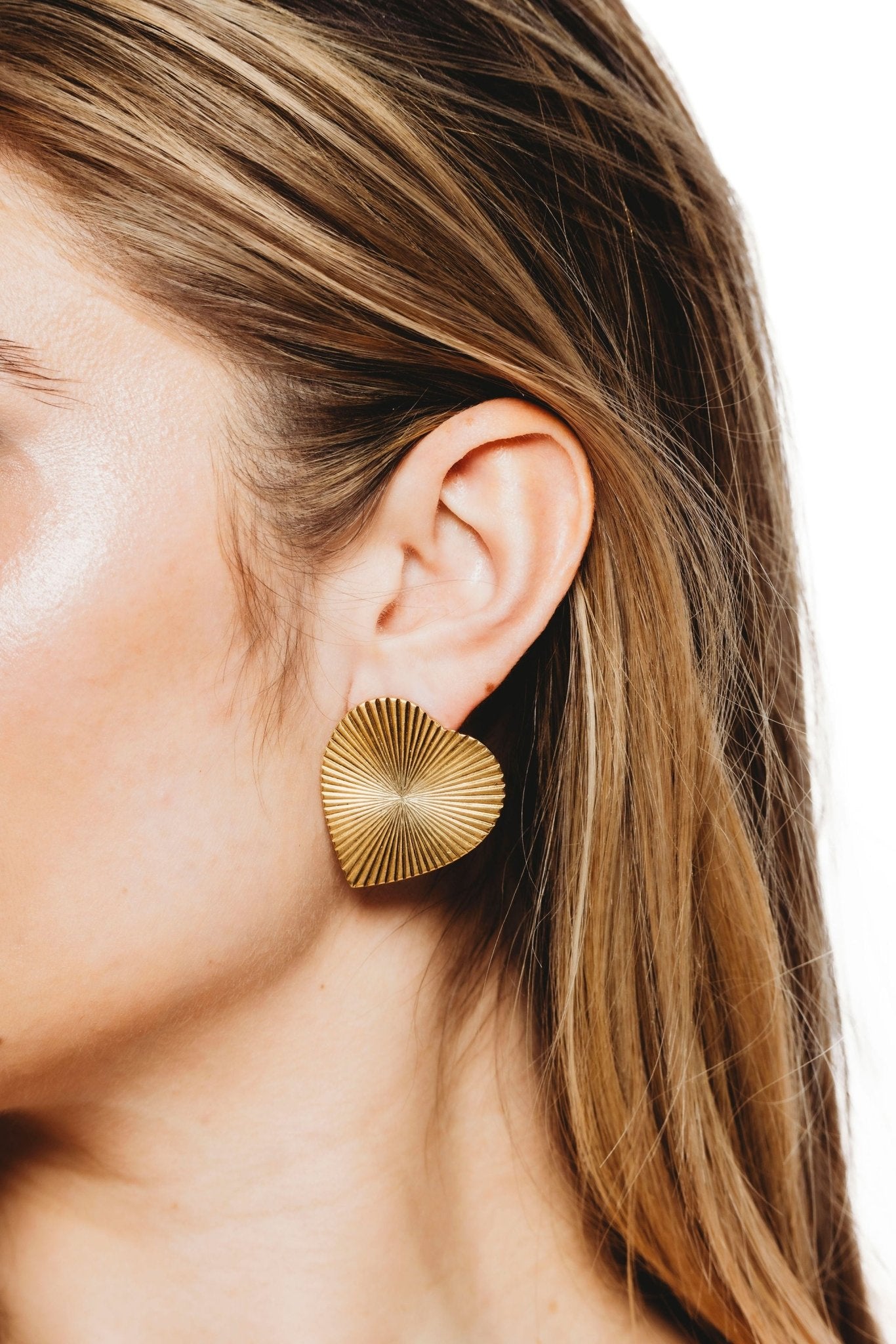 These Xyra Earrings by Elizabeth Cole add a touch of elegance with their heart-shaped design and unique starburst pattern. The angled placement on the ear offers a modern and chic twist, making these earrings perfect for elevating your style with a sophisticated edge. Proudly made in the USA.