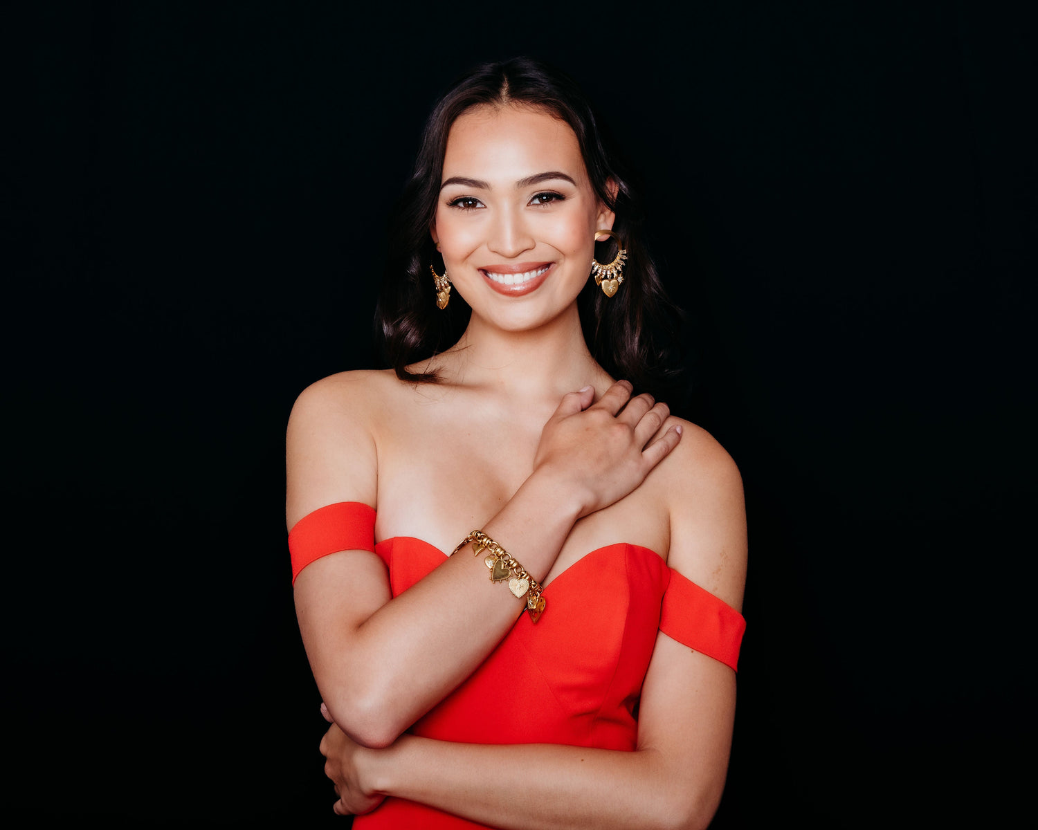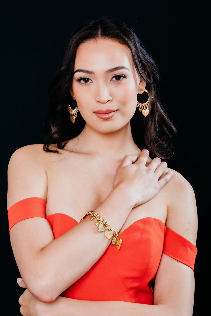 These Zinnia Earrings by Elizabeth Cole bring a bold and stylish flair with front-facing hoops adorned with marquis-shaped crystals and a fringe of golden heart charms. Perfect for stepping into the spotlight, these earrings make you feel like a star with their 24K gold-plated finish. Proudly made in the USA.