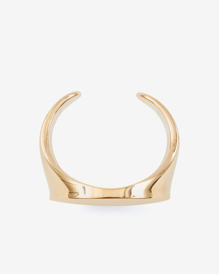This Quincy Bracelet by Isabel Marant — A wide cuff bracelet in gold-finish brass with an elegant, semi-open oval shape. Its refined silhouette offers versatility, perfect for layering or making a statement on its own.