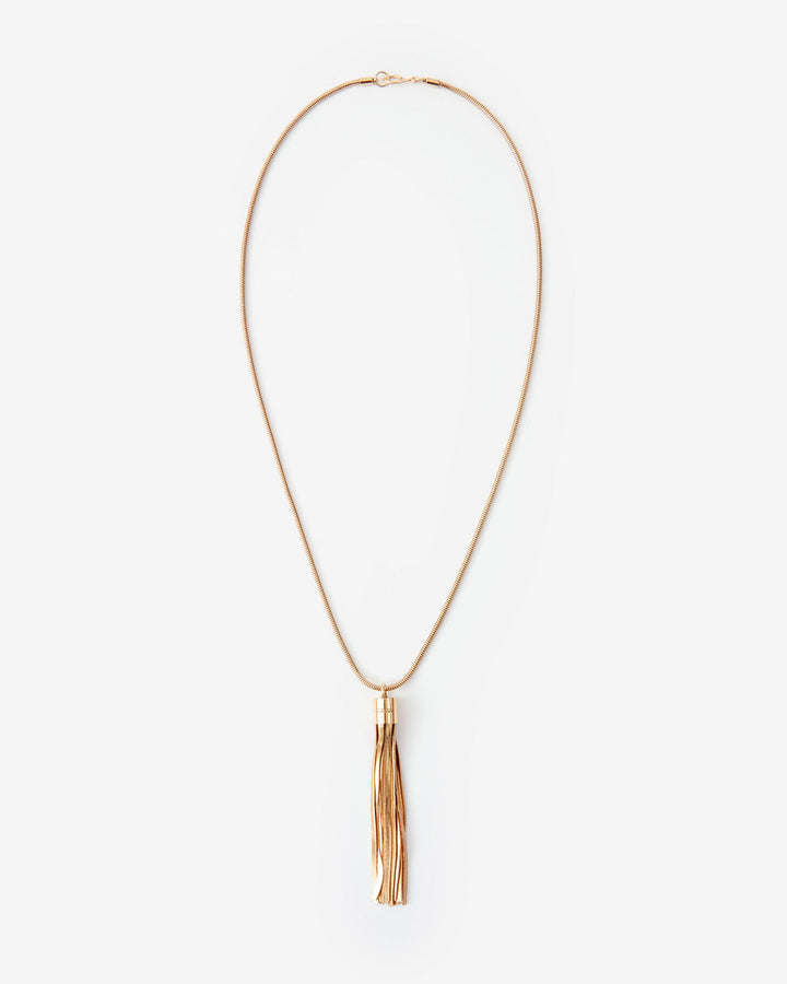 Crafted in gold-finish brass with a snake chain tassel pendant. Features a ring and hook clasp and Isabel Marant engraving.