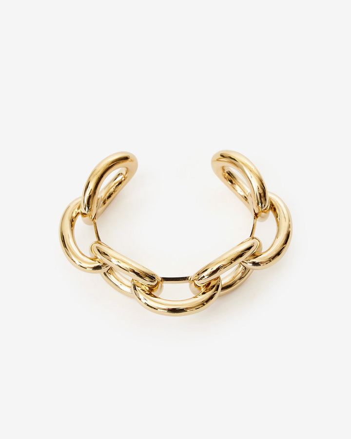 This Bardeny Bracelet by Isabel Marant is a rigid cuff bracelet with link details in gold-finish brass. Its structured shape and engraved logo on the inside give it a luxurious and bold appeal.