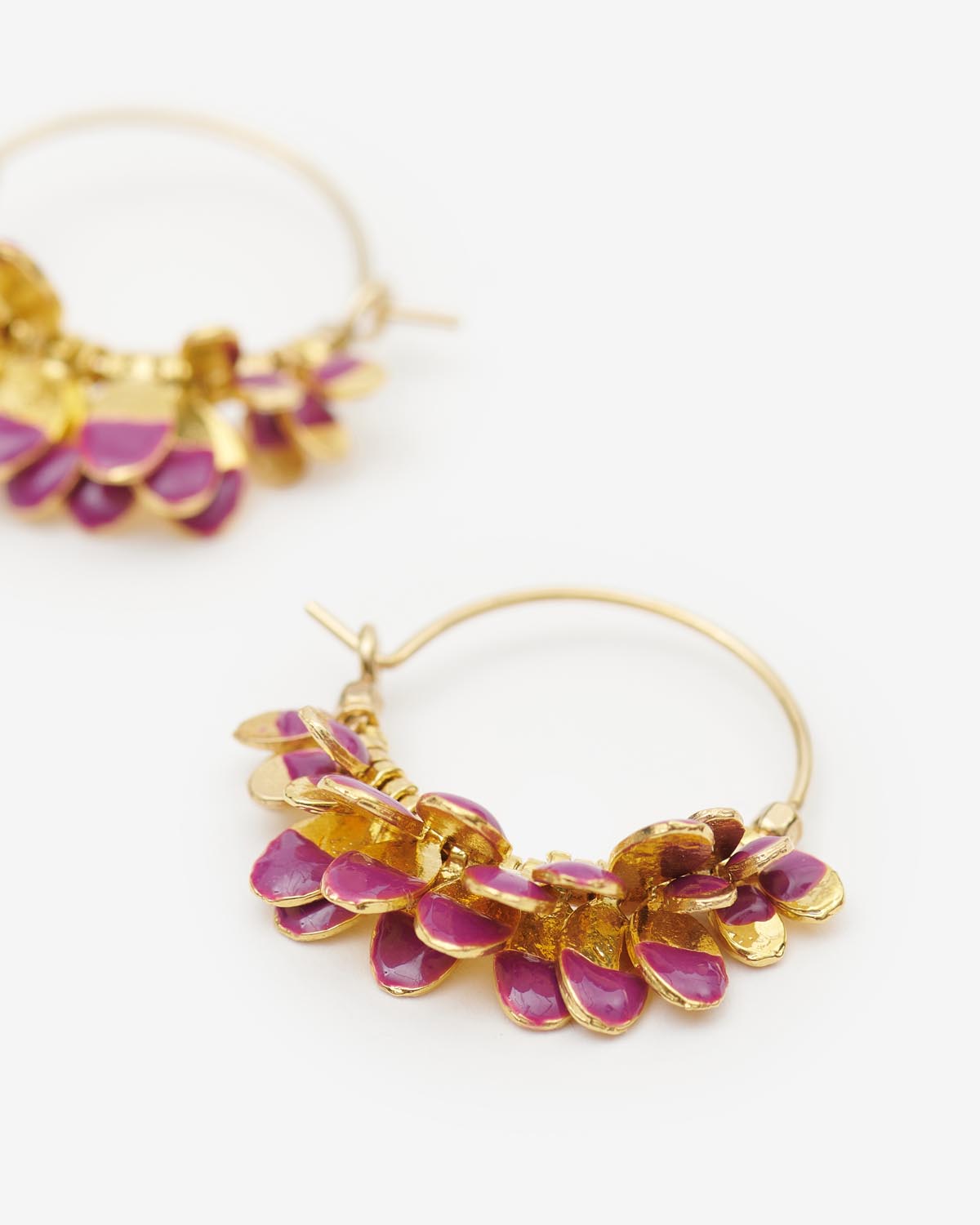 These Casablanca Earrings by Isabel Marant feature hoop earrings with semi-enameled tassels, crafted from tin and golden brass. The contrasting resin adds a playful touch, making them ideal for bohemian-inspired outfits.