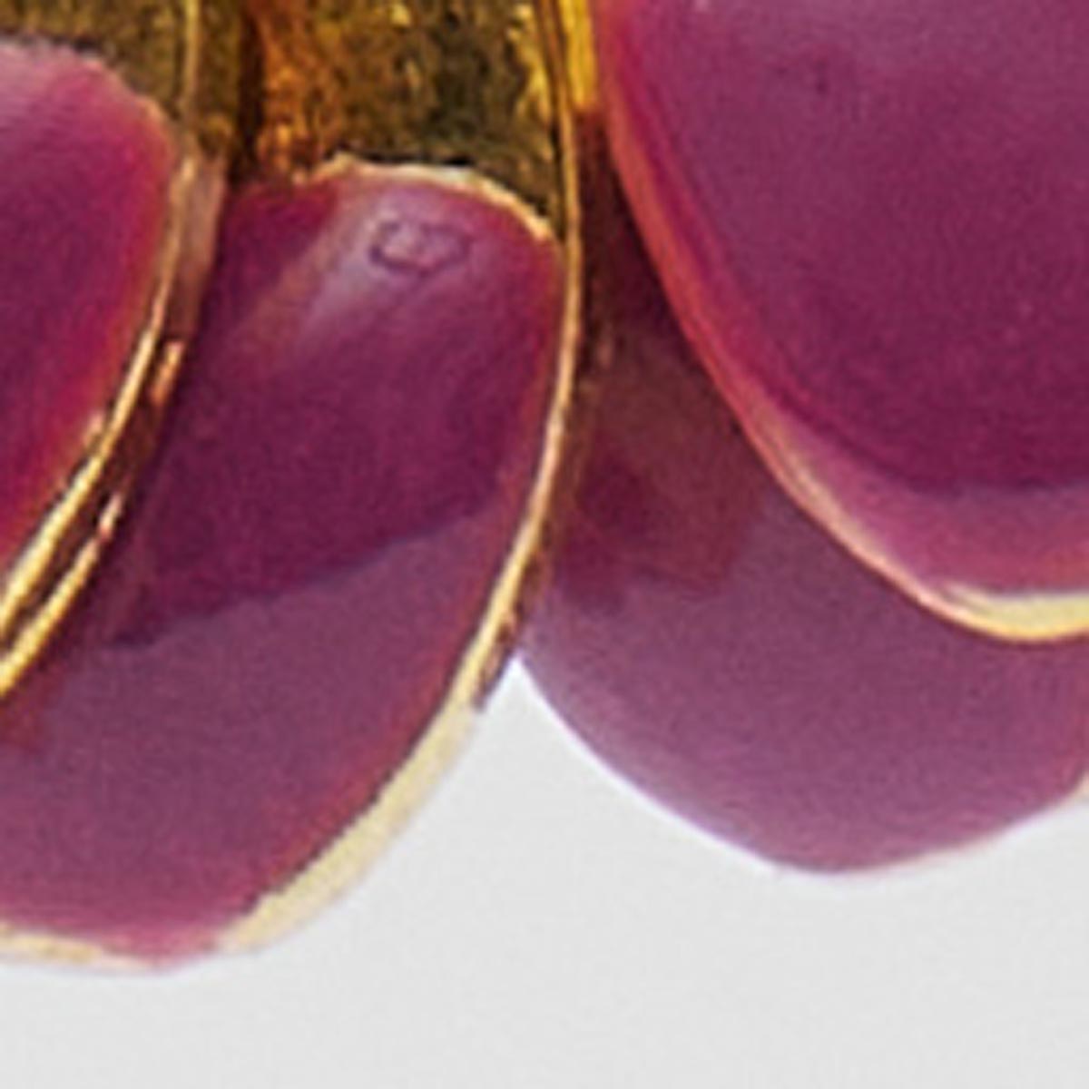 Made from tin and golden brass with semi-enameled tassels and resin. Measures 2 cm in diameter. Features a hook clasp.