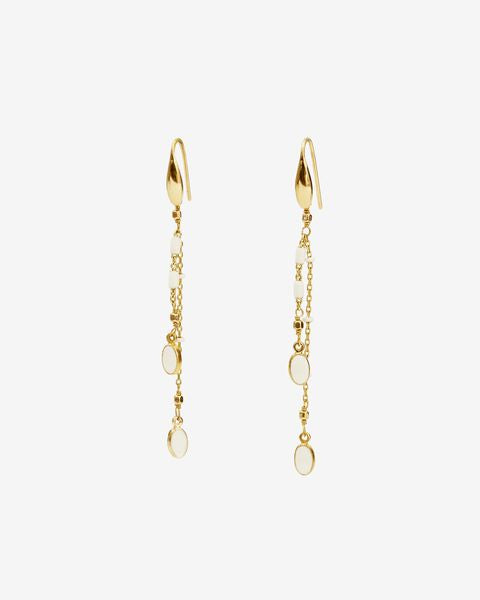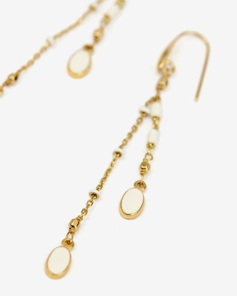 Made from tin and gold-finish brass with semi-enameled tassels and resin. Measures 6.8 cm in length. Features a hook clasp.