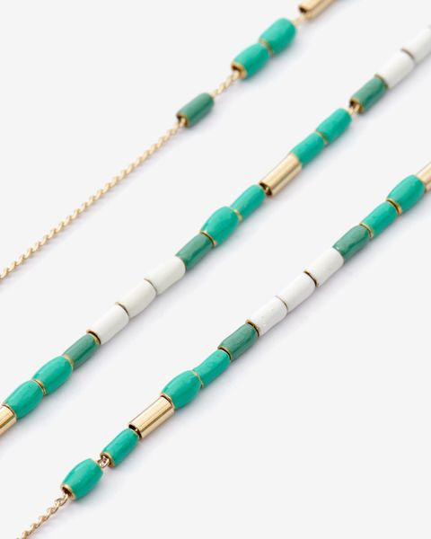 This New Color Strip Necklace by Isabel Marant features a gold-tone chain adorned with colorful stones, offering a vibrant and playful touch to any outfit. Its longer length makes it ideal for layering or wearing solo as a statement piece.